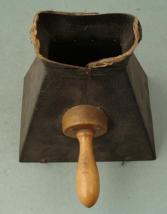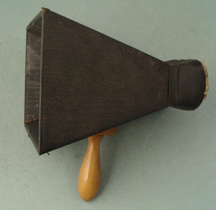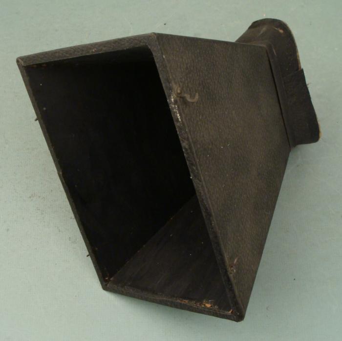 This is an antique hand-held hood for large format cameras. It dates from the very early 20th century, and has no markings of any kind. It is wood, with a wooden handle, and cardboard making up the site opening. It has a traditional black textured covering, with four hooks, and measures 6 x 8 x 8 1/2 inches. There is light wear around the edge of the viewing area, but otherwise it is in very good condition.