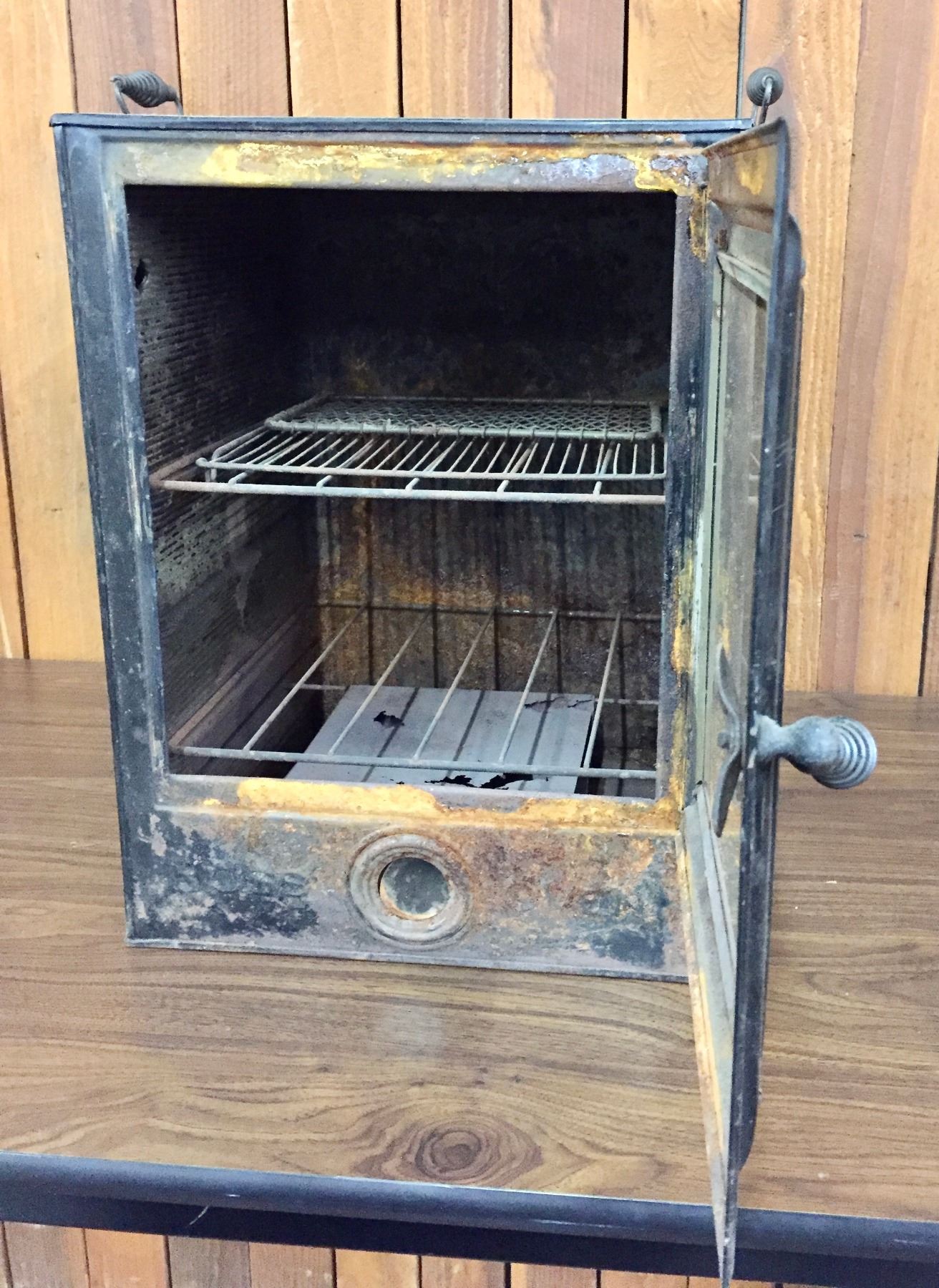 Description: Offered for sale in this lot is an antique Boss Oven for a wood burning stove. The stove is black metal. It was used upon a wood burning stove to oven bake, warm pies or bread. Heat indicator and 2 interior racks. Maker: Boss Oven.