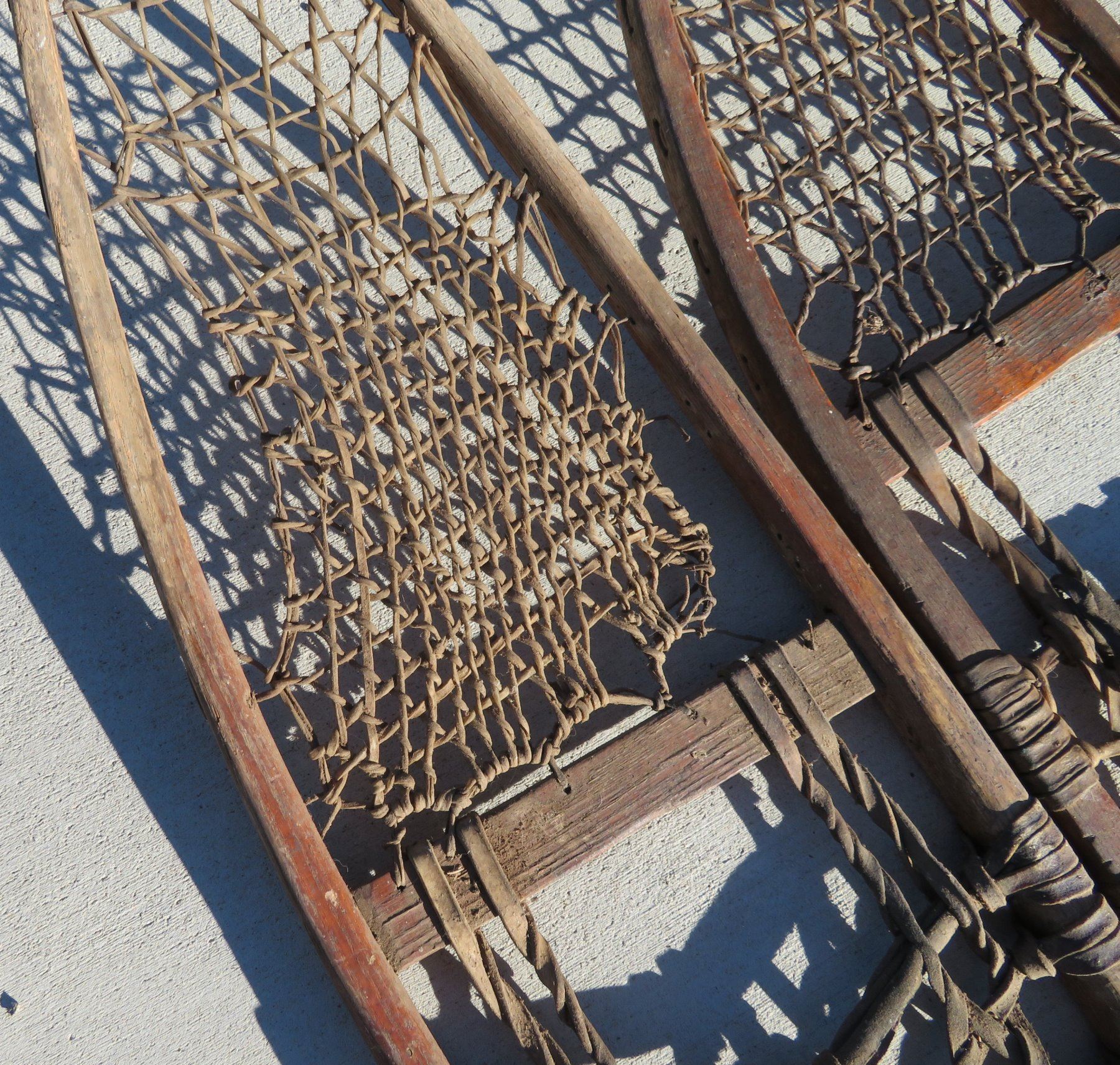 Antique Canadian Snow Shoes, c. 1900. Made of rawhide, wood and copper rivits, the item measures 58" x 10" x 1 1/2". Canada. Condition: Some use wear and minor damage, see images. Shipping: $85.00 USA estimate only, due to size and weight.