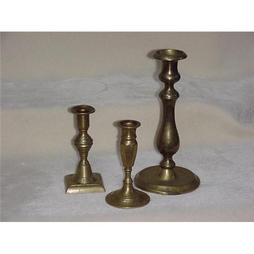 Three 19th century brass candlesticks, 5 1/4" 7 9" tall, all are in good condtion and could use a good cleaning.  They are old and will add a warm touch to your interior.