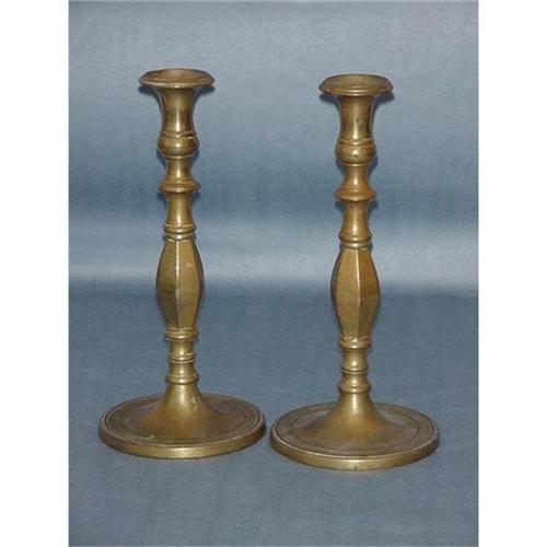 A pair of antique brass candlesticks, 11 " tall, 5" diameter base. Handsome pair and of good size. Small break in seam, shown, is the only condition problem.