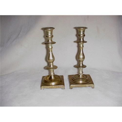 A pair of antique brass Candlesticks. 9 1/2" tall x 3 3/4" base. 2 pieces, stick screws into the base.