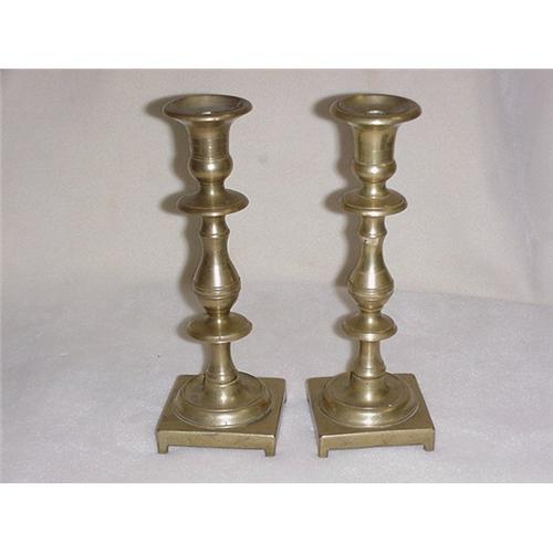 Pair of antique brass Candlesticks. 9 1/4" tall x 7" bass. Solid brass. 2 piece, stick screws into the base.