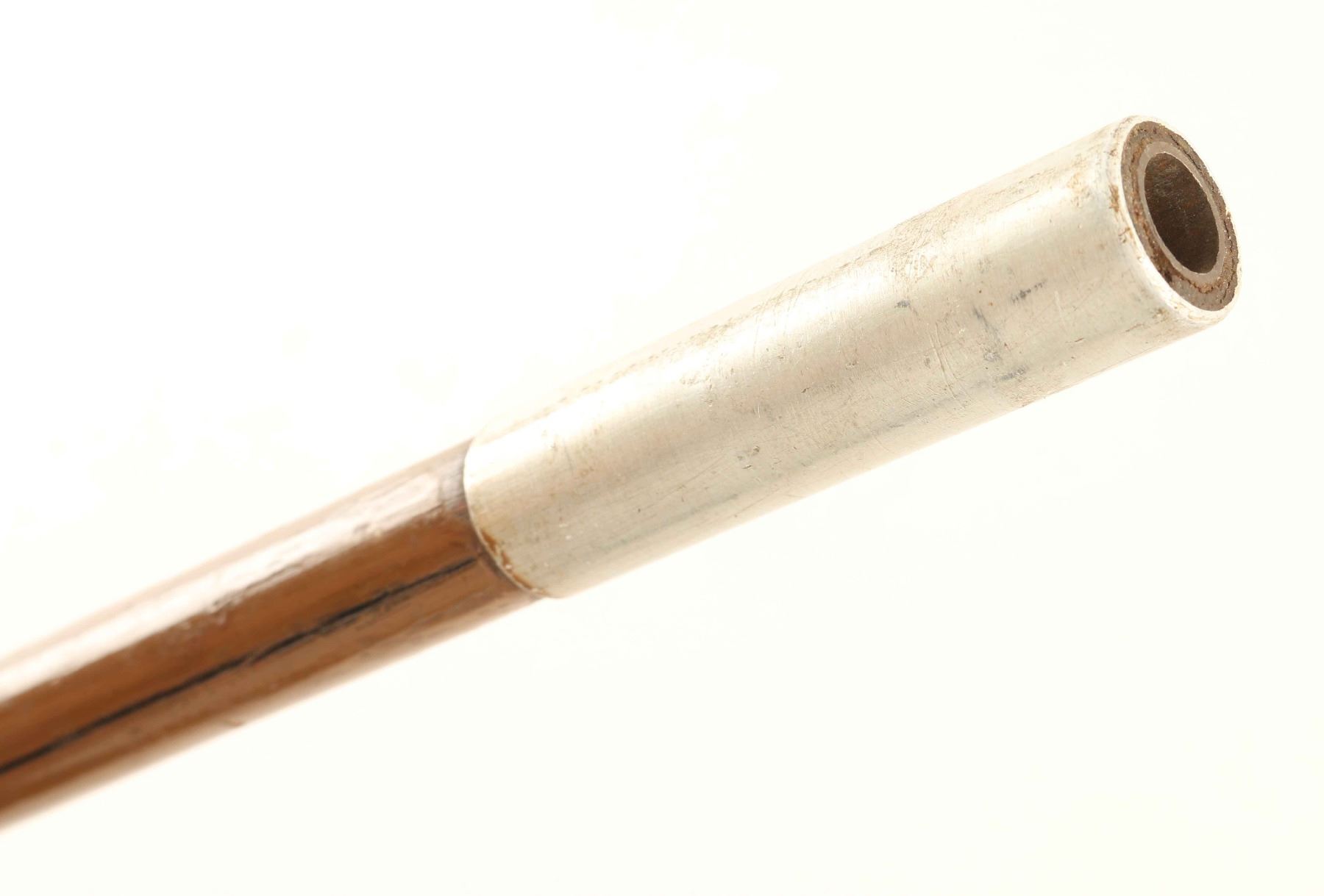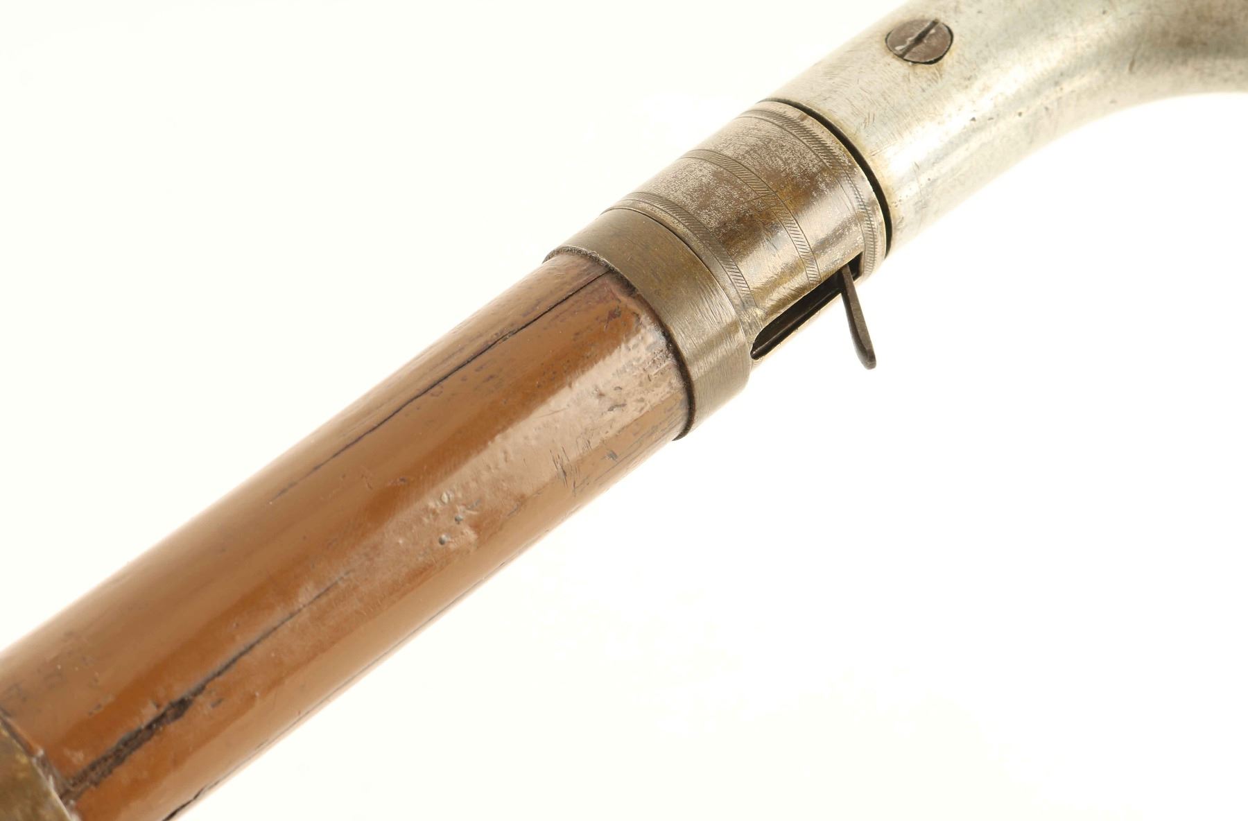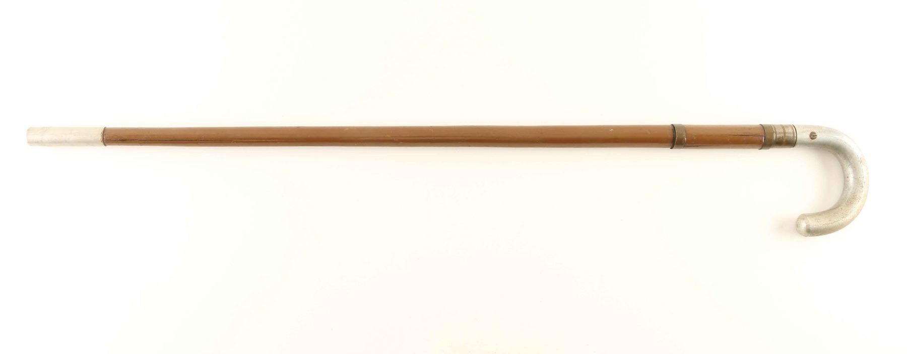 French crook style cane gun with smooth bore, chambered for an obsolete 10mm European cartridge(will not take modern ammunition.) Features steel construction with wood outer layer which has been painted brown, folding trigger, 26" barrel and aluminum handle. The action is mechanically sound, the bore shows scattered pitting and the wood displays many cracks.