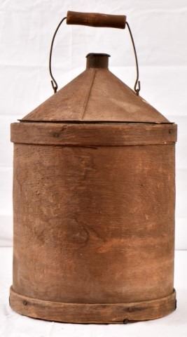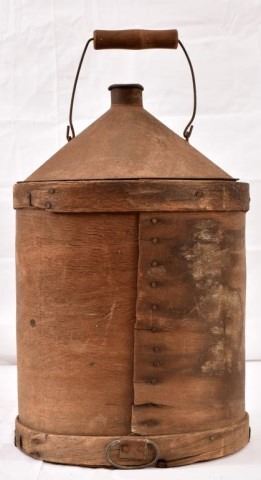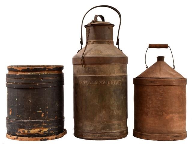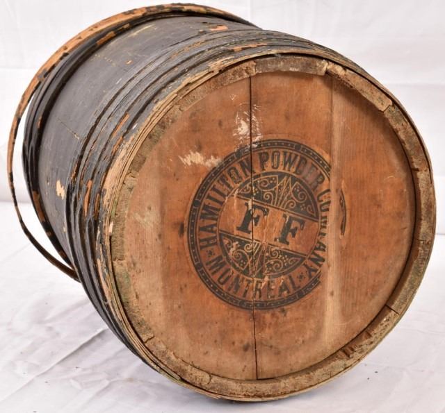 Civil War era Geo D. Ellis & Sons 5 gallon water container, Hamilton Powder Company powder keg, 2 gallon water container with wood frame outer.
