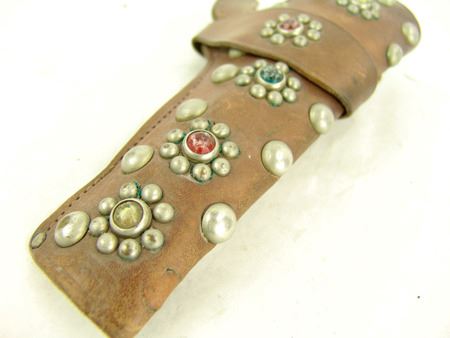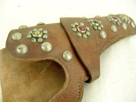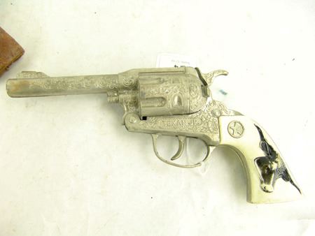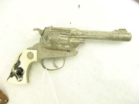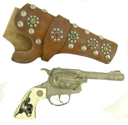 Ca. 1940s, Early "Texan Jr" western revolver with faux bone grips and great holster adorned with German silver conchos. Good condition. 9-1/2"