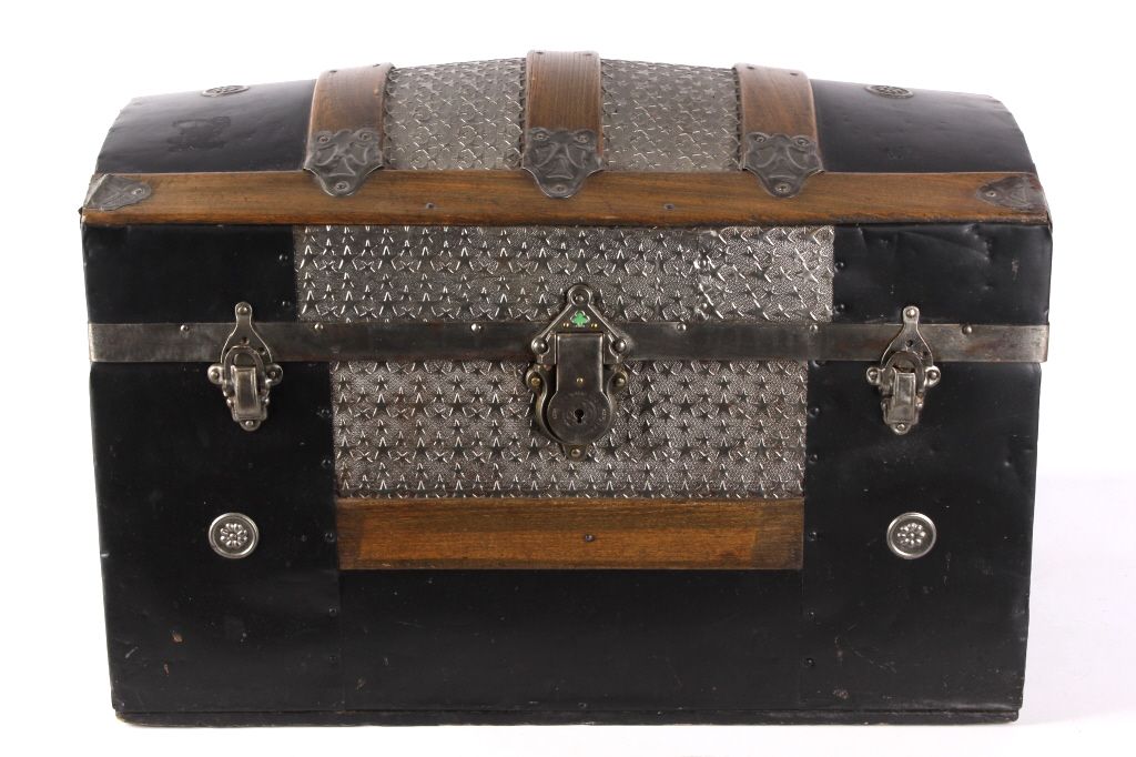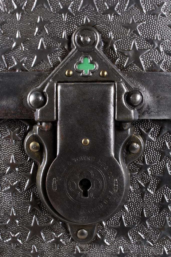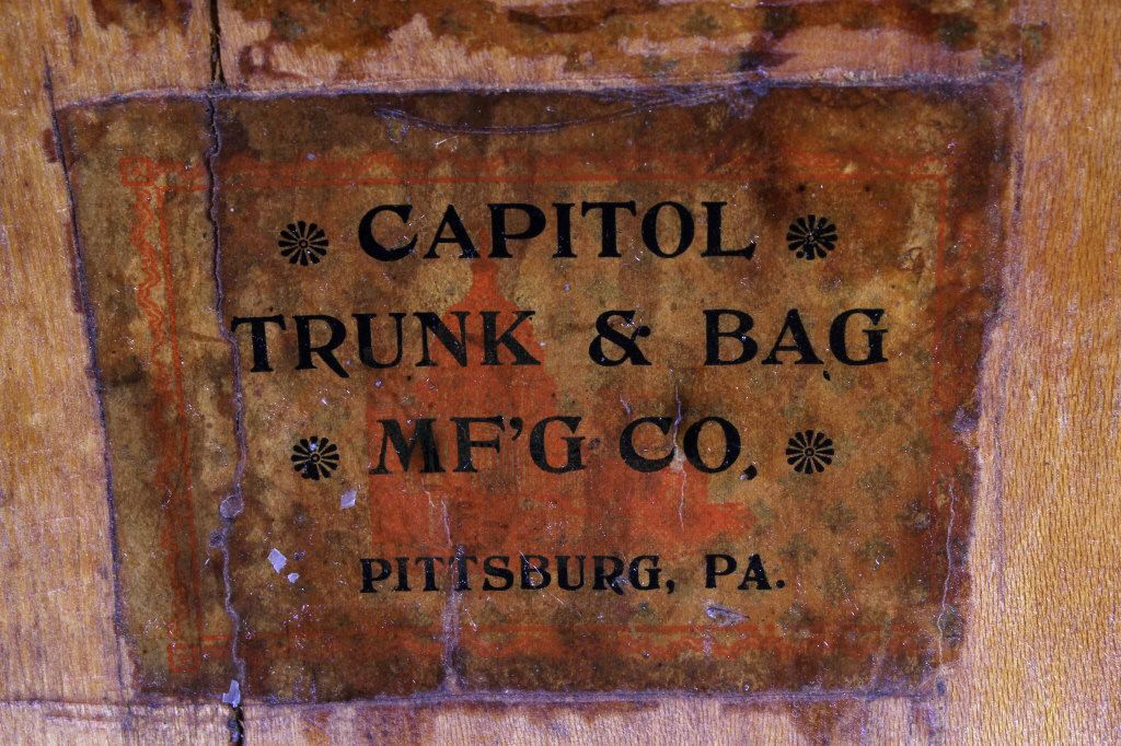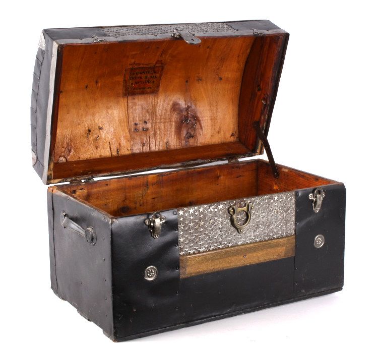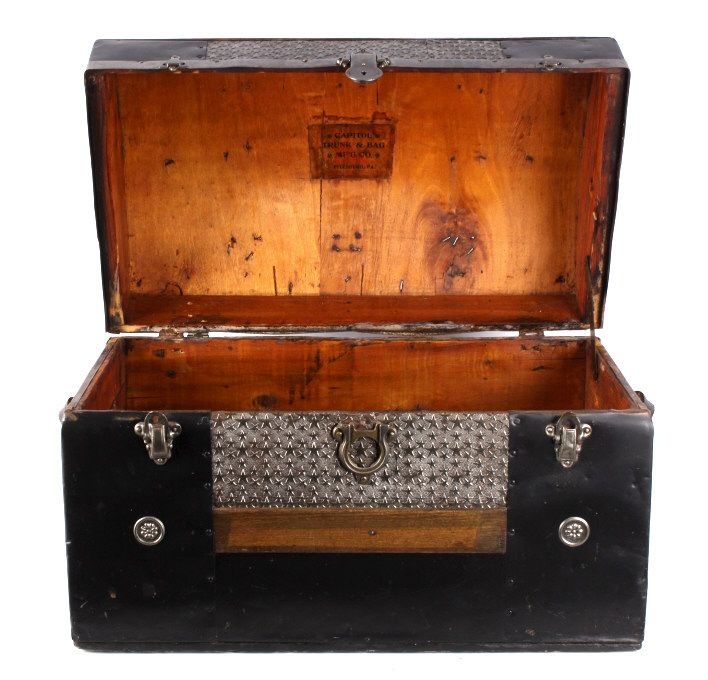 This is an antique humpback children's trunk in good condition. The trunk has an attractive punched metal star design background and wood ribbed construction. Made by Capital Trunk and Bag Mfg. Co. Pittsburg, Pa. Measures 26"x15.5"x19"