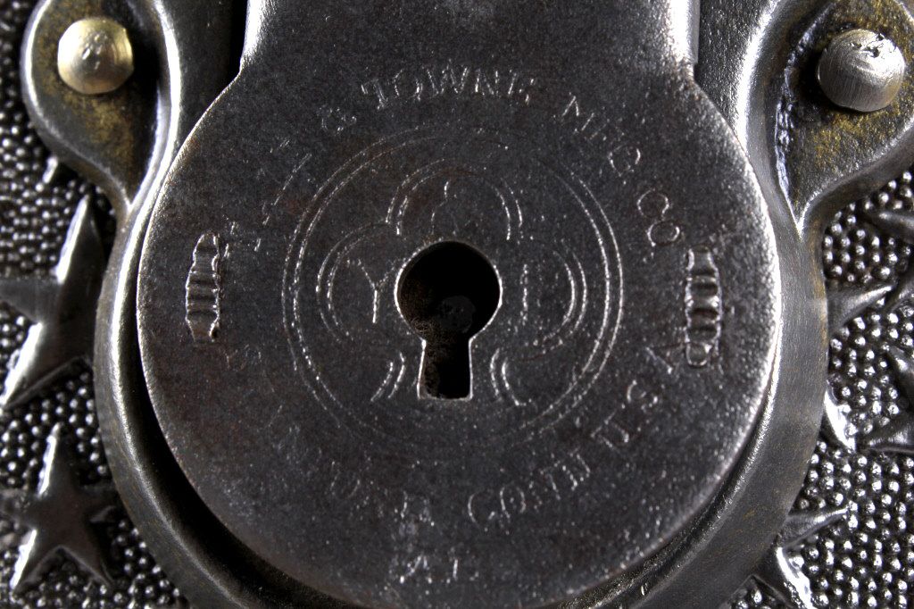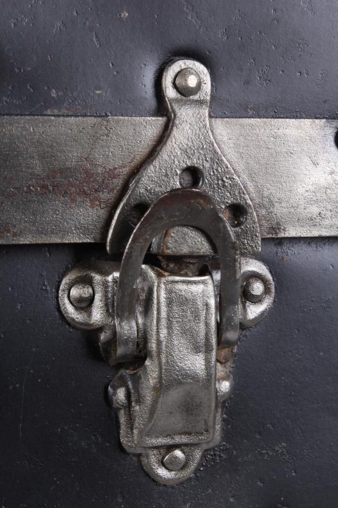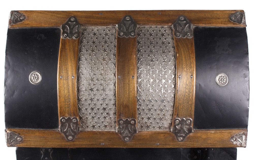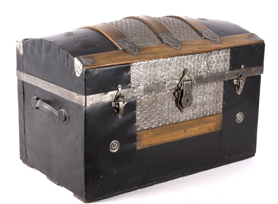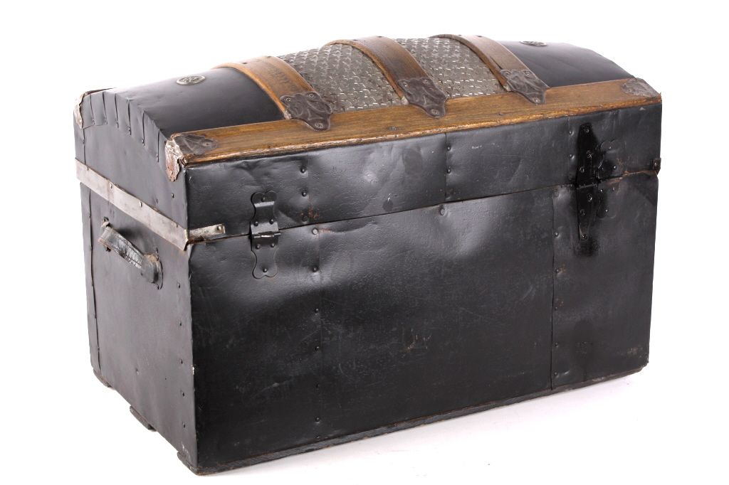 This is an antique humpback children's trunk in good condition. The trunk has an attractive punched metal star design background and wood ribbed construction. Made by Capital Trunk and Bag Mfg. Co. Pittsburg, Pa. Measures 26"x15.5"x19"