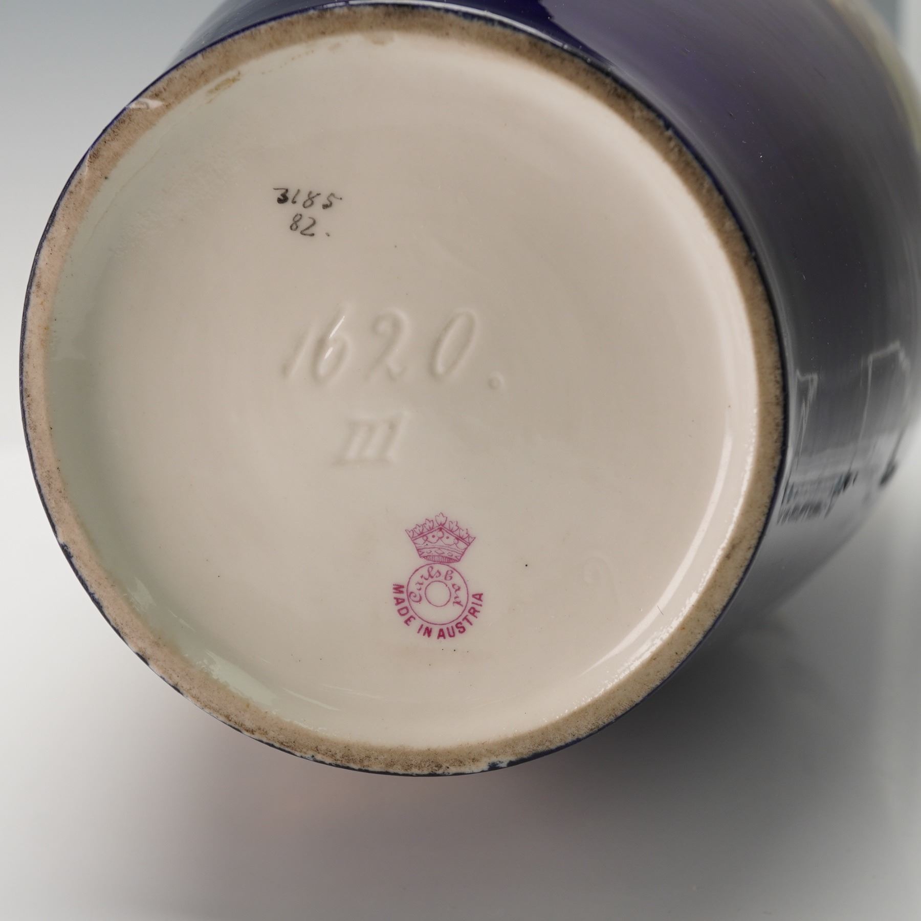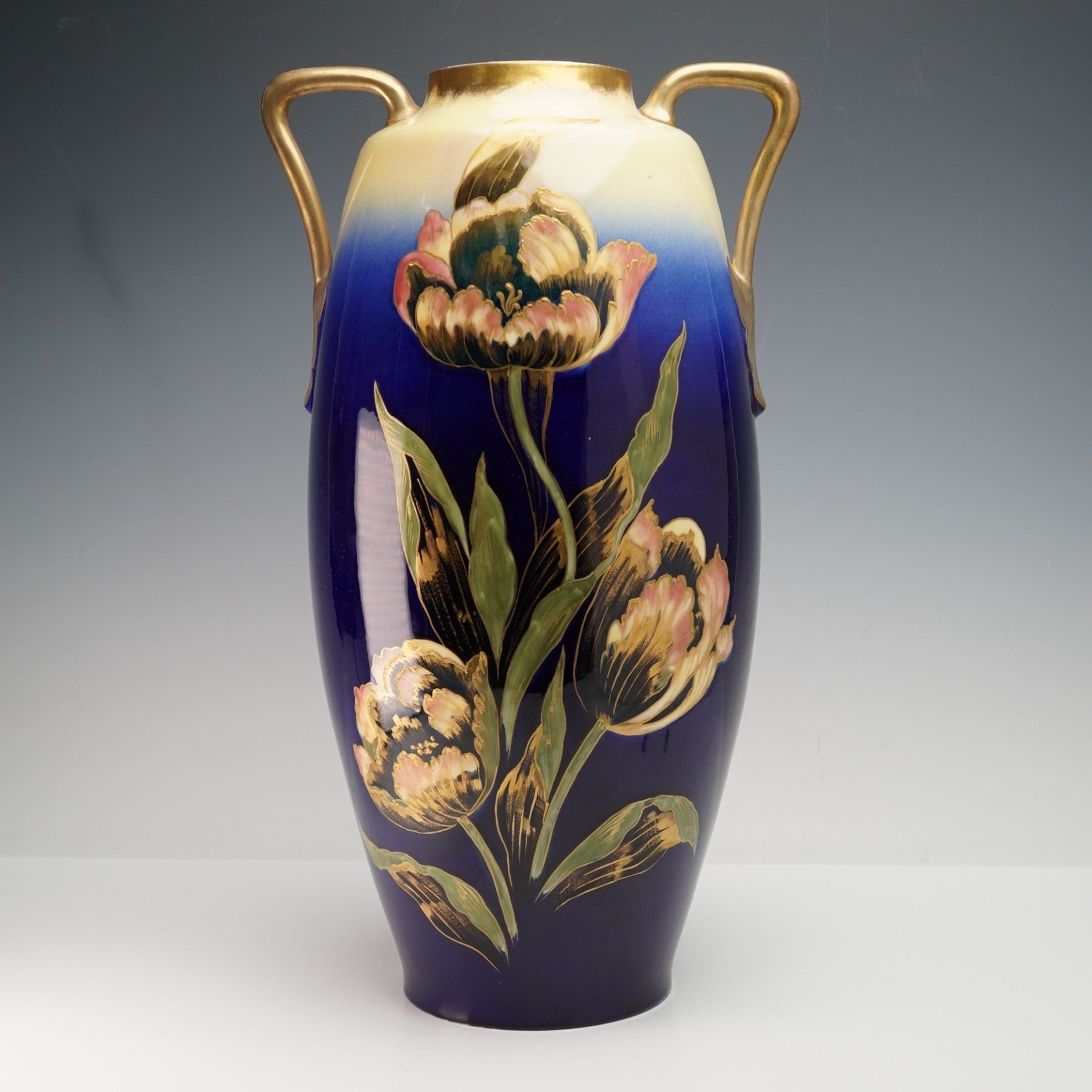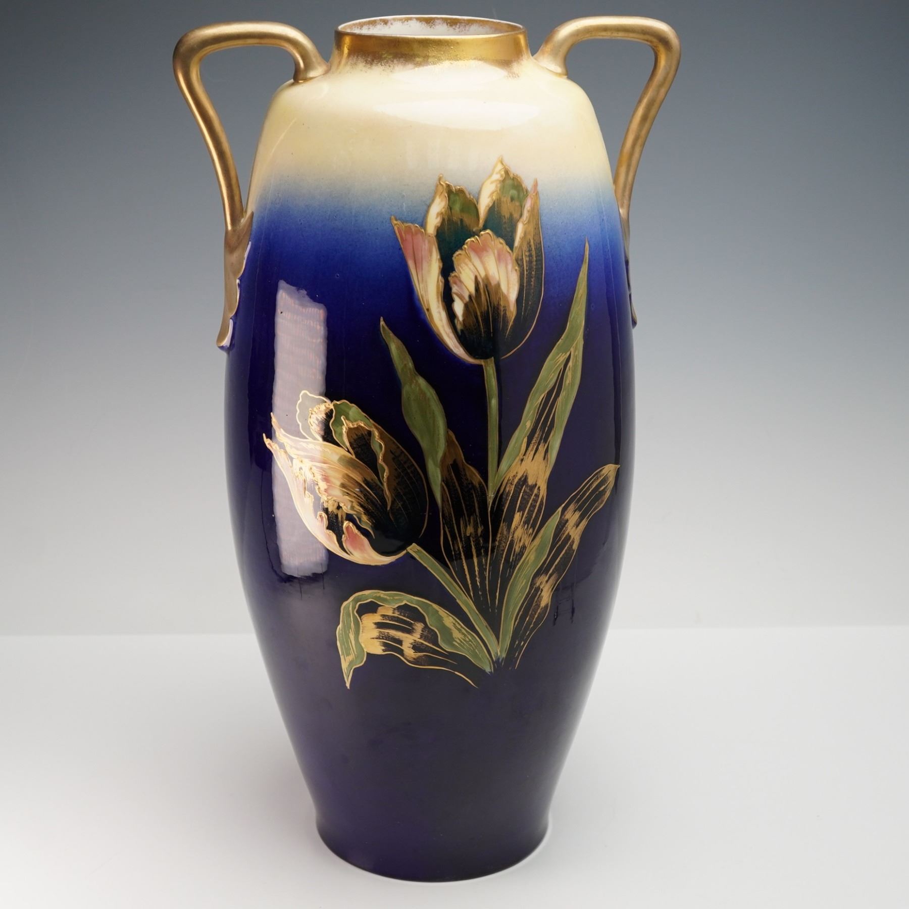 Features beautifully hand-painted parrot tulips set against a rich cobalt blue field. The design is enhanced with gold accents and two graceful handles. Marked with the Carlsbad maker's mark and Made in Austria.