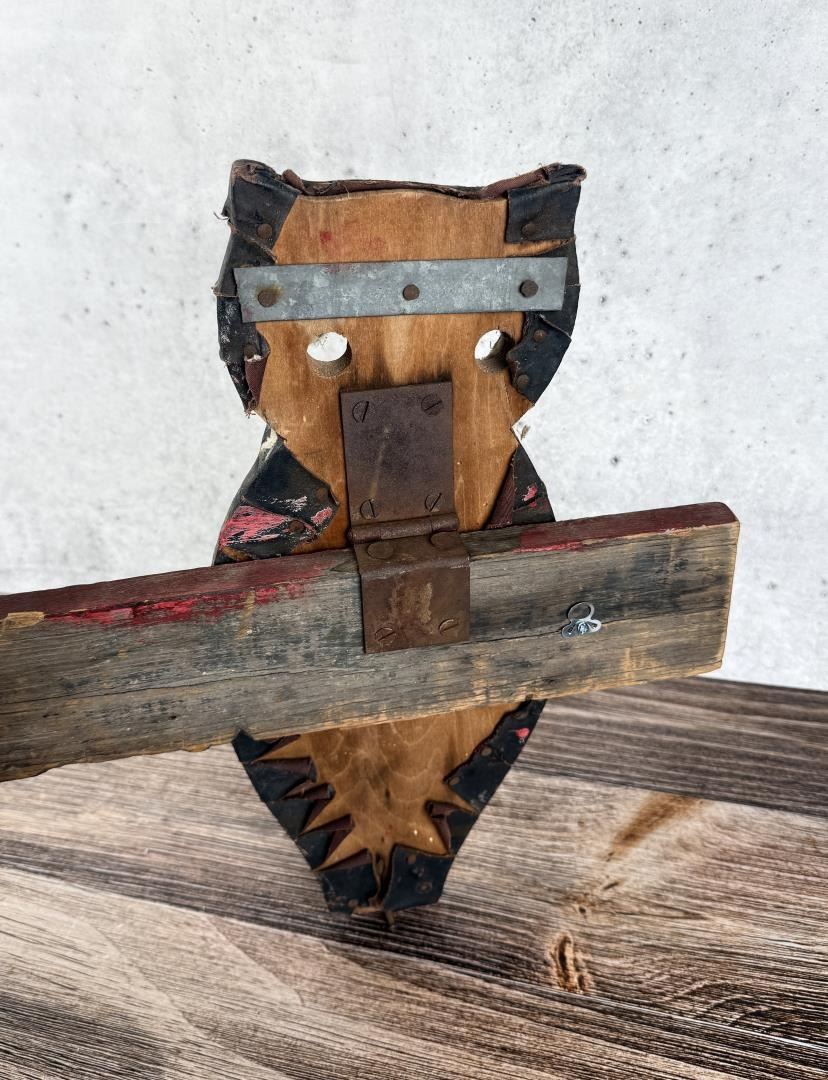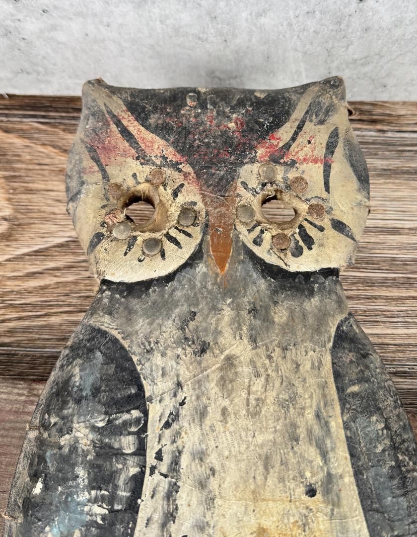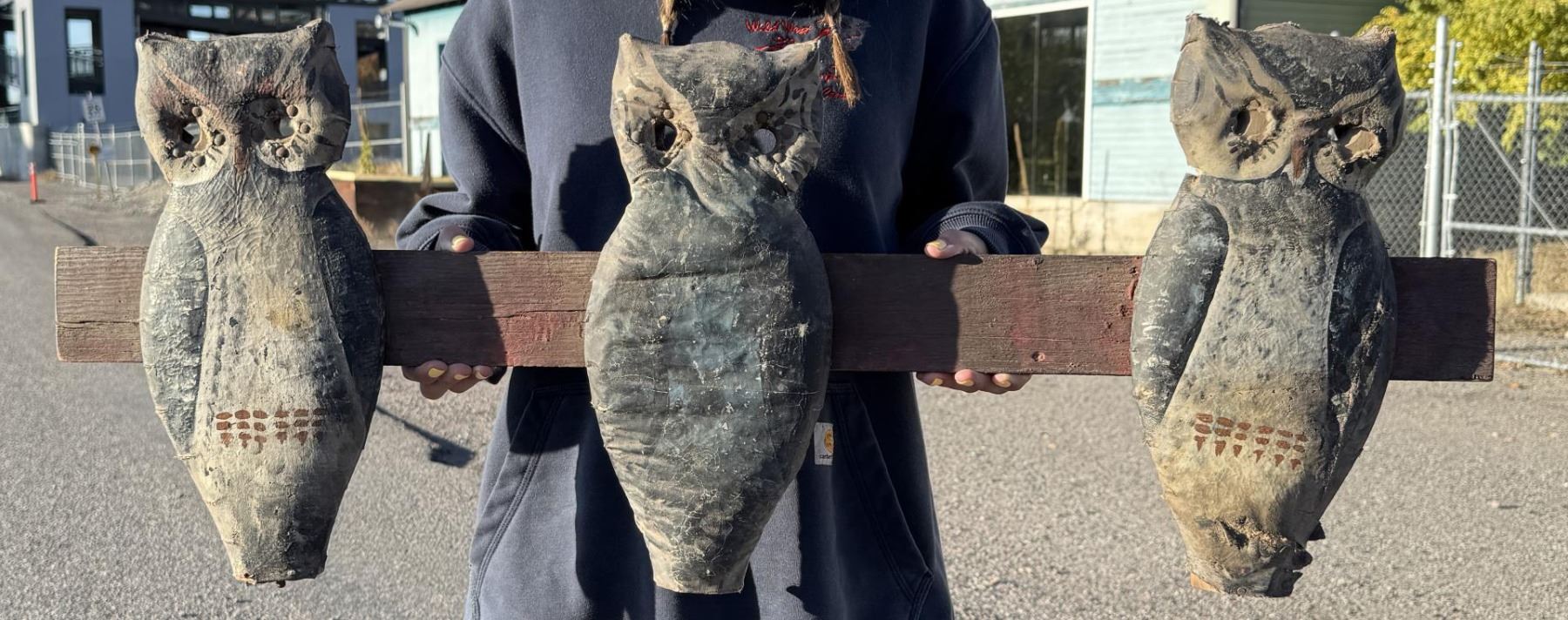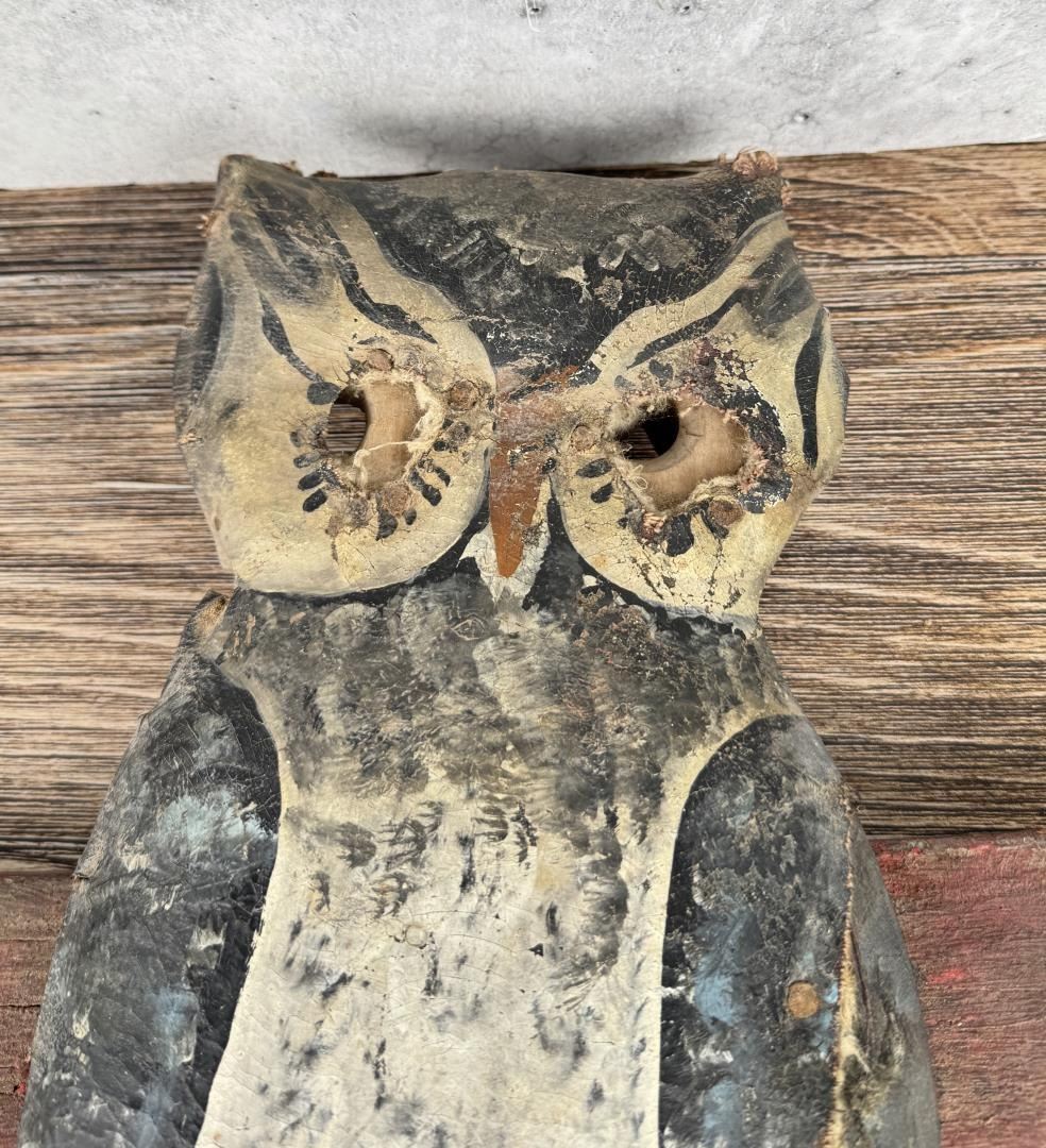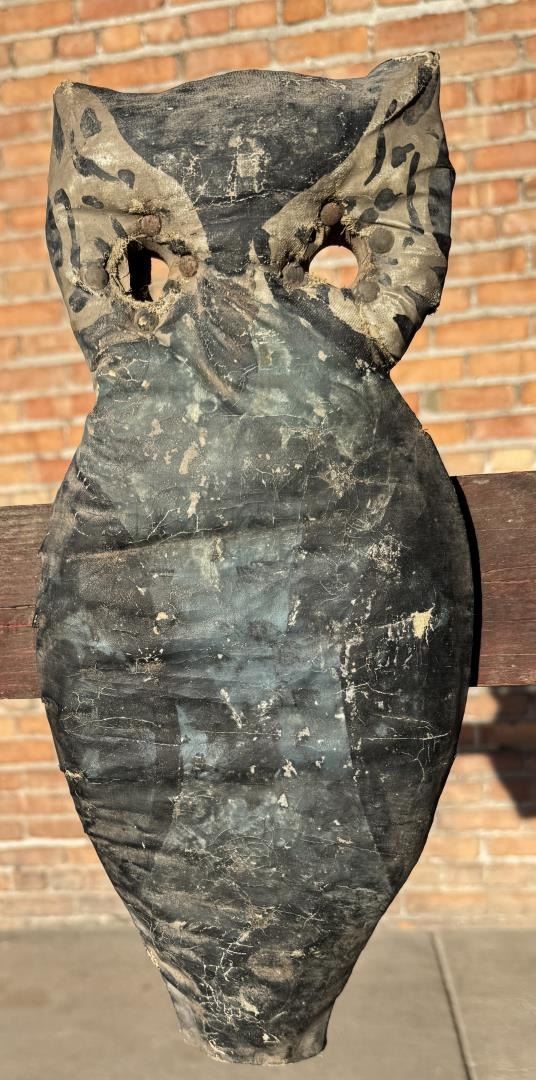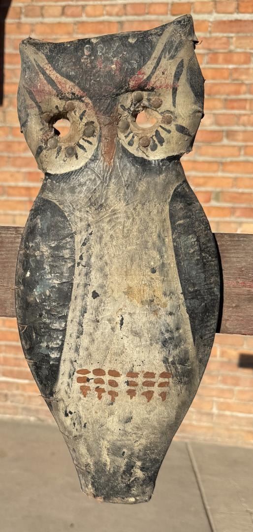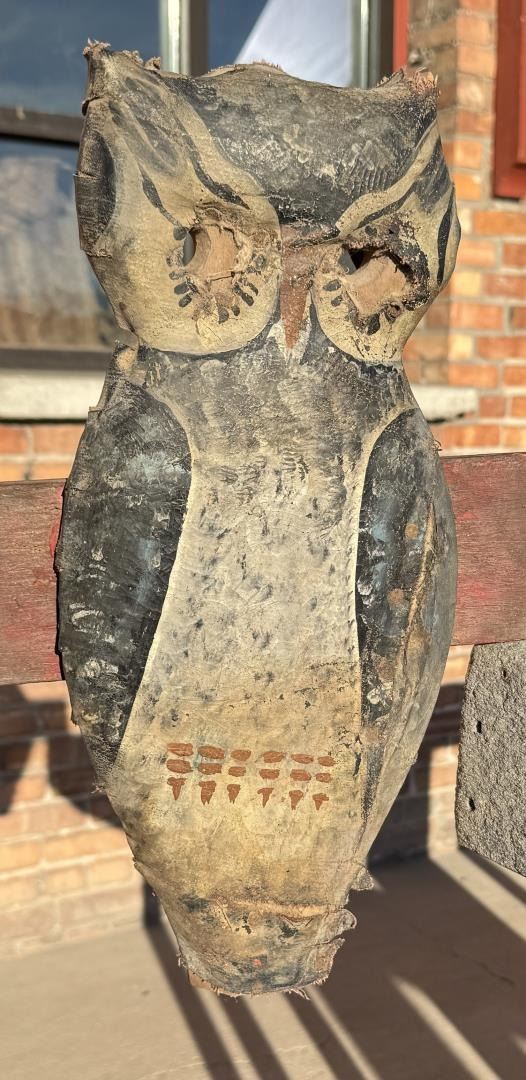 Three owls on rack. Probably from a Cork Gun Gallery as the owls are wood covered in cloth. Rack is 41" long, owls are 16" tall.