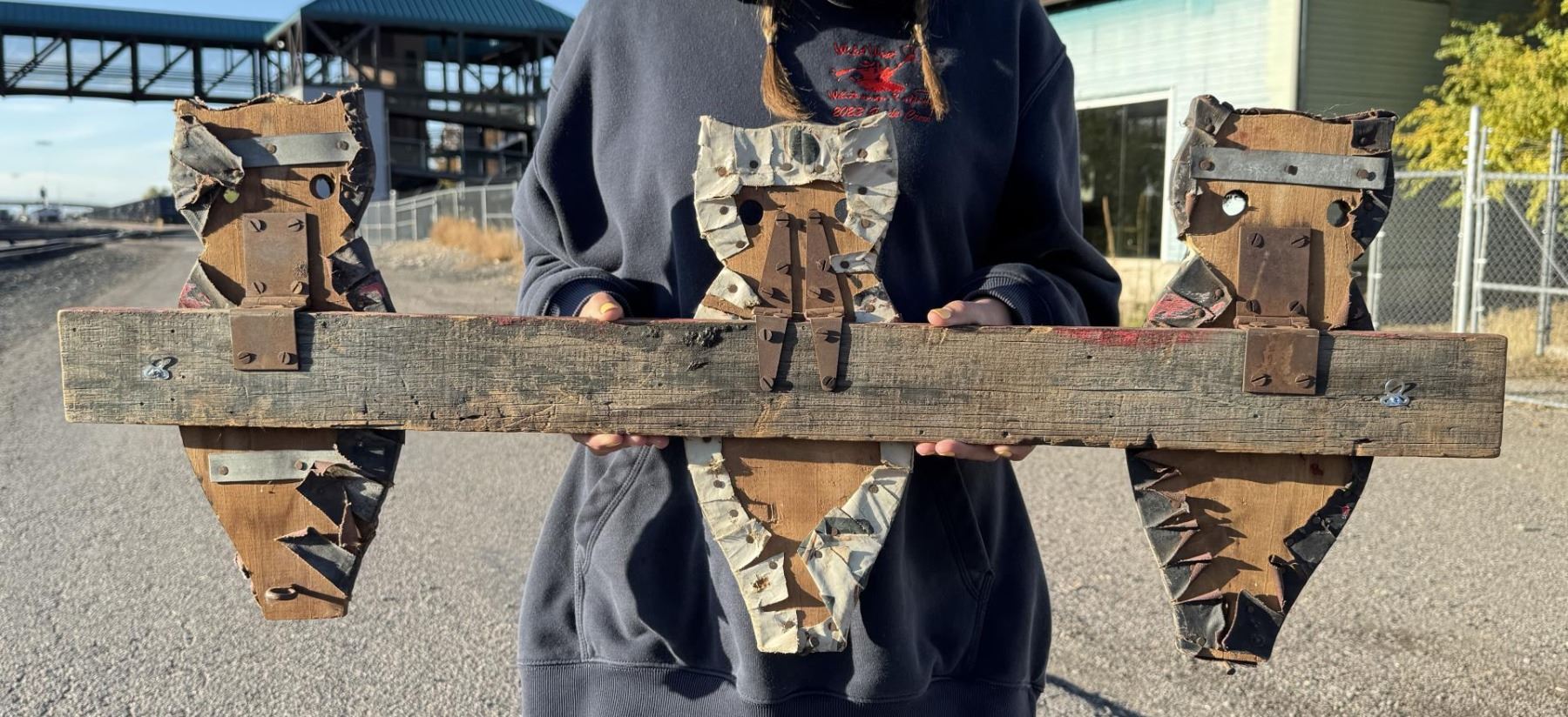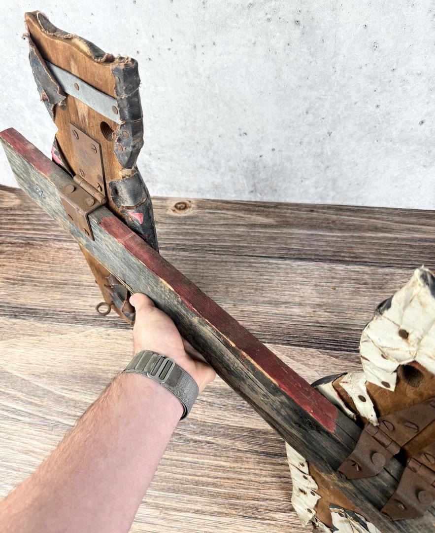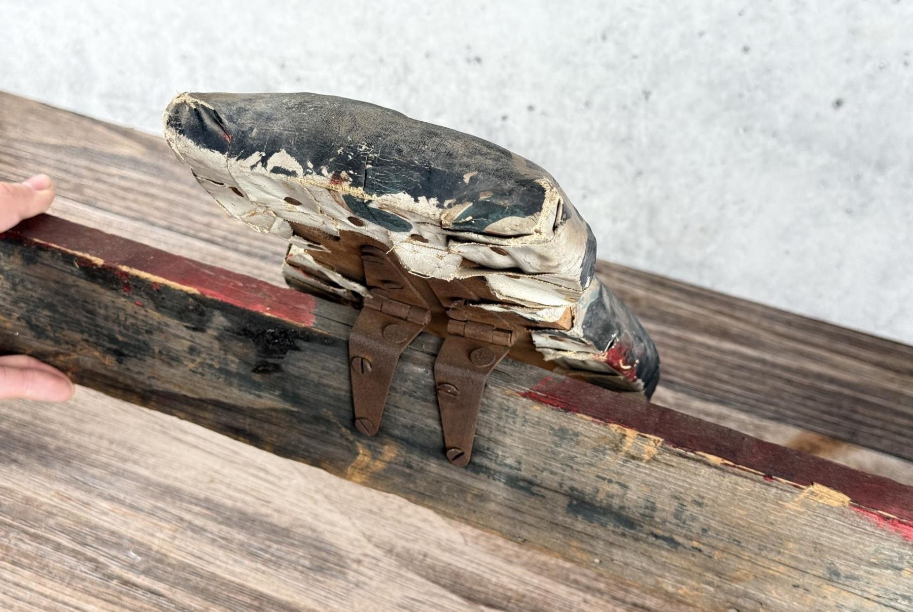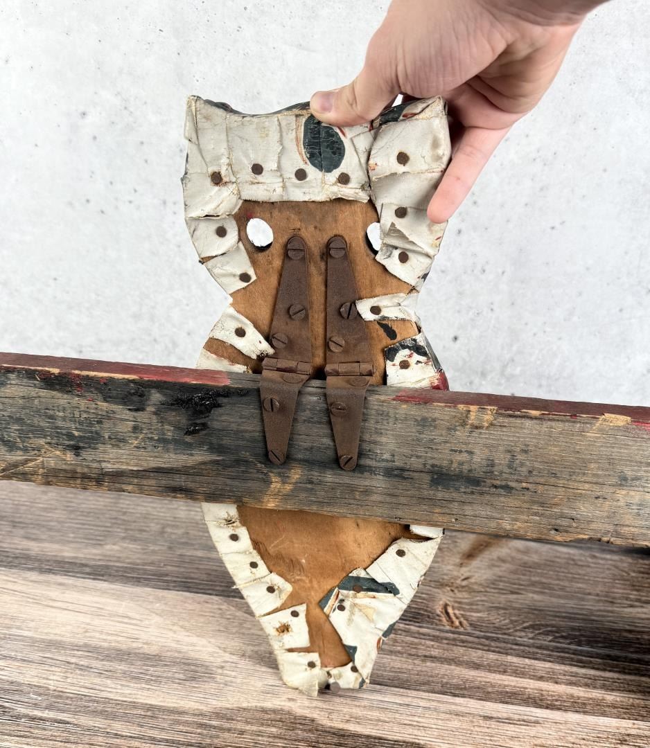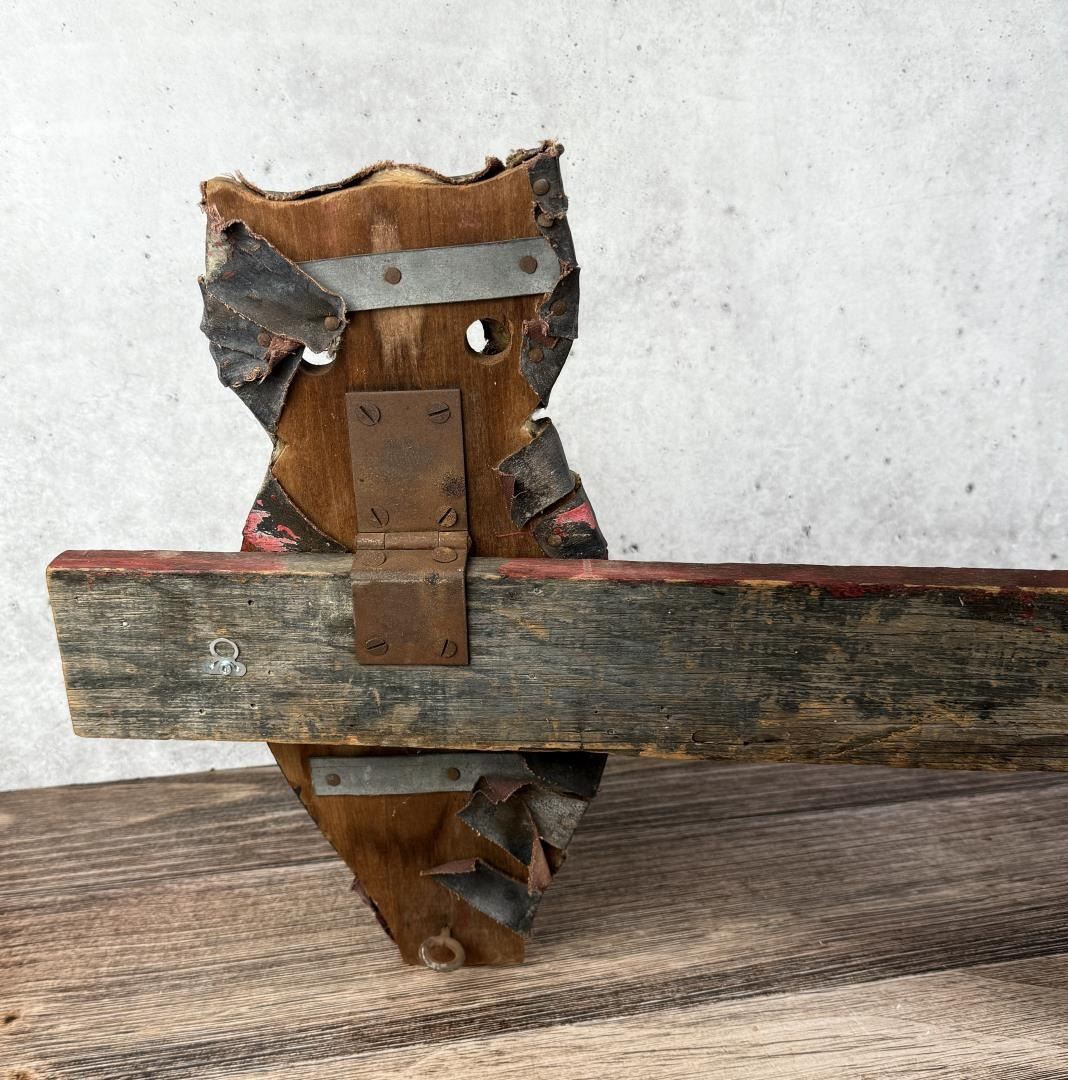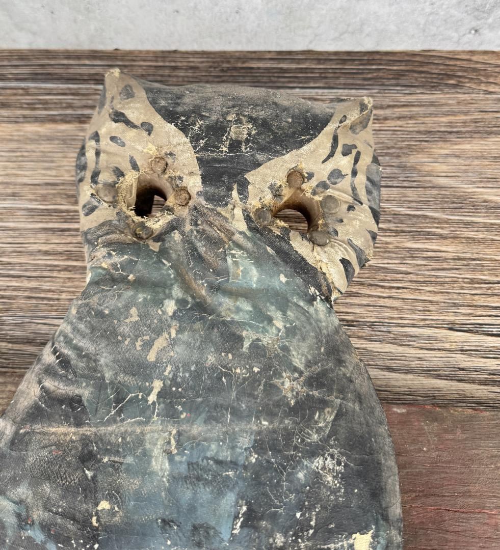 Three owls on rack. Probably from a Cork Gun Gallery as the owls are wood covered in cloth. Rack is 41" long, owls are 16" tall.
