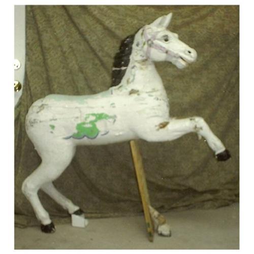 Late 1800's Antique Carousel Prancer. Made of hand carved wood. European in design, either French or German.<p>In need of restoration. A do-it-yourself project. Layers of old paint and jesso need to be removed.<p>Horses are complete. No missing parts, expect for the horsehair tail.<p>Original glass eyes. Original stirrup holders. Original metal support plate under front legs.<p>These horses have good all-over conformation. Sweet face, pointed ears, pronounced cheeks, mane and forelock carved to one side. Under the layers of paint and jesso is a hand carved decorative saddle. I cannot tell if there is a breast collar. Originally had a horsehair tail. Metal banding from other repairs. Now painted with decorative flowers.<p>Measurements for horse are 49" total length, 52" tall, 11" wide.<p>$1,400 for horse. Price does not include shipping.<p>For an addition charge, we can provide you with a real horsehair.