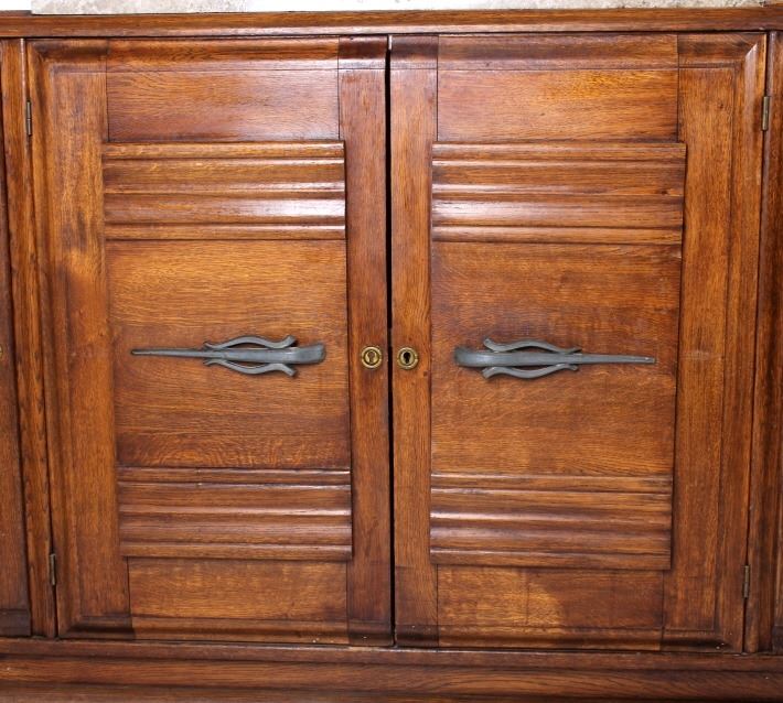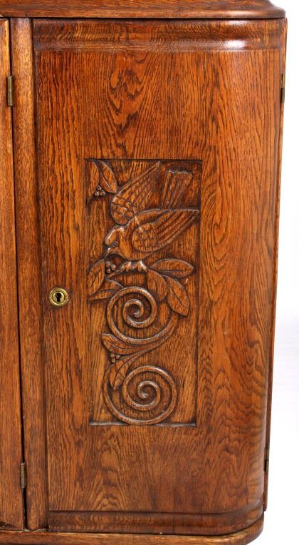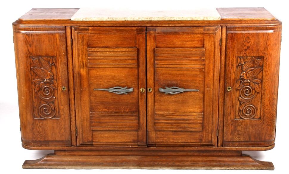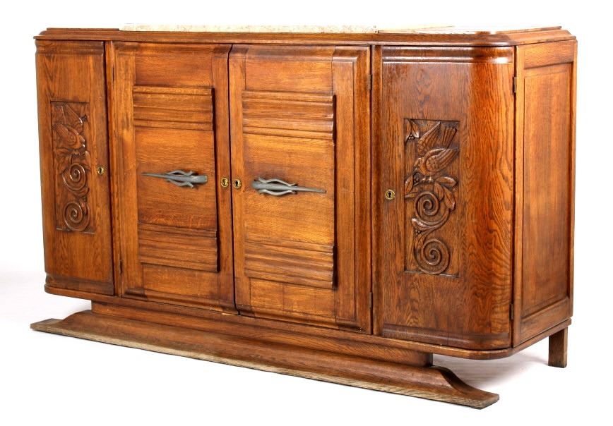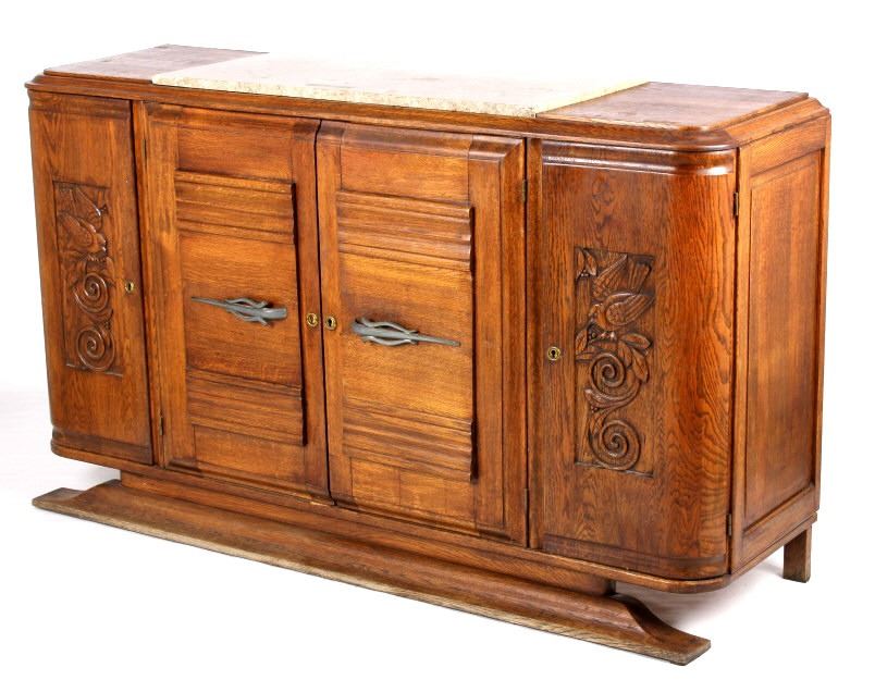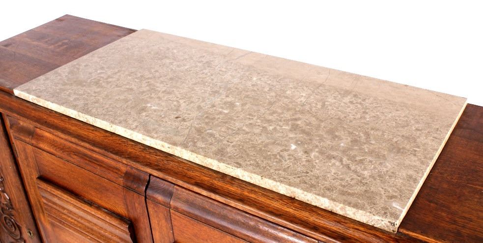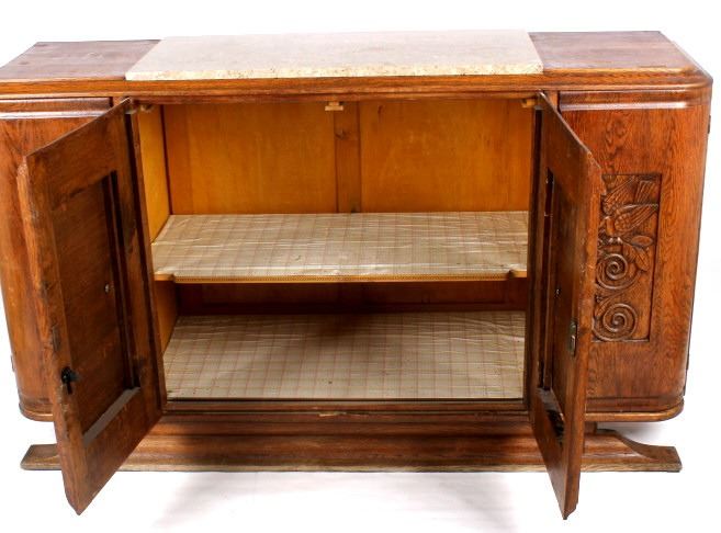 Featured on this lot we have a beautiful and elegant antique sideboard buffet cabinet. The buffet is constructed of oak with gray and tan top sheet marble. Featuring extravagant hand carved patterns of a bird and branches, as well as raised panel styling on the main door. Each side door is elegantly curved and feature turn key entries. The main doors feature unique metal door handles. The cabinet has two levels of storage when main doors are opened. This buffet measures 67" W x 39" T x 20" D. All around, the piece is in good aesthetic condition.