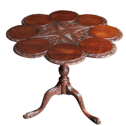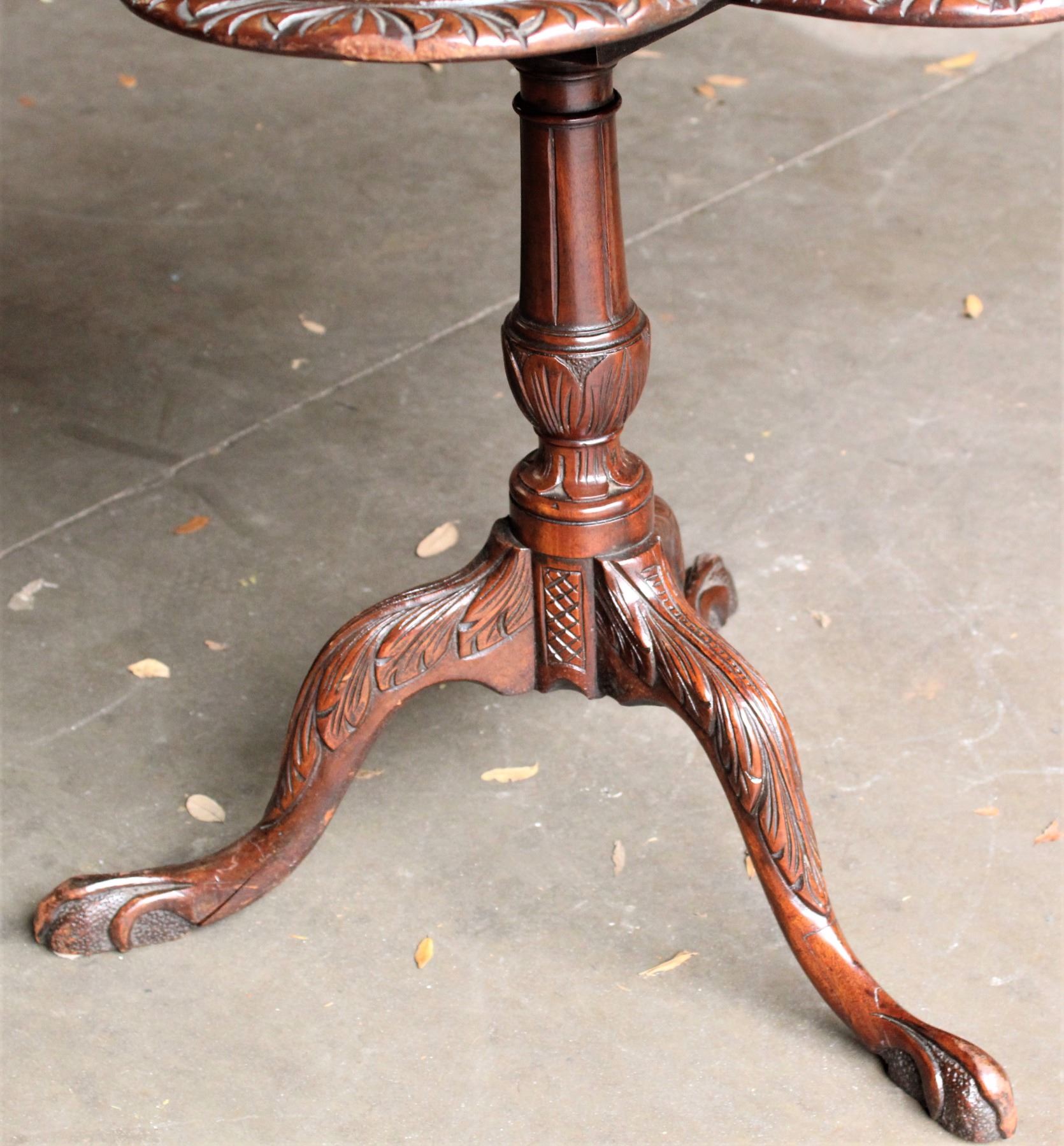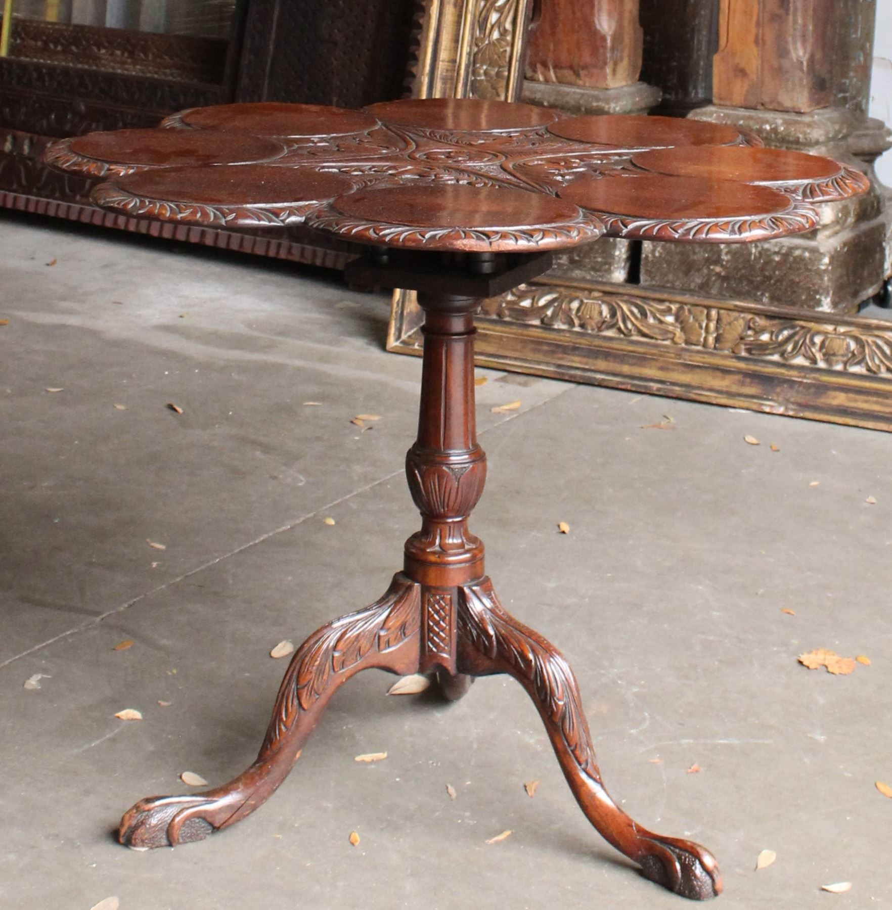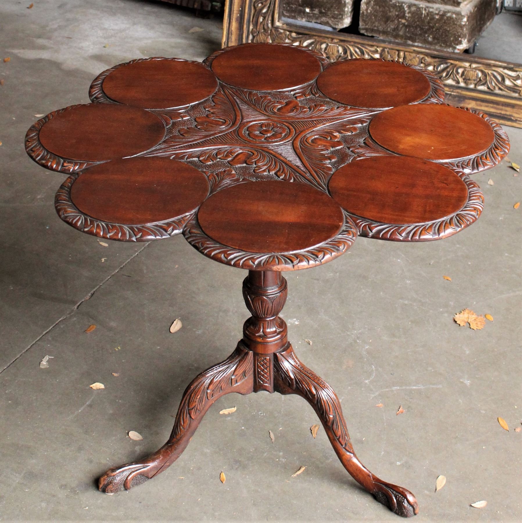 Elaborately carved tripod table with scalloped top.