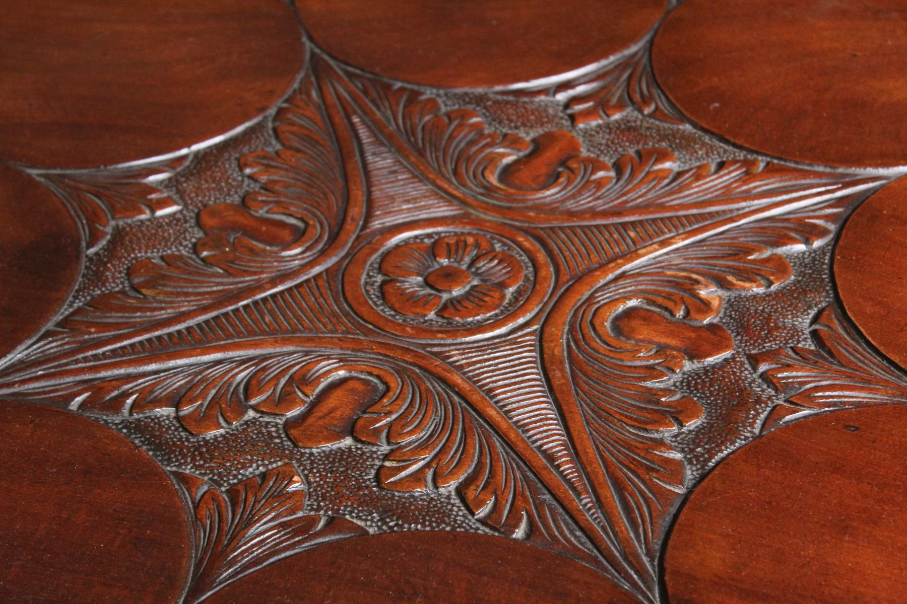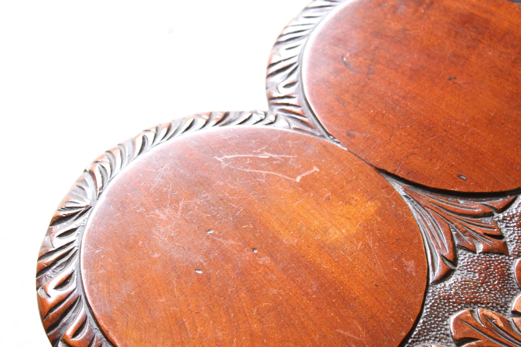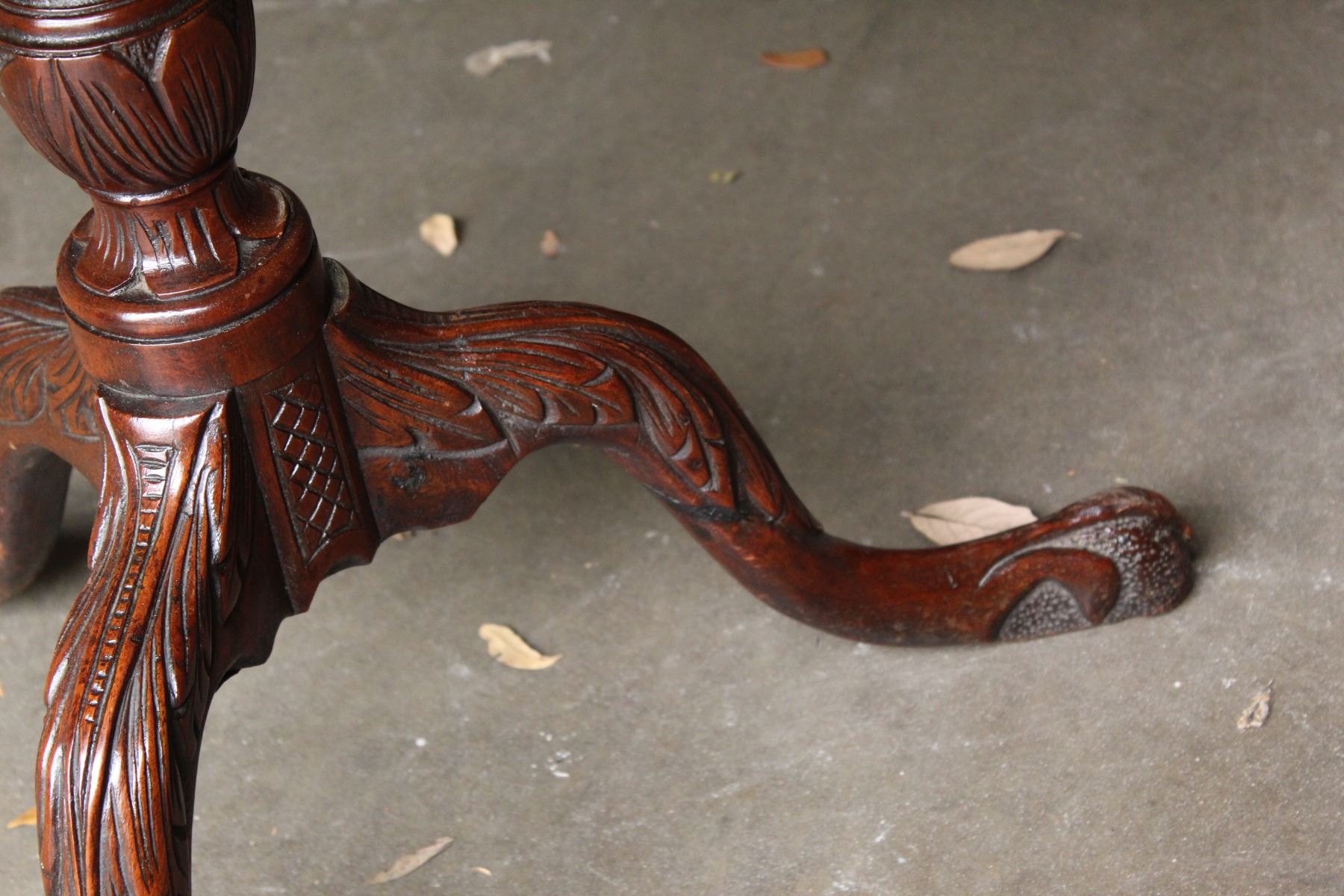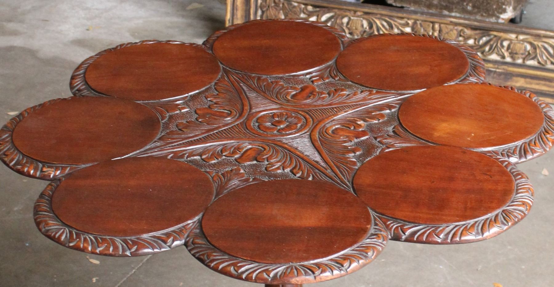 Elaborately carved tripod table with scalloped top.