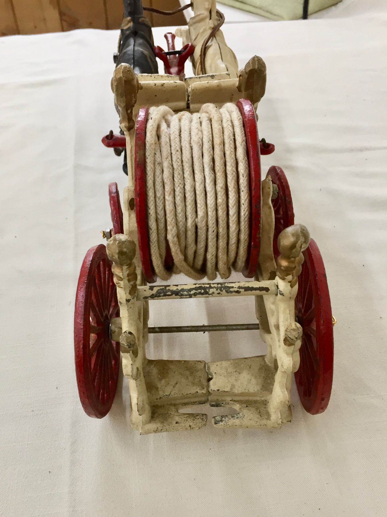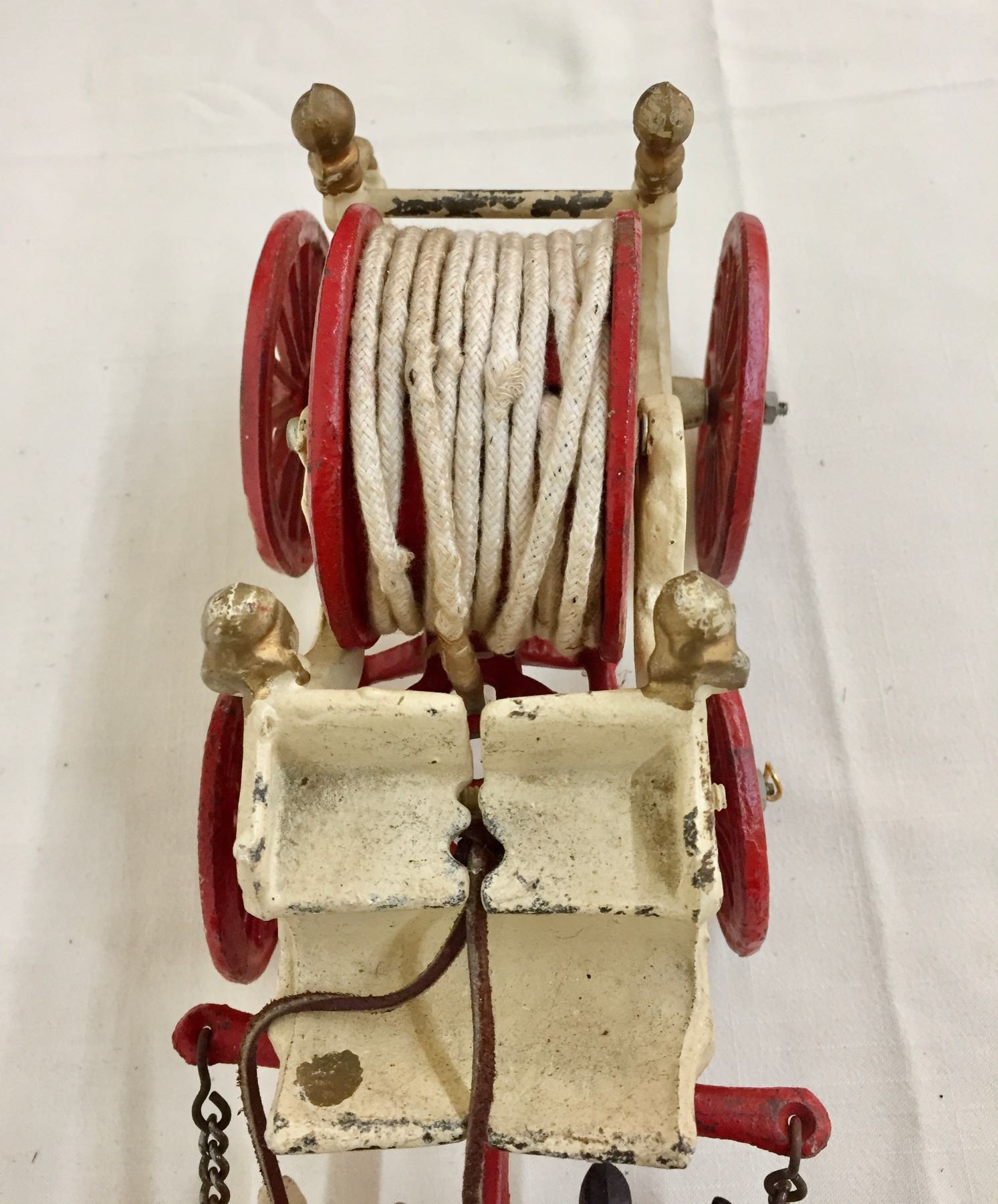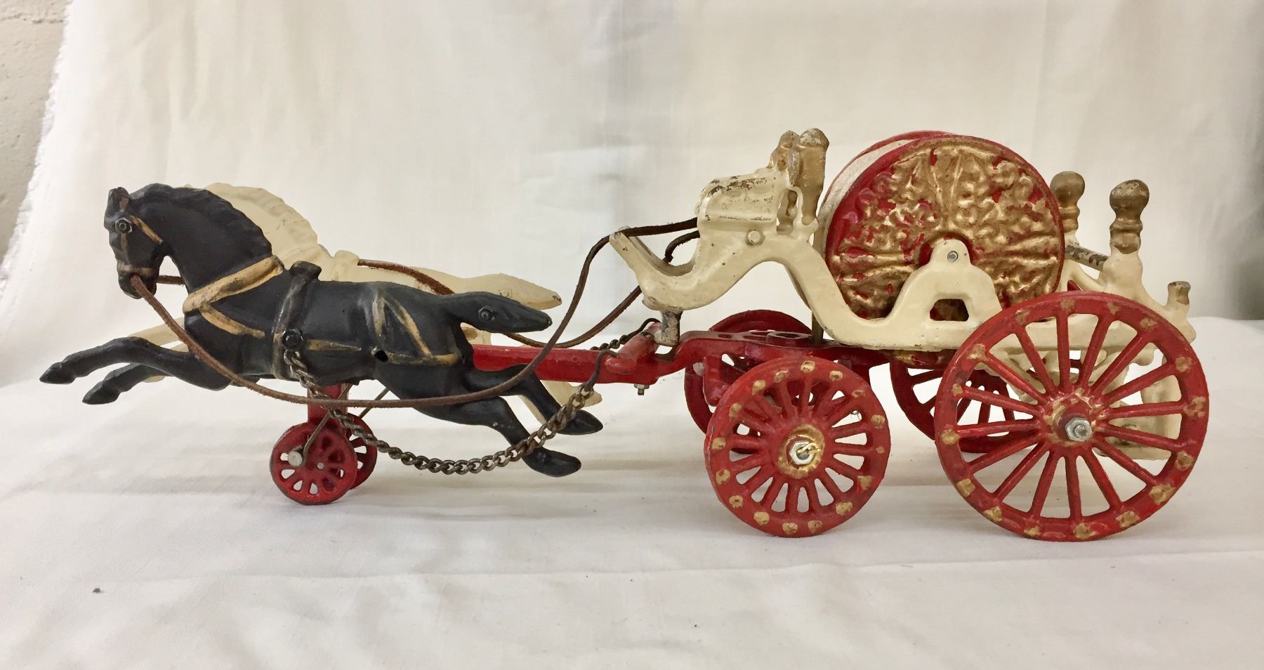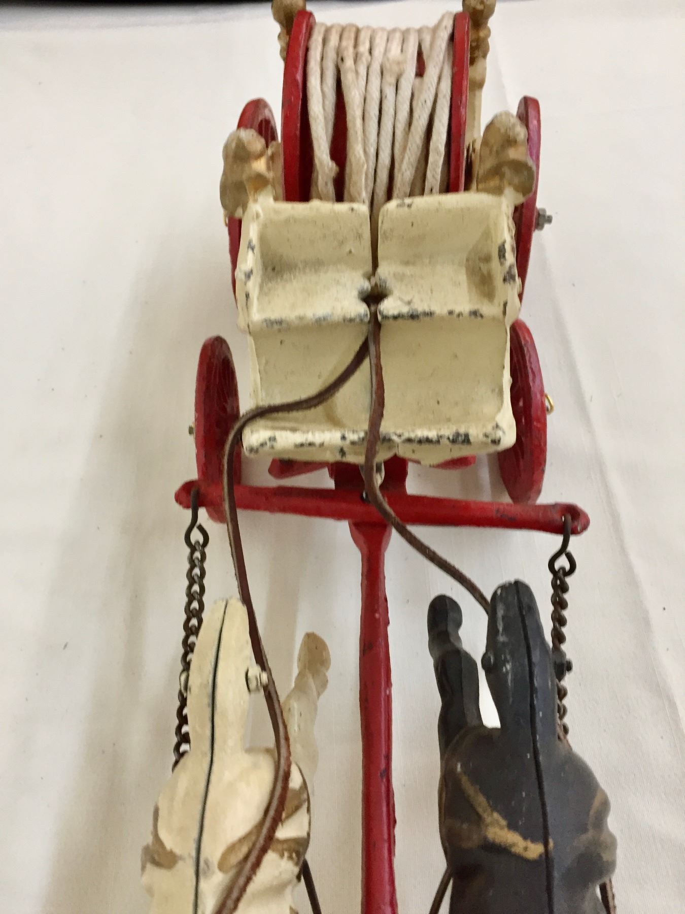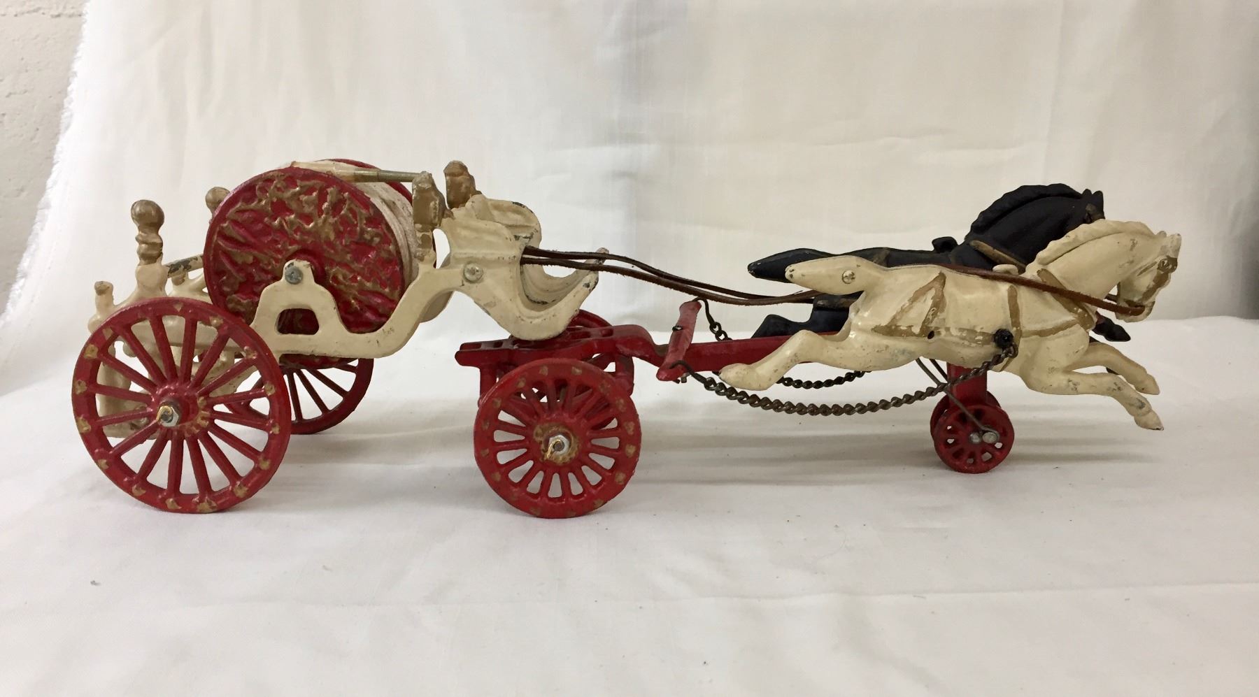 Description: Offered for sale in this lot is an antique fire wagon toy. This wagon features two horses strapped to the red and white wagon with a firehose.