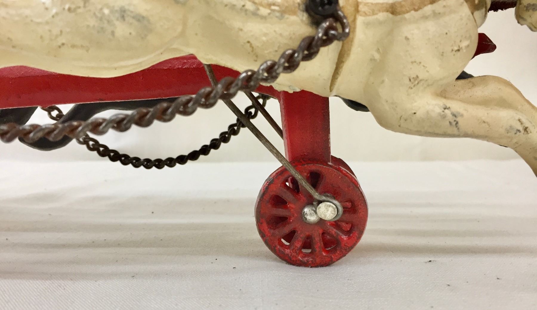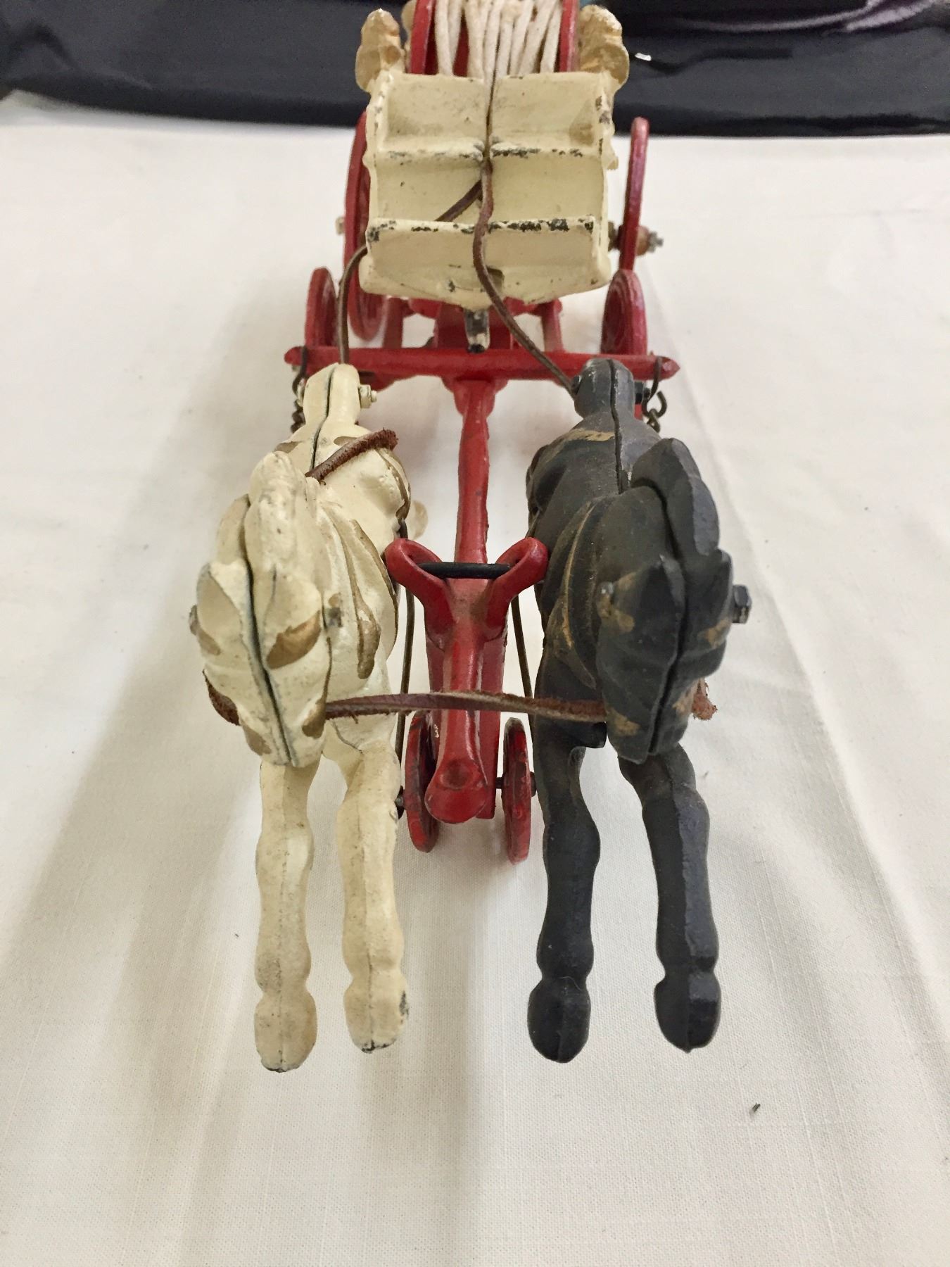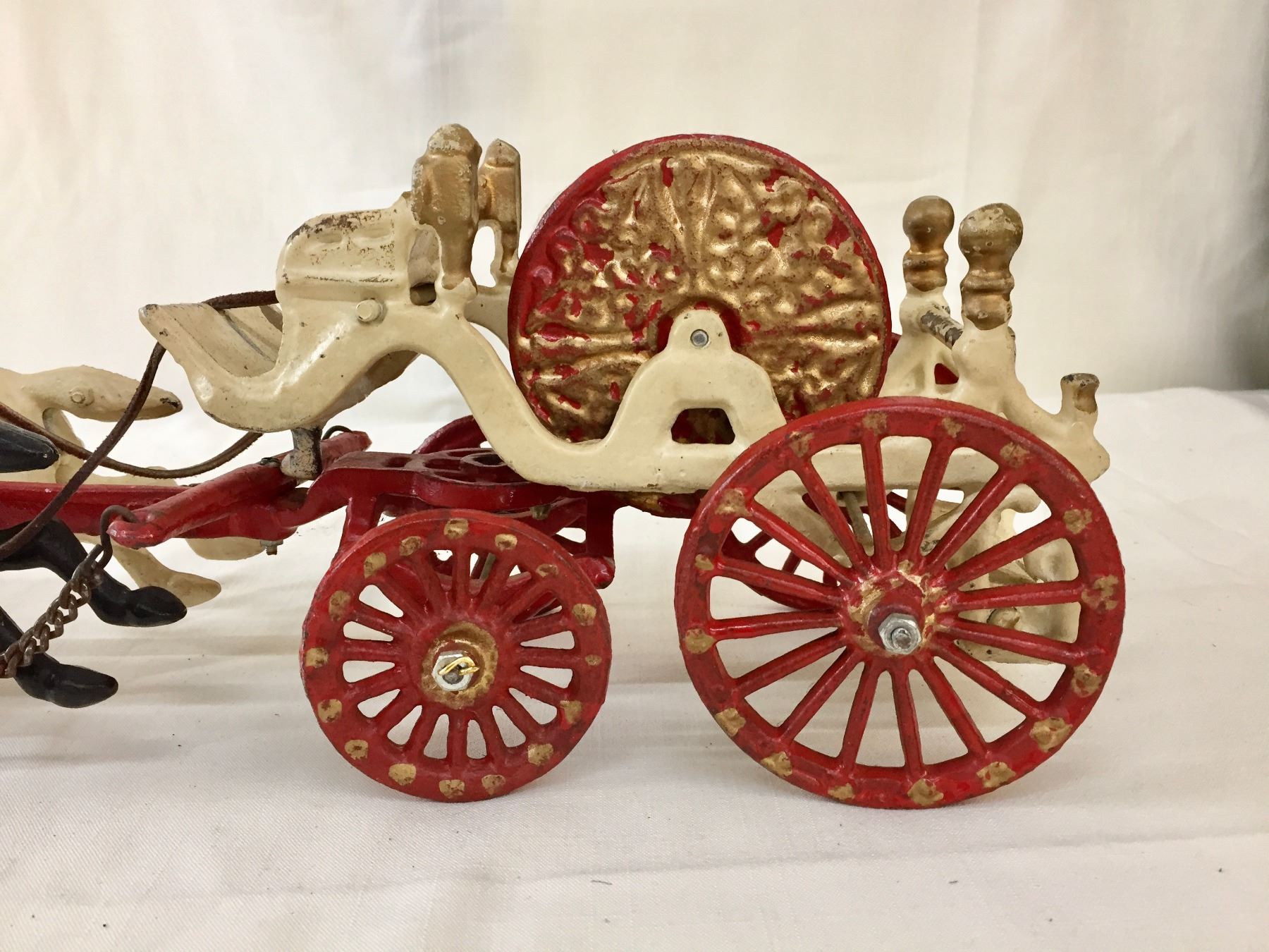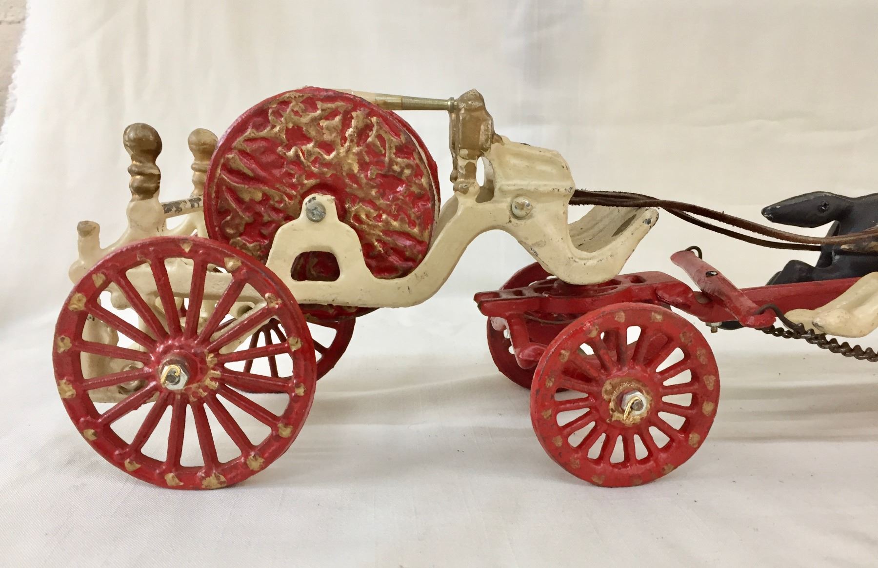 Description: Offered for sale in this lot is an antique fire wagon toy. This wagon features two horses strapped to the red and white wagon with a firehose.