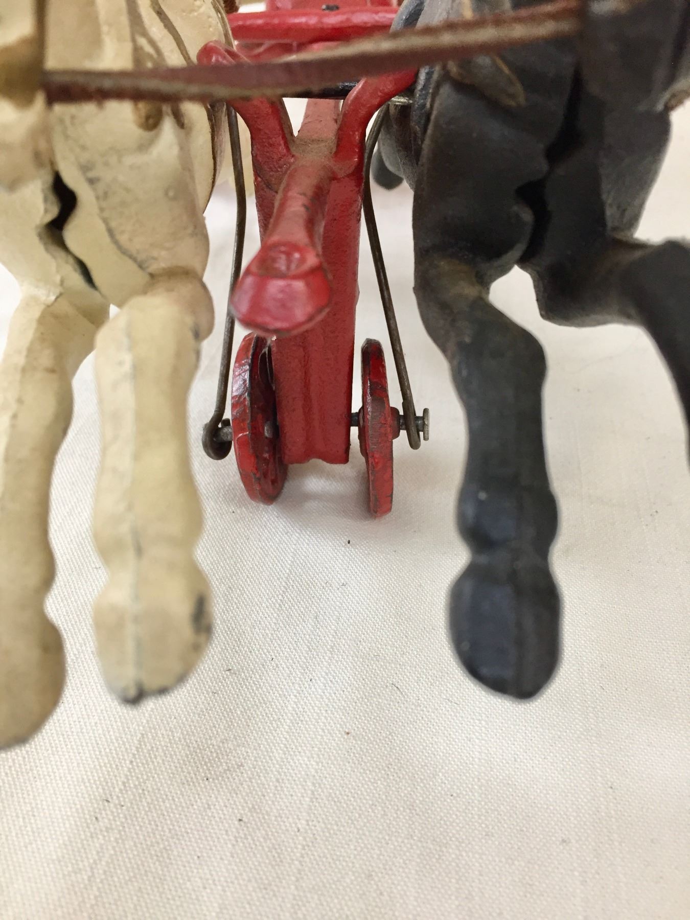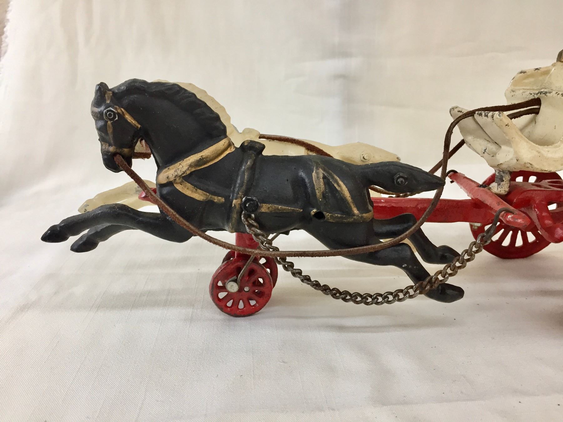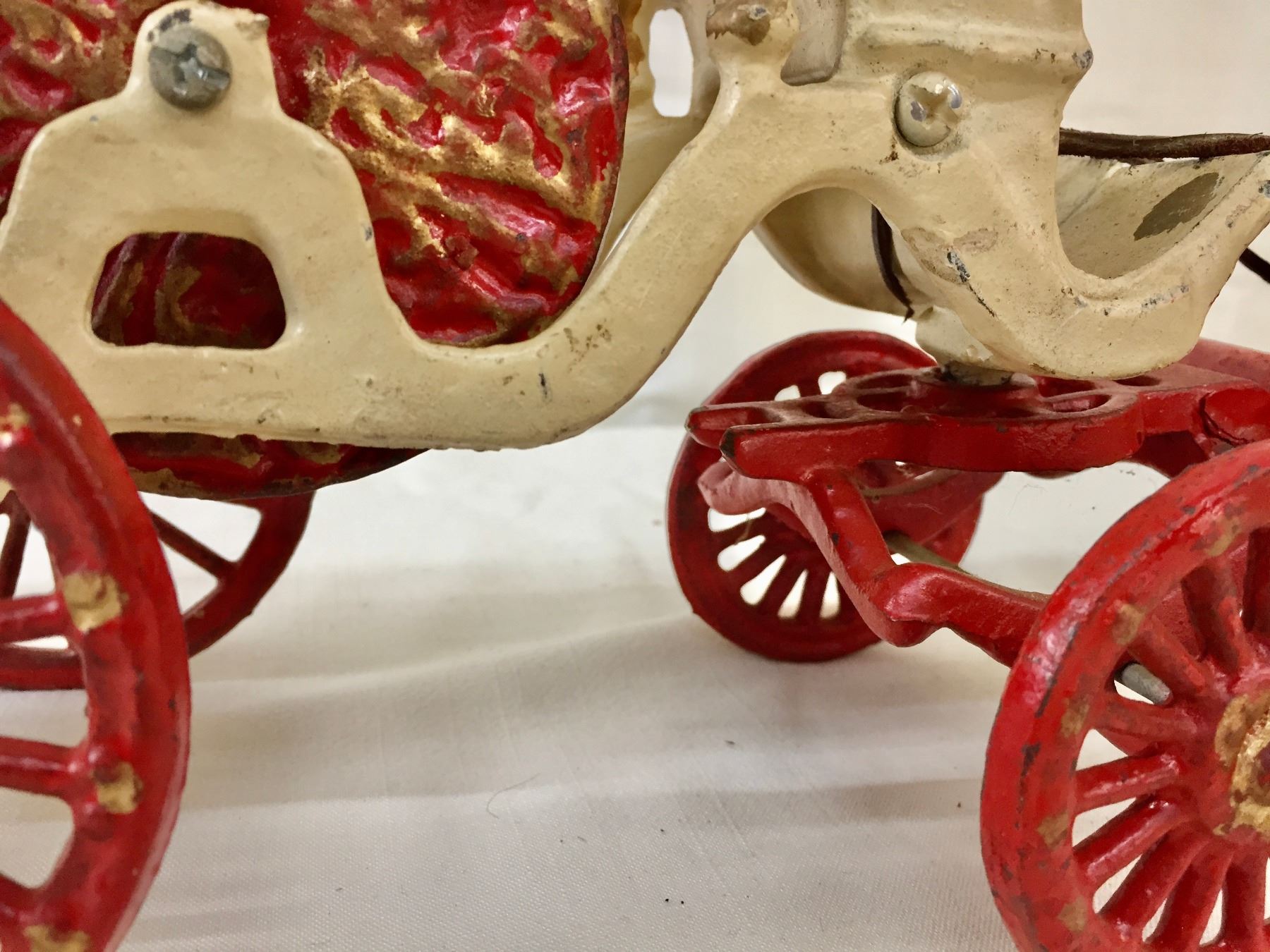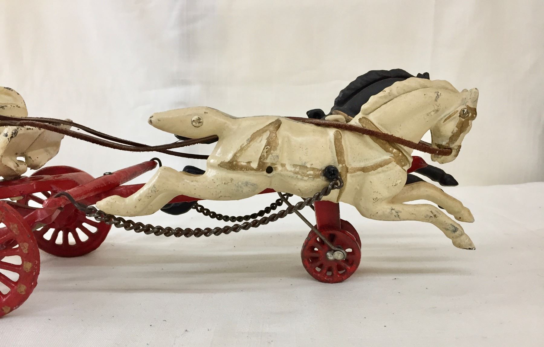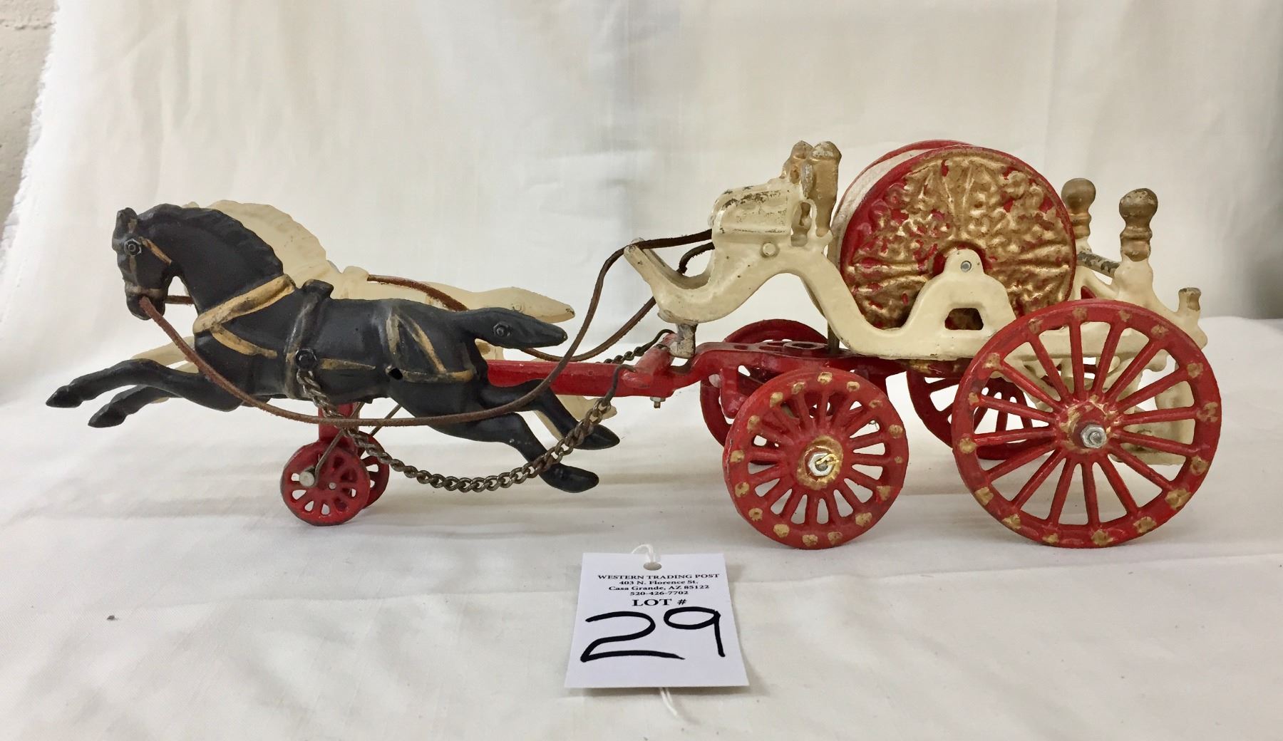 Description: Offered for sale in this lot is an antique fire wagon toy. This wagon features two horses strapped to the red and white wagon with a firehose.