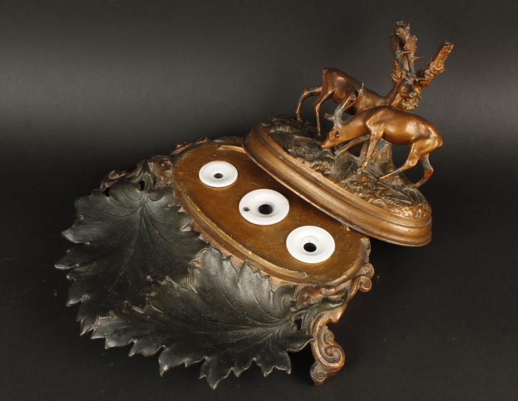 With stag decoration. Maple leaf pen holder. (3) canter porcelain inkwells. Circa 1840's-60's. (1) inkwell states "North of England School of Furnishing Company Limited." Otherwise unmarked. In overall excellent condition.