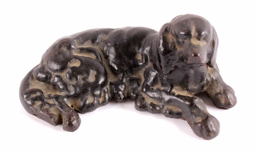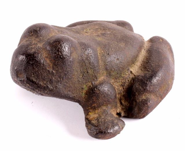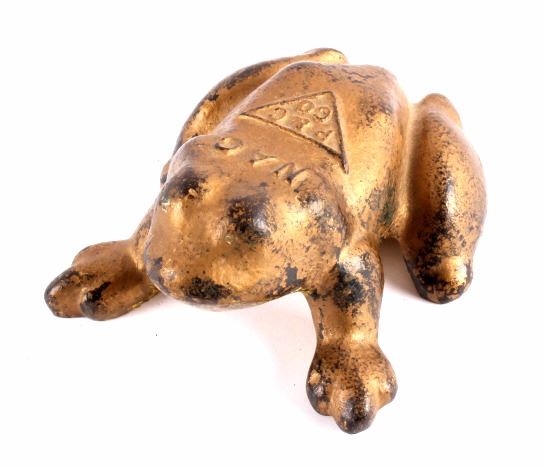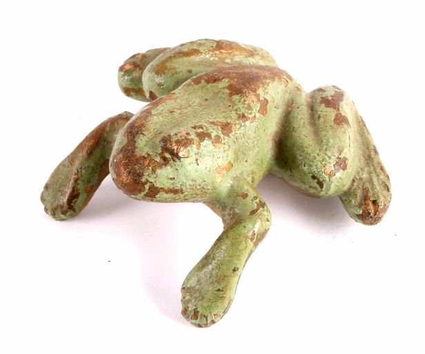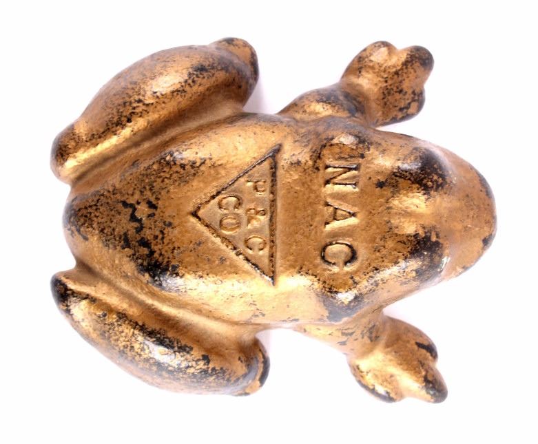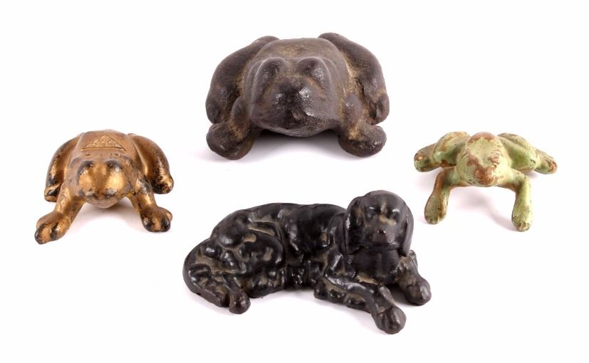 This is a collection of four cast iron paperweights. Included are three frogs and a dog. One of the frogs is marked "NAC" and "P&C Co". All four paperweights are in good condition. The largest one measures 4.25" x 5.25".