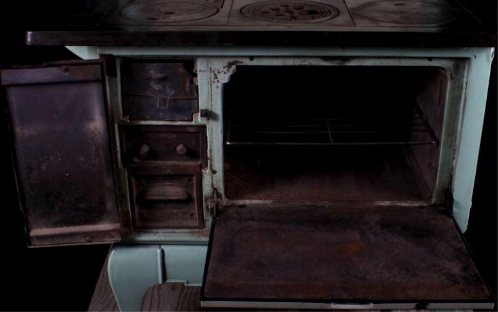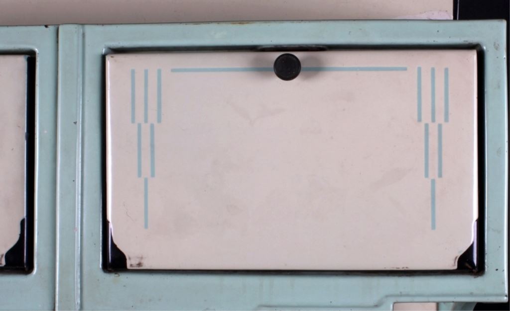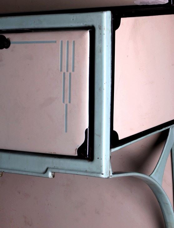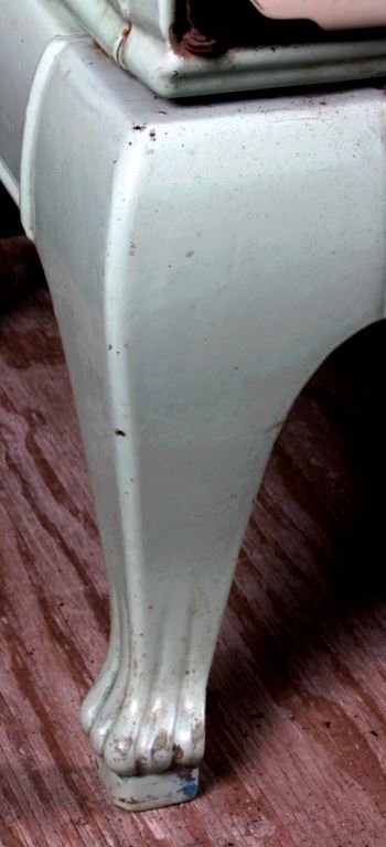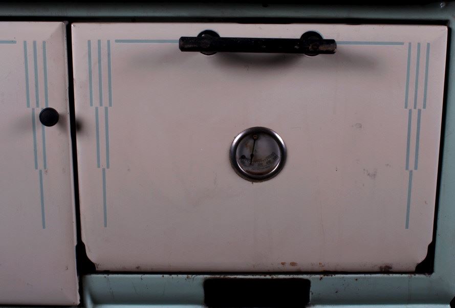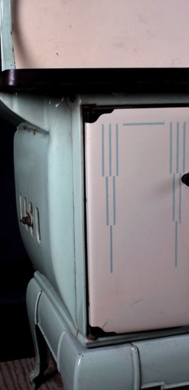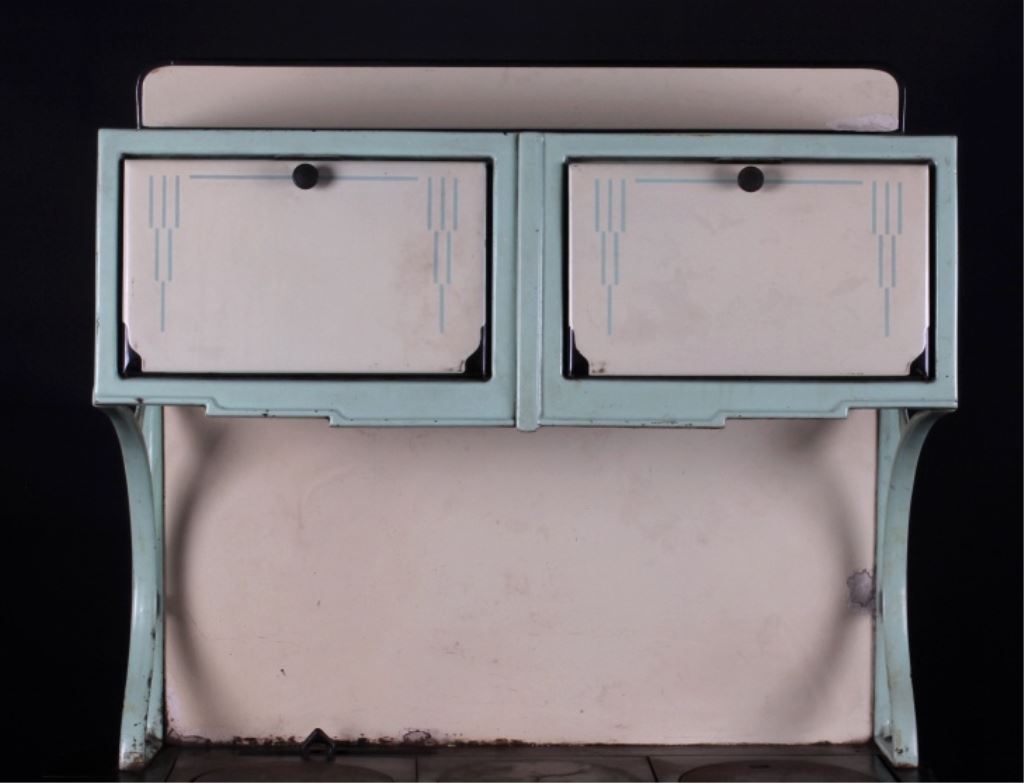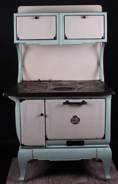 This is an antique cast iron cook stove. The stove is all original and is believed to be complete. The stove features a teal green and cream color. The antique stove is in good condition. It measures 36" wide and 28" deep and stands 61" tall.