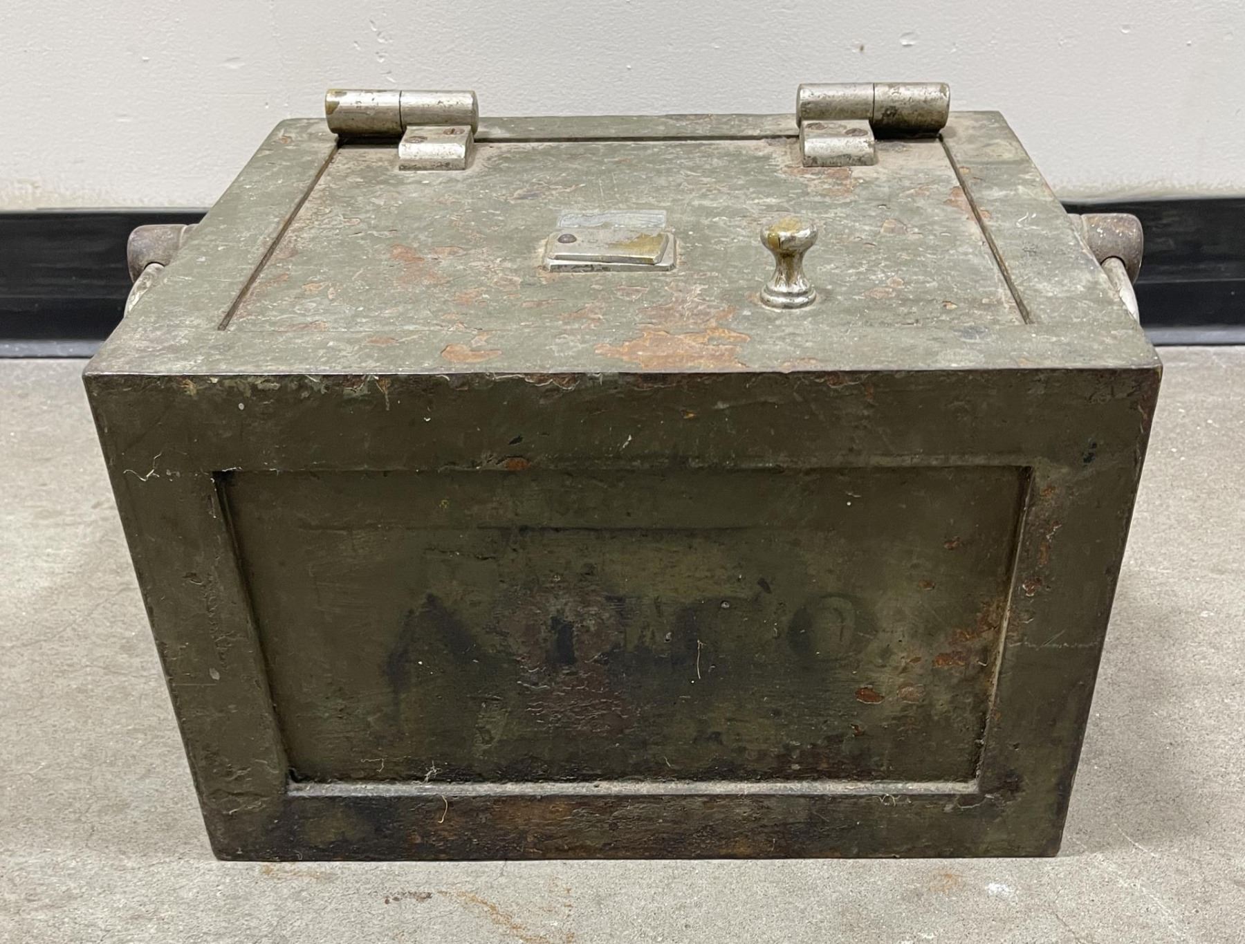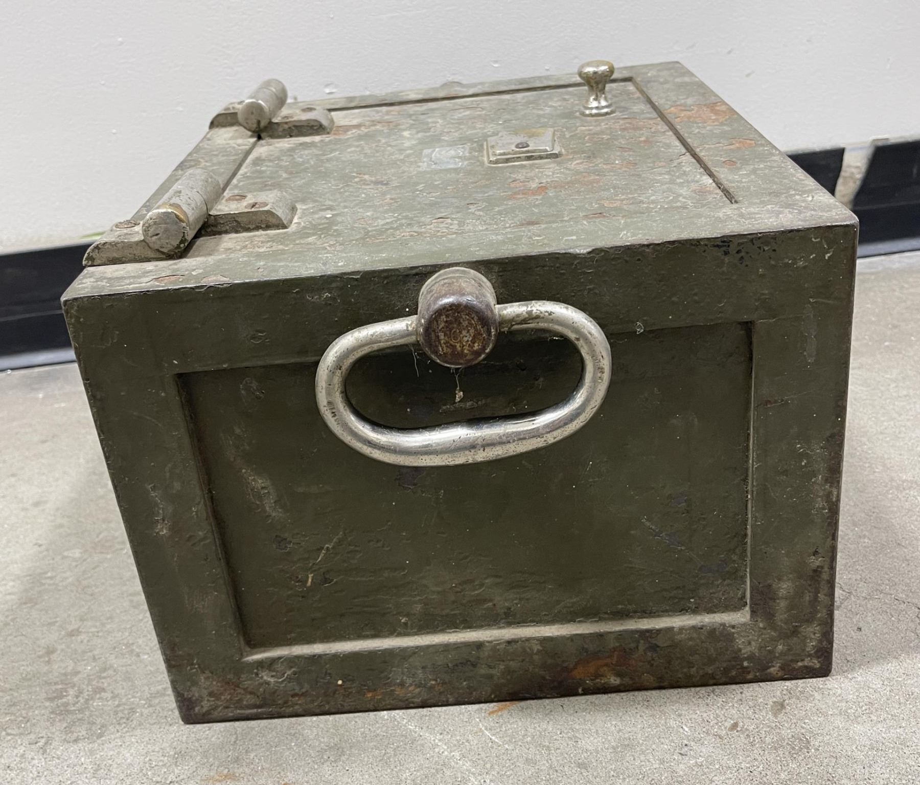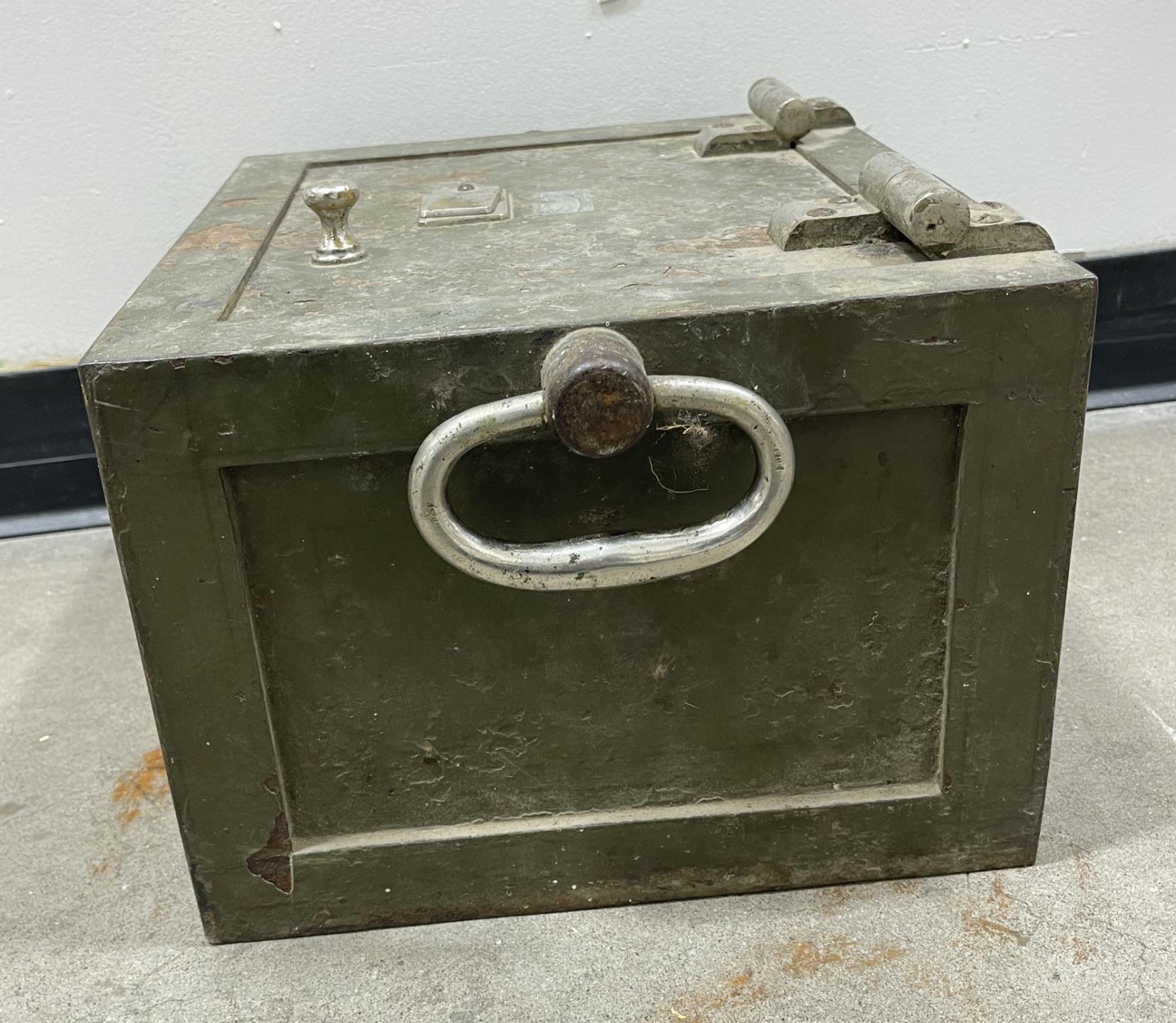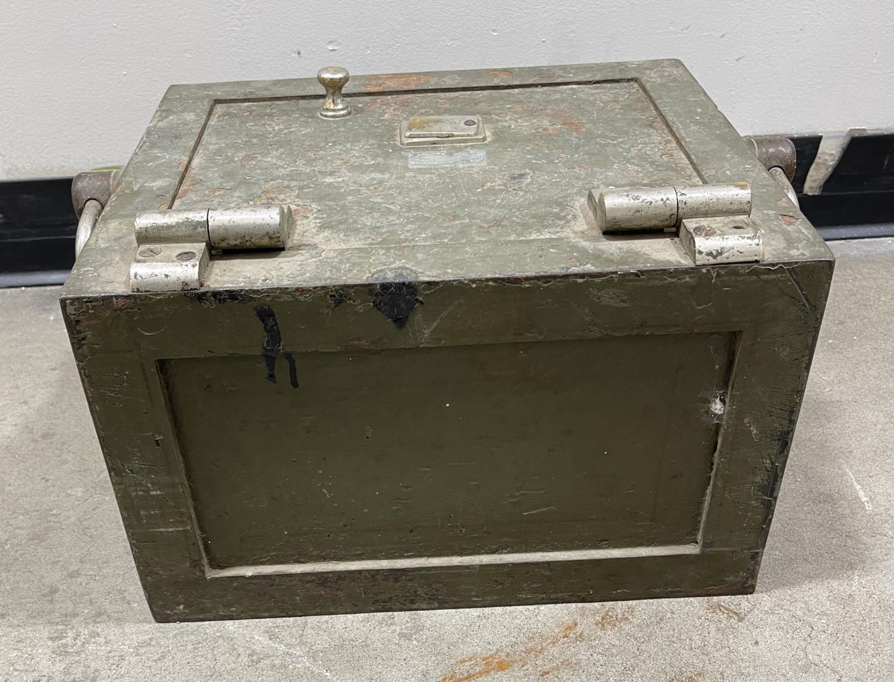 Very nice old strong box. Weighs almost 78 pounds. Military or possibly Railroad.