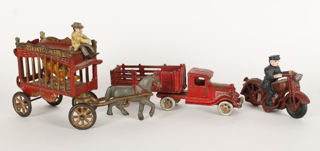 (1) Overland circus with horse, wagon driver, cage, and tiger. (1) "Coast to Coast Cartage" delivery truck with trailer. (1) Hubley motorcycle rider.