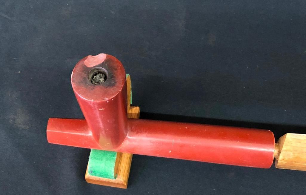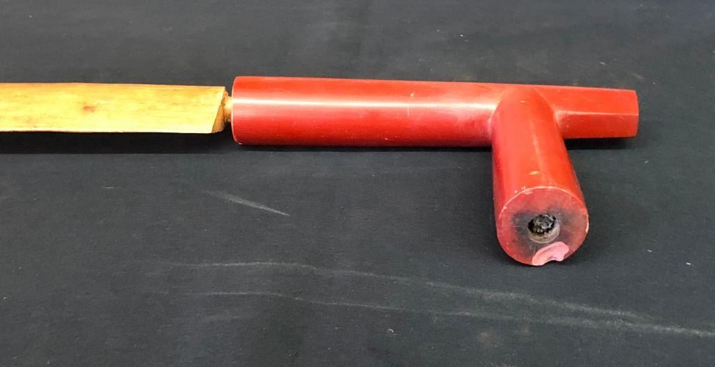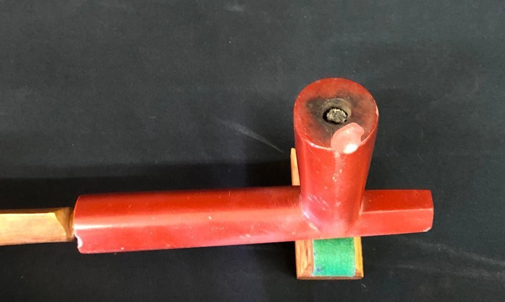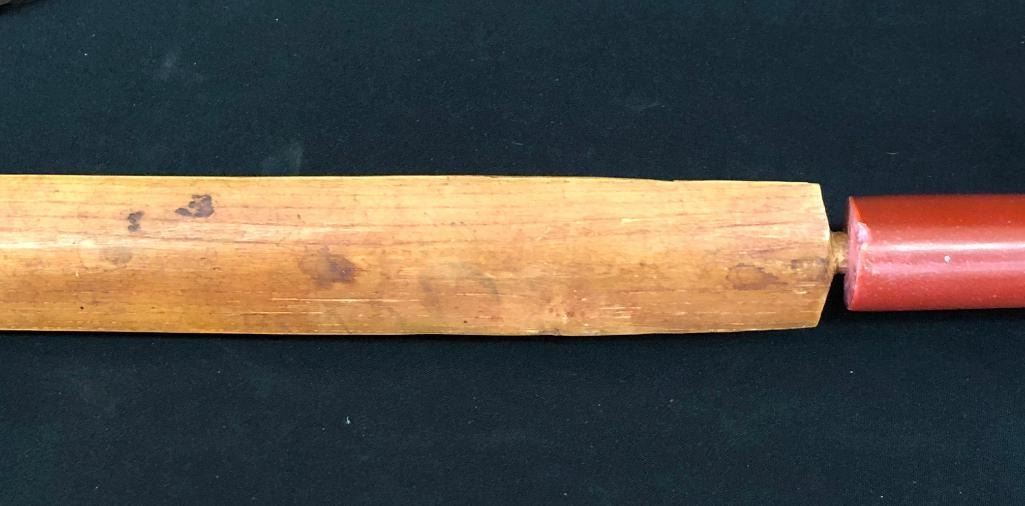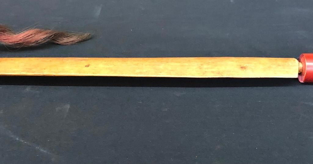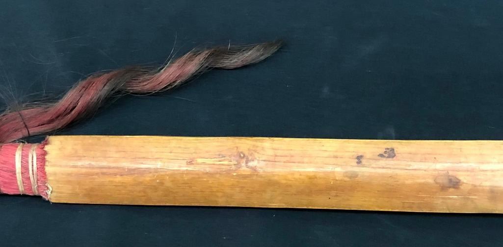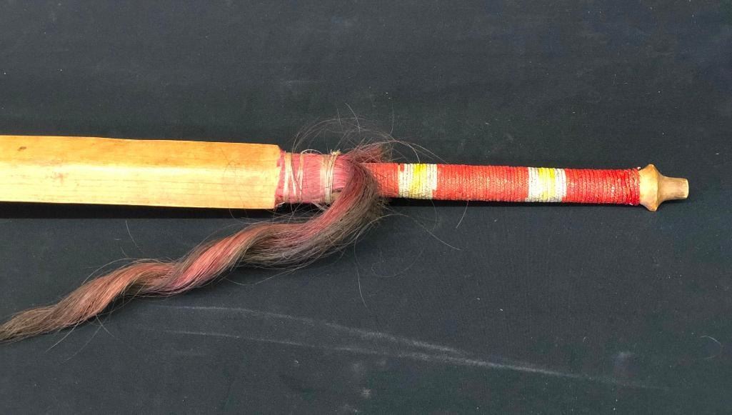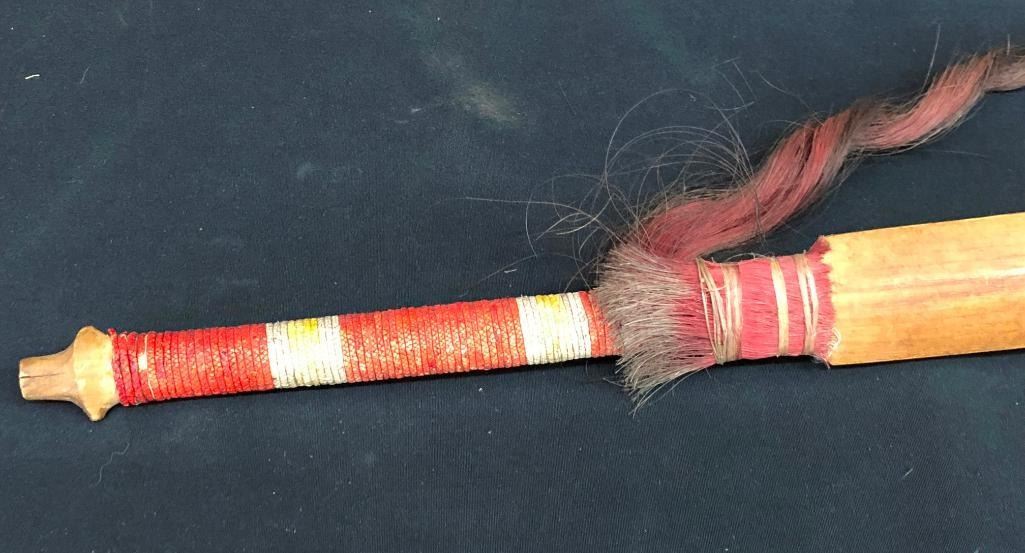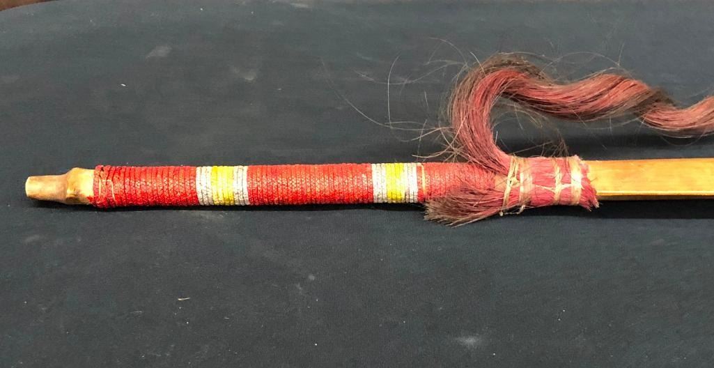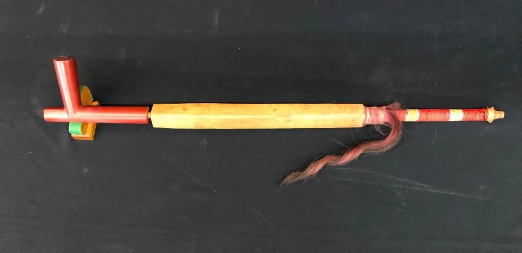 For sale in this lot is an antique Catlinite pipe and wood stem. Bowl is carved red pipestone (catlinite) and the removable stem is carved wood with accents. This will make an epic display piece, or for those brave enough - it could still function as a ceremonial pipe for smoking and sending prayers to the Heavens... Maker: Unmarked. Approx. Age: C. early 1900s. Size: 4-1/2 inches wide X 31-1/2 inches long. Condition: Pretty good for its age, normal wear expected. Please look closely at the pictures - they are an important part of our description. Shipping: There will be a $10 handling / packaging fee for shipping this lot. The actual cost of postage will be added on top of that. BUY IT NOW: If you would like to buy this item now without waiting for the auction to end (this option is only available up to 48 hours before the auction starts to close), the “Buy it Now” price is the high estimate of this lot. If you would like to end the auction early and pay the high estimate (plus applicable fees), please contact us by phone or email and reference this lot number.