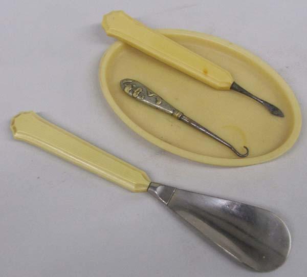 Antique Celluloid Dresser set plus silver Button Hook. Celluloid handled shoe horn, cuticle tool & tray. shoe horn measures approx. 6.25''. Buyers Pay Actual Shipping and Handling Charges(see terms and conditions for more information)