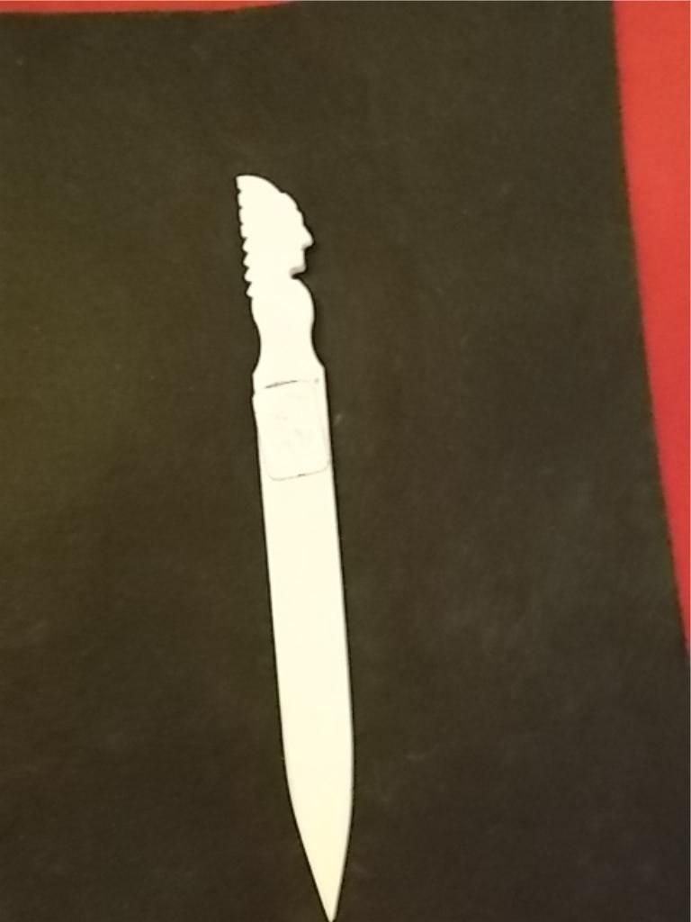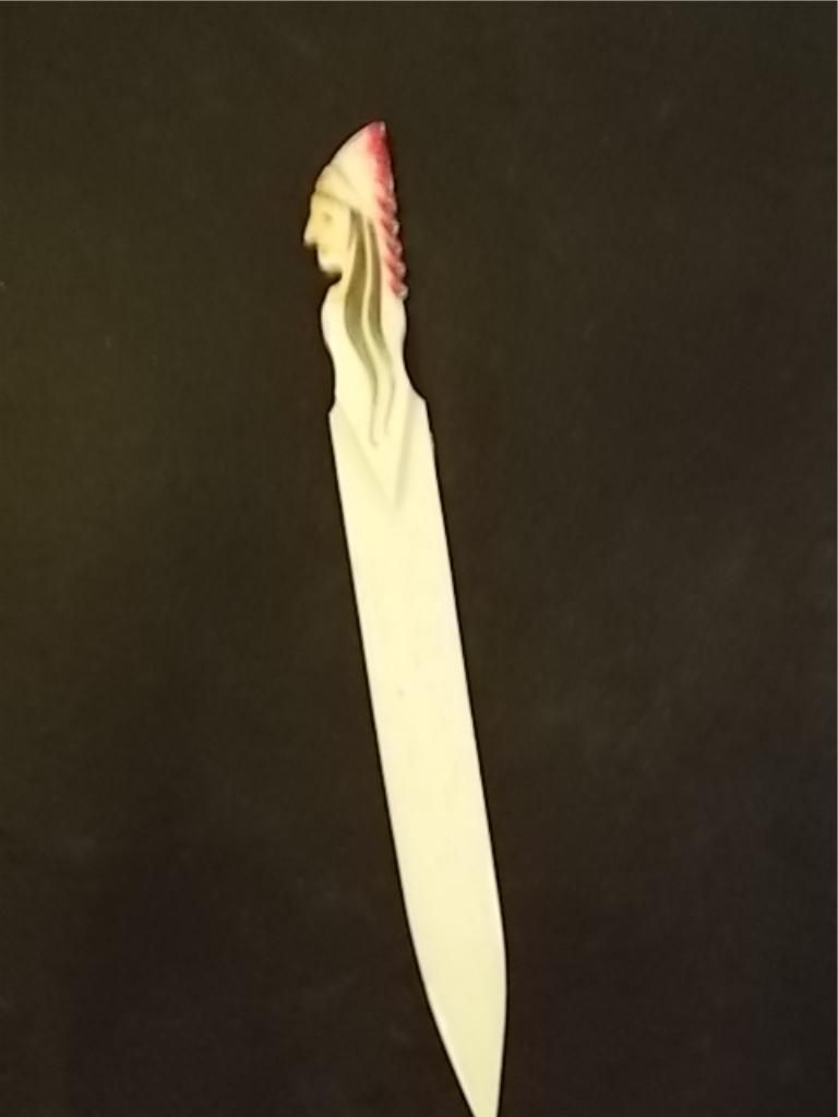 5 7/8” Antique Celluloid Letter Opener and Bookmark Indian Chief Head. This unmarked celluloid letter opener and bookmark is probably a souvenir and is in used condition.
