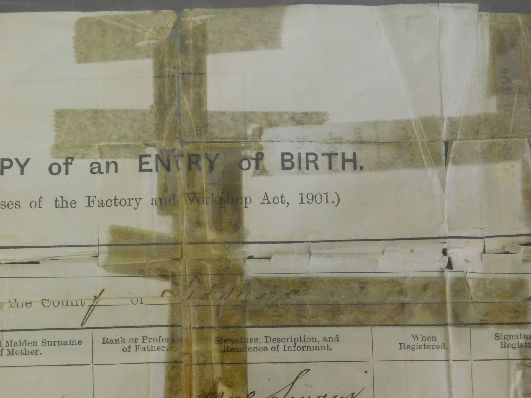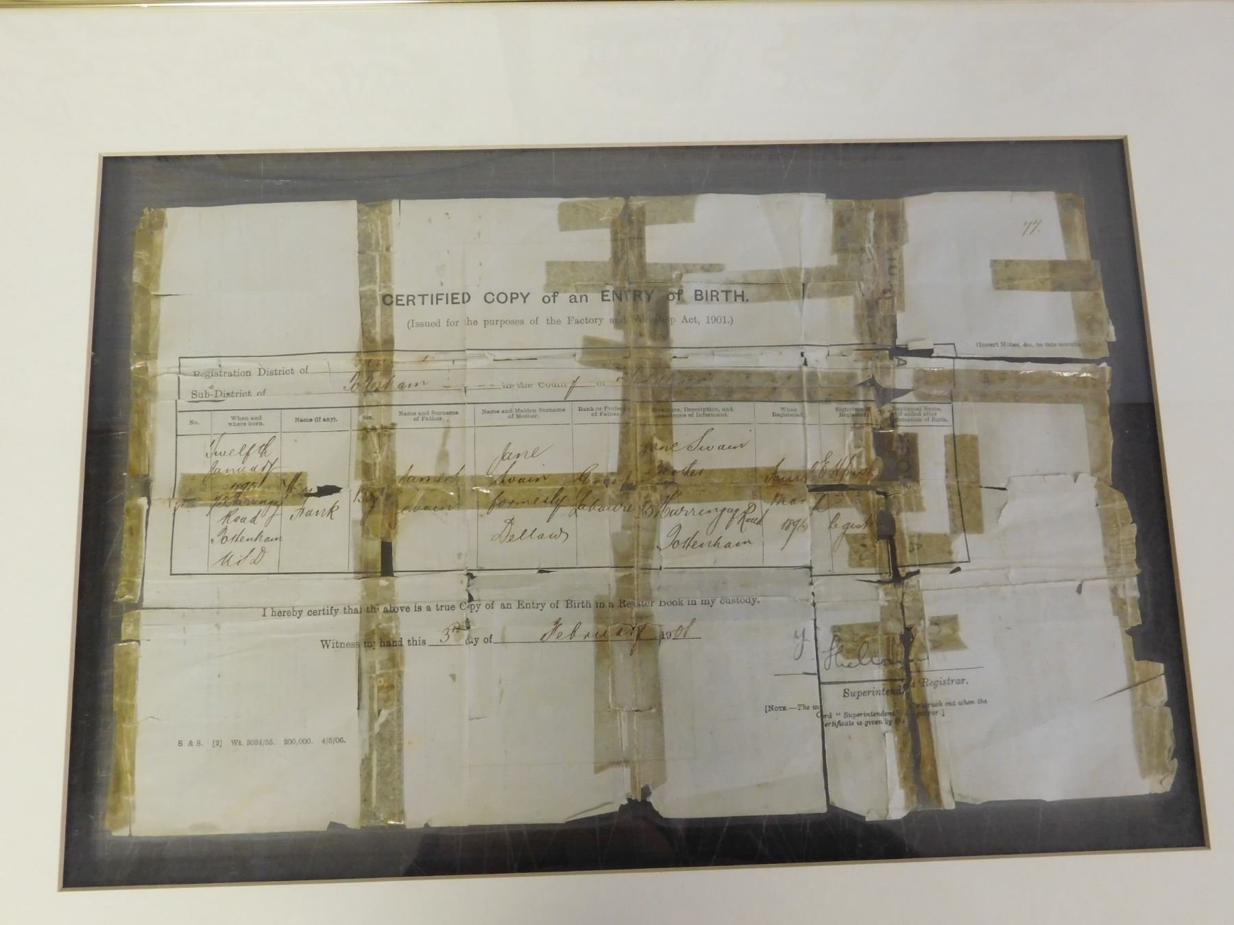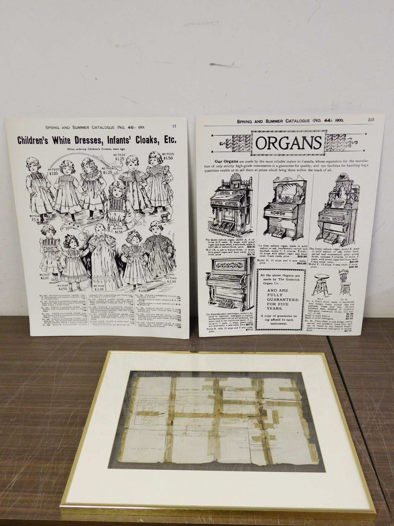 Antique Certified Copy of Birth 1901 Framed Paper, Large Screenprints Eatons Catalogue 1900s Ads