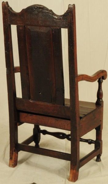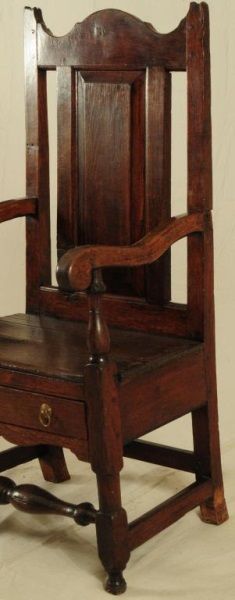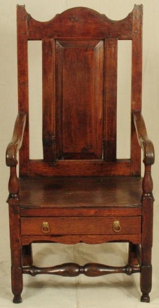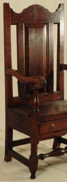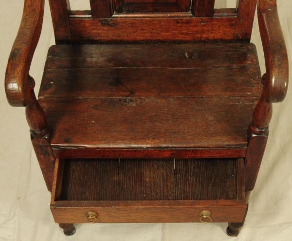 Very early oak chair with drawer in seat. 49.5" x 23.5" 20"