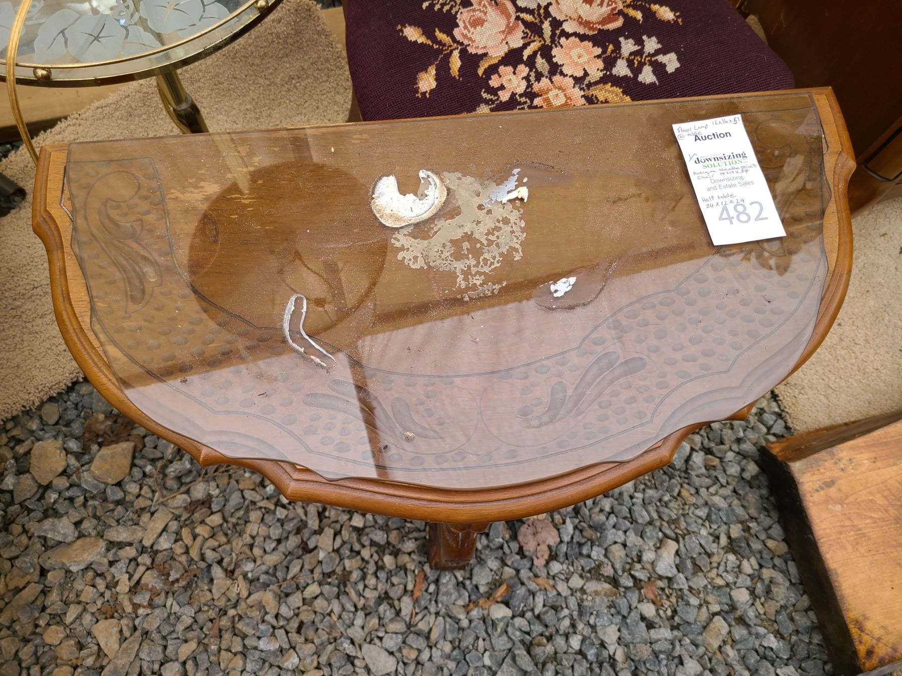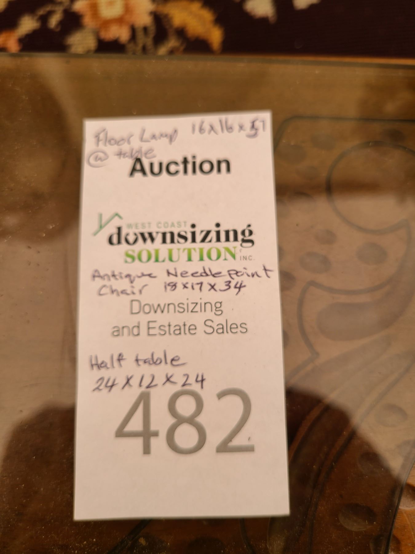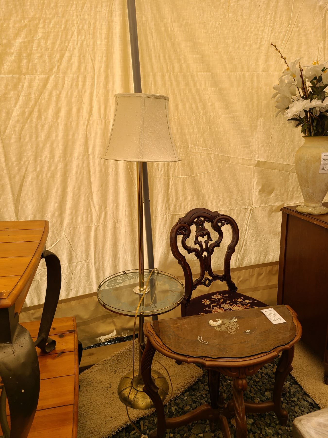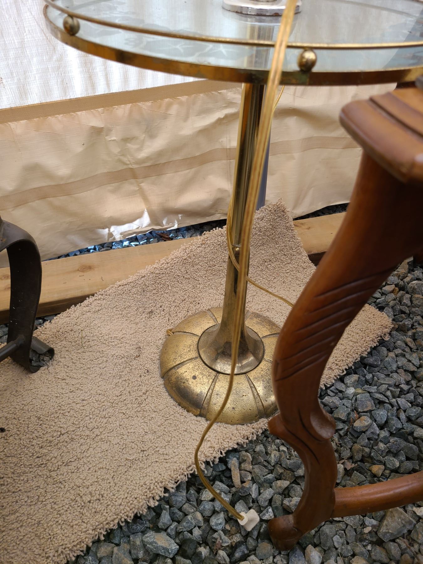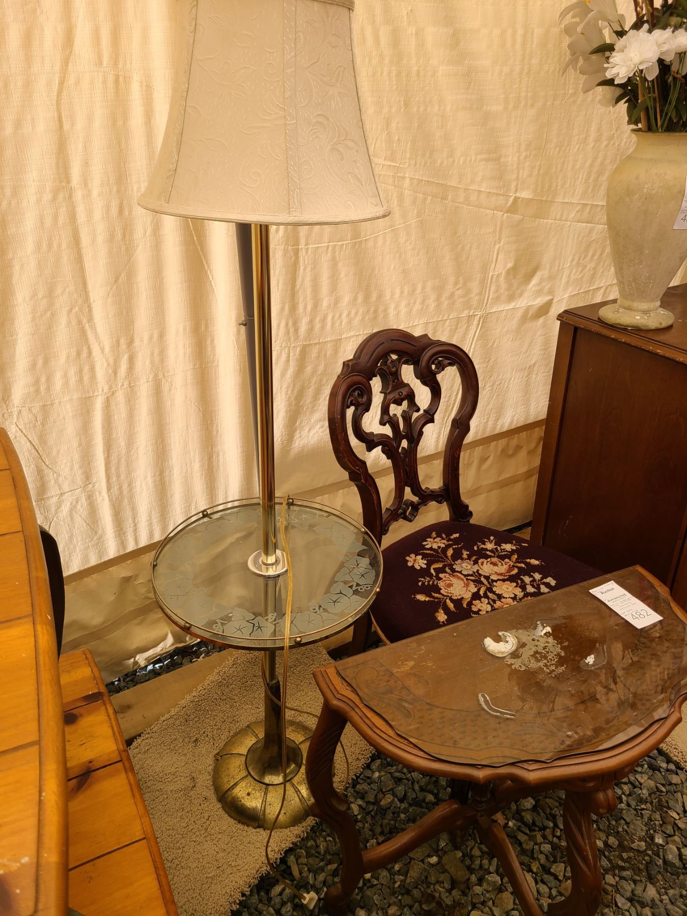 Antique chair with needle point seat 18x17x34, Floor lamp in glass table 16x16x57, half round wall table 24x16x24. Glass top and top of table has glue marks. Note scratches. Pickup 10 am