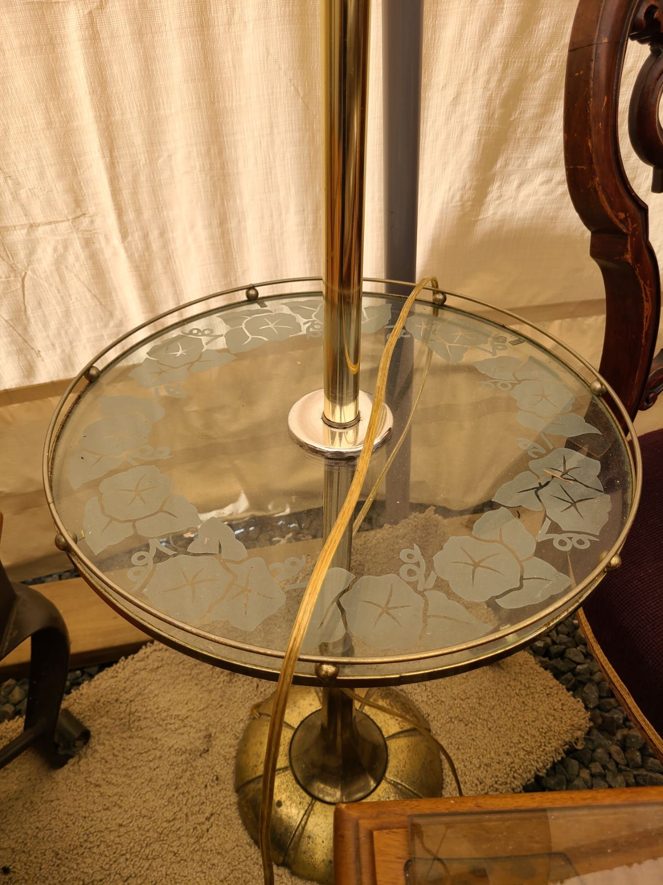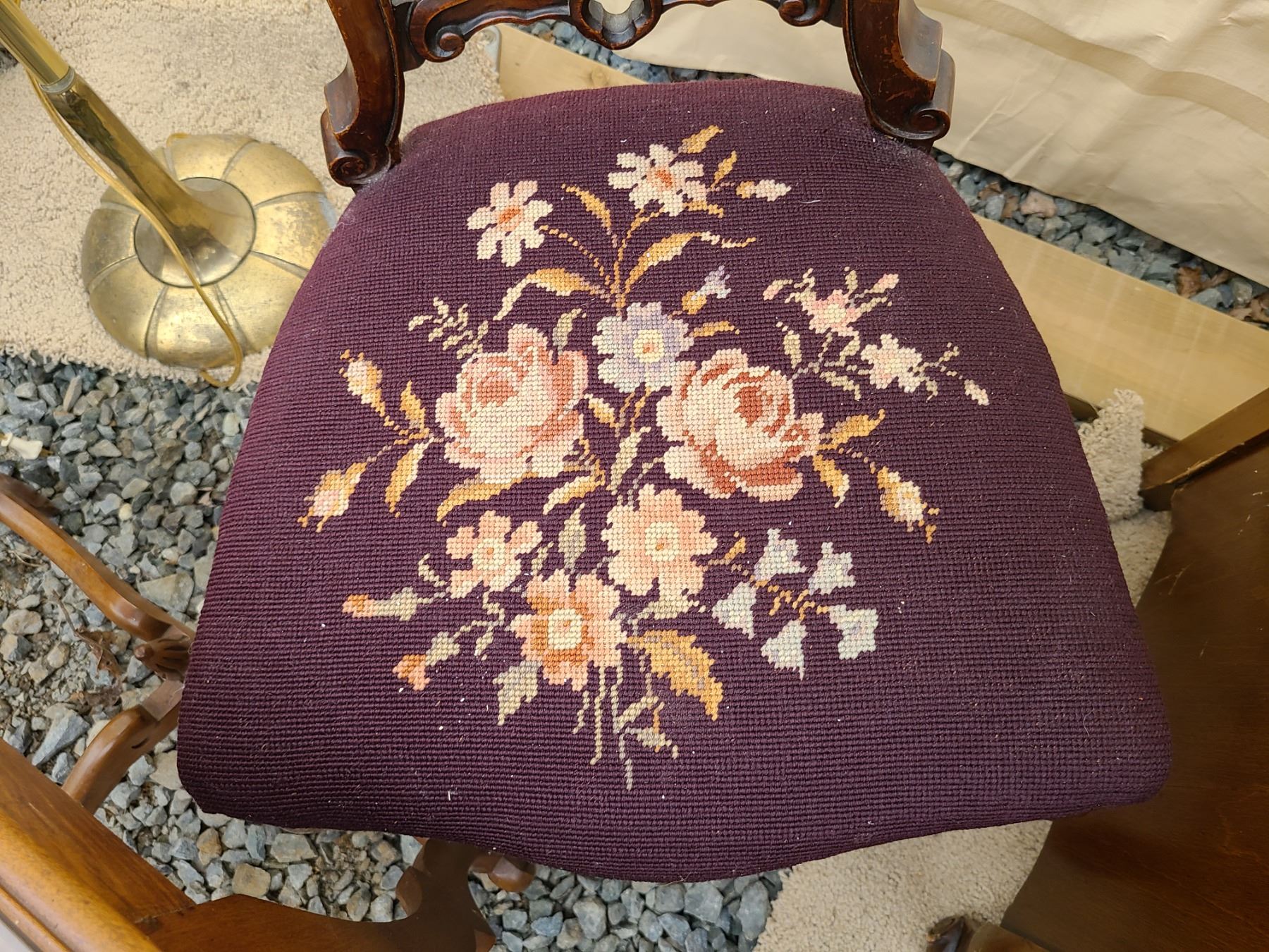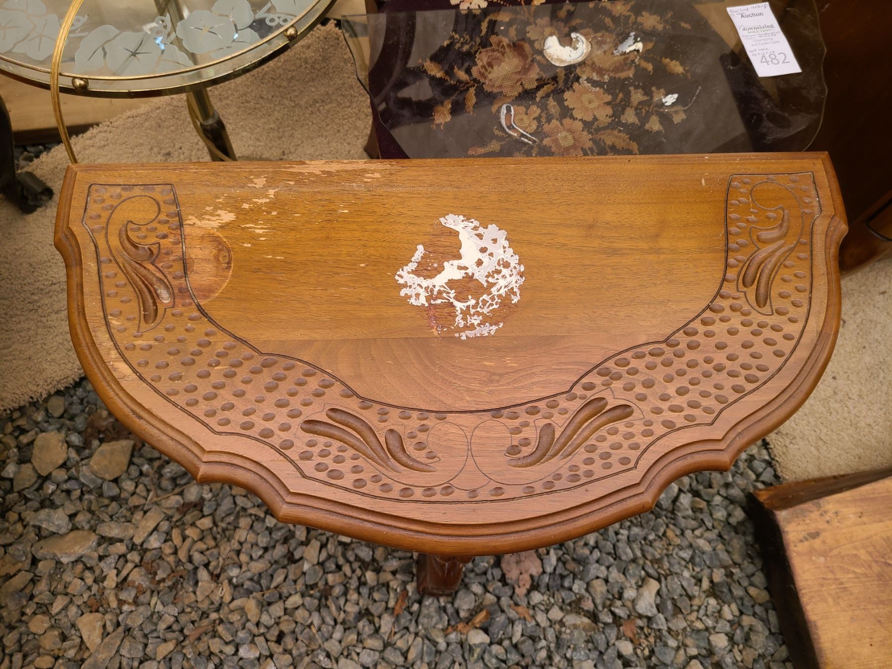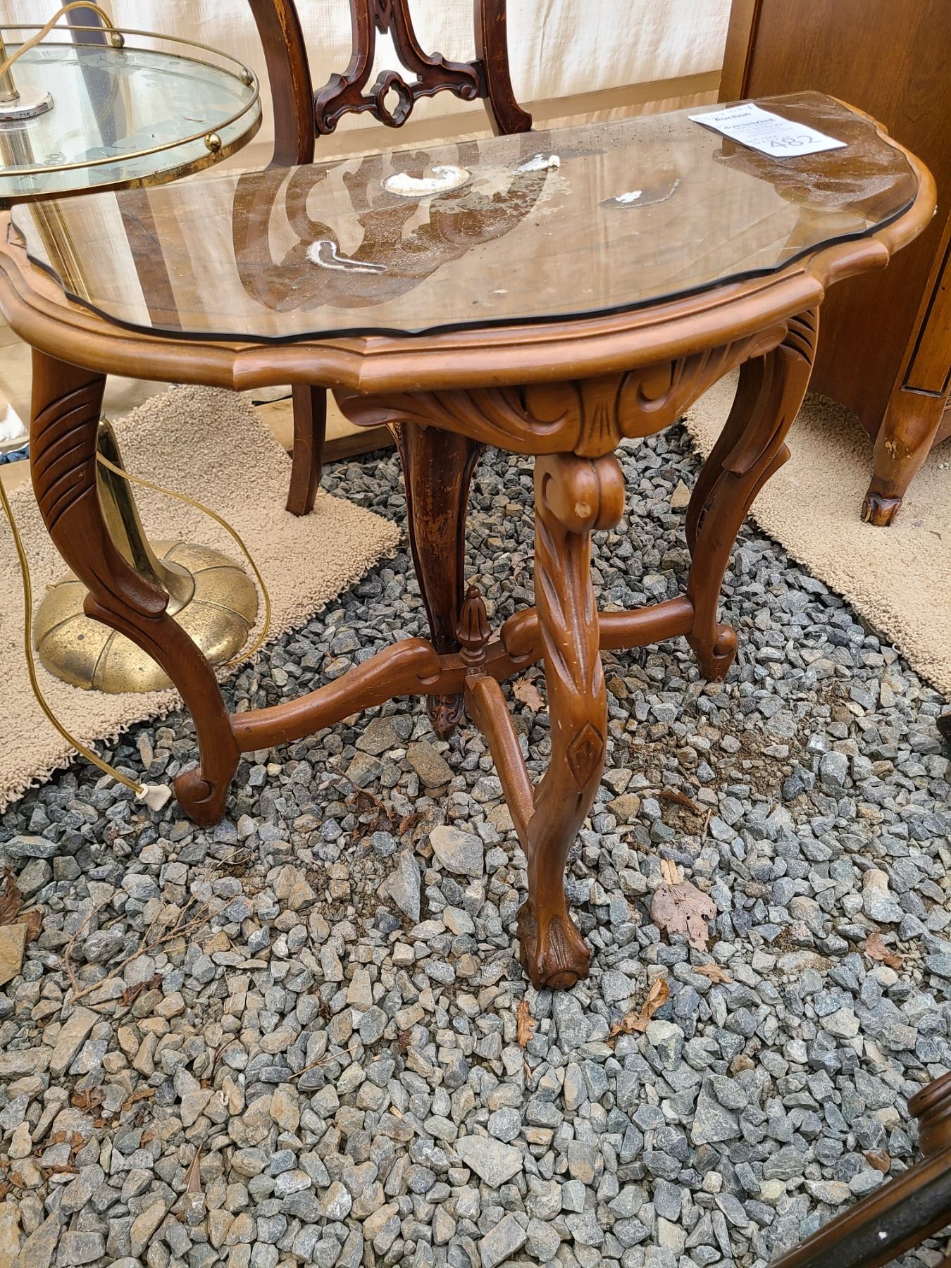 Antique chair with needle point seat 18x17x34, Floor lamp in glass table 16x16x57, half round wall table 24x16x24. Glass top and top of table has glue marks. Note scratches. Pickup 10 am