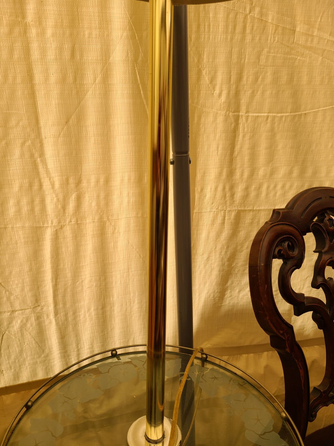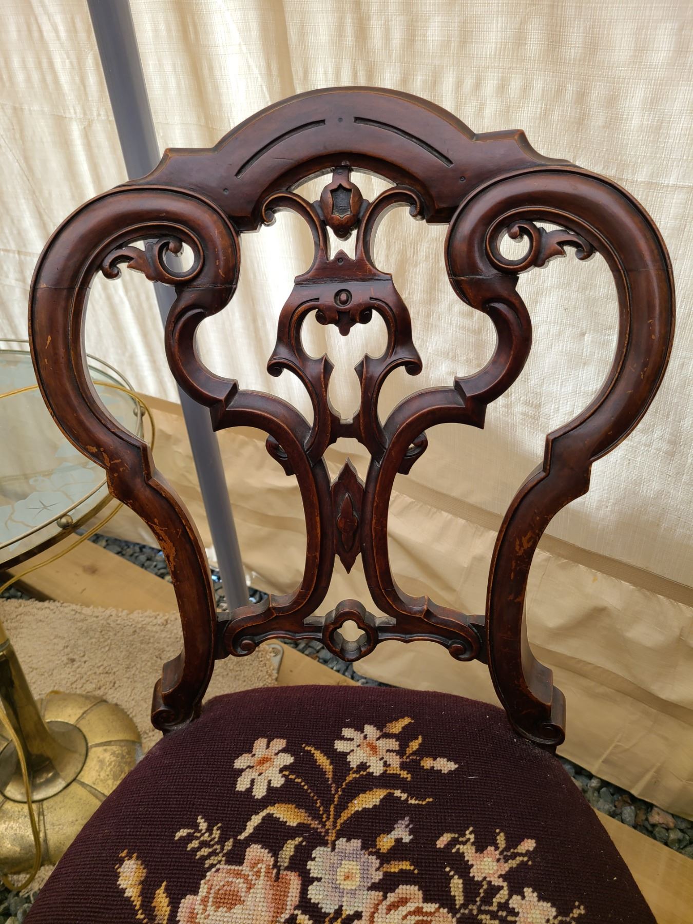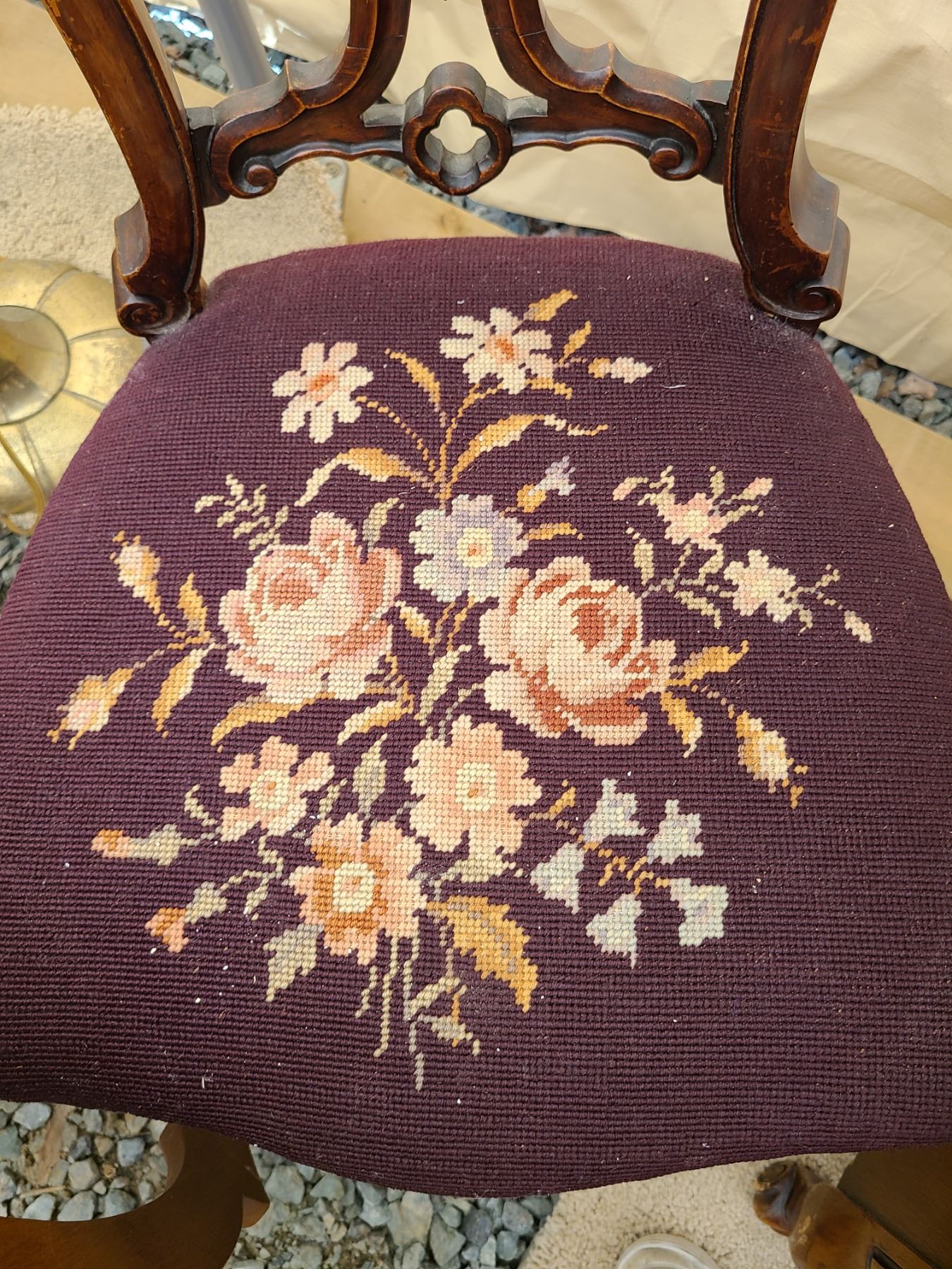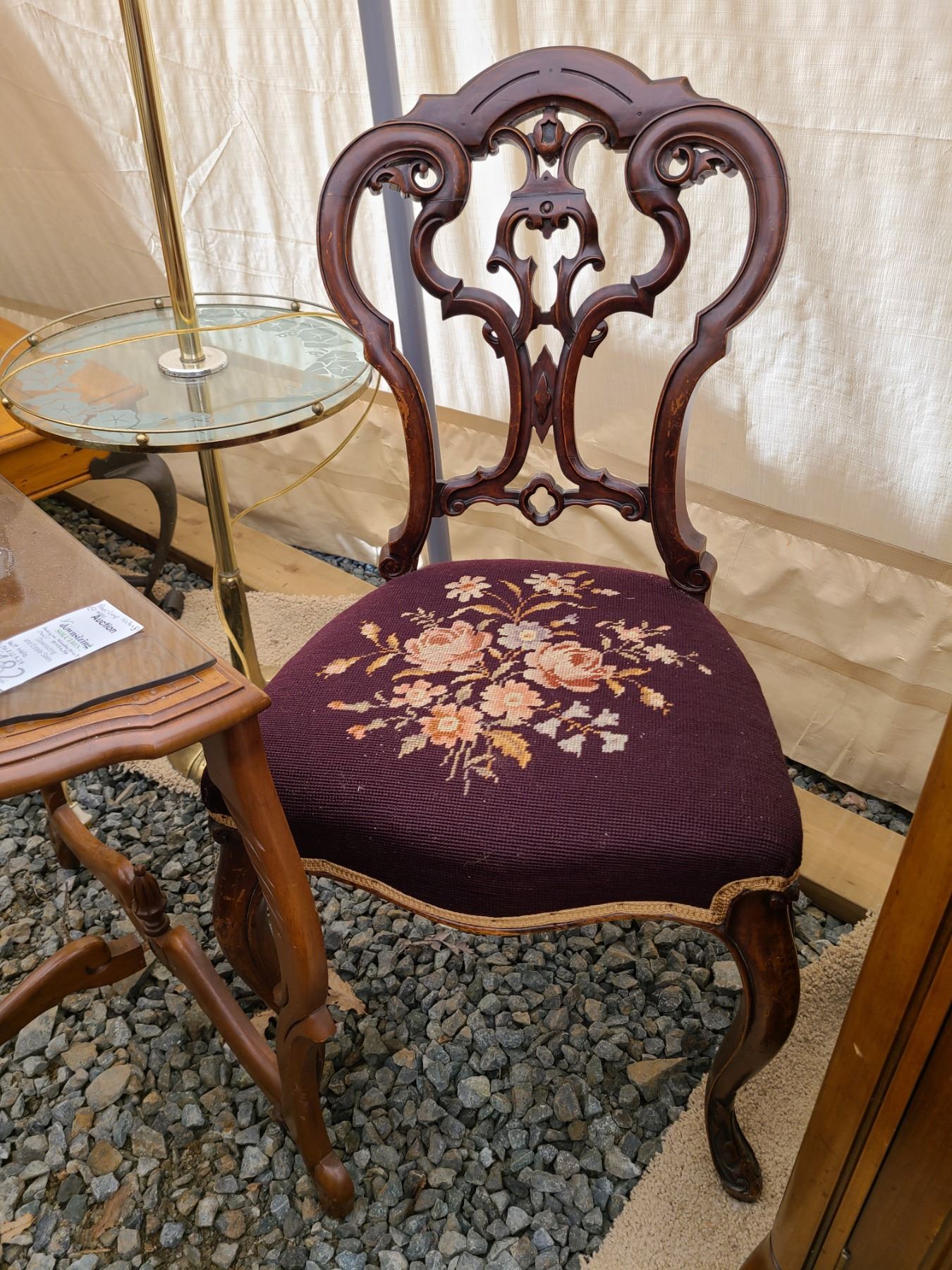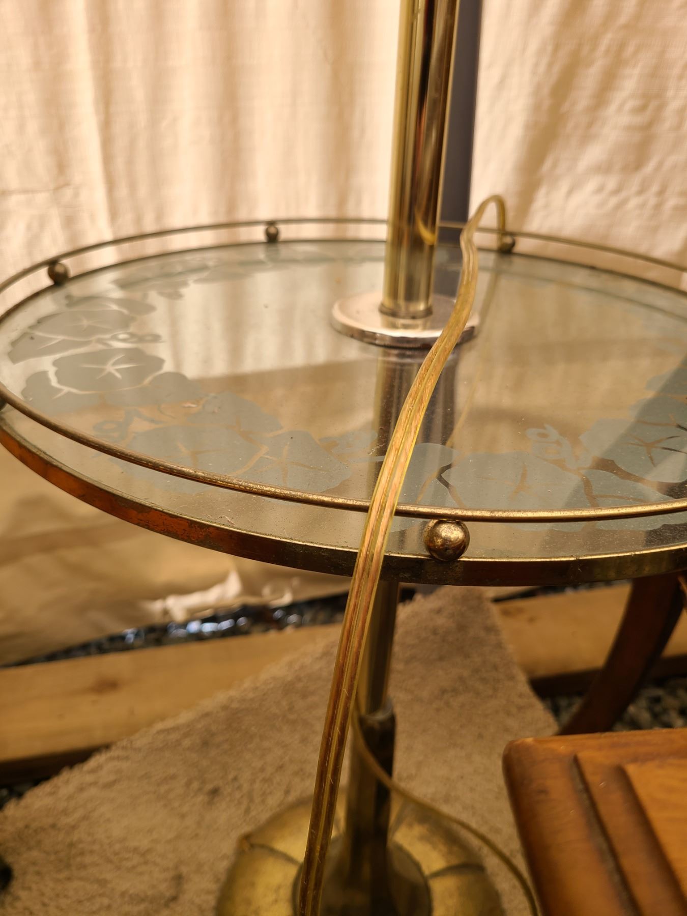 Antique chair with needle point seat 18x17x34, Floor lamp in glass table 16x16x57, half round wall table 24x16x24. Glass top and top of table has glue marks. Note scratches. Pickup 10 am