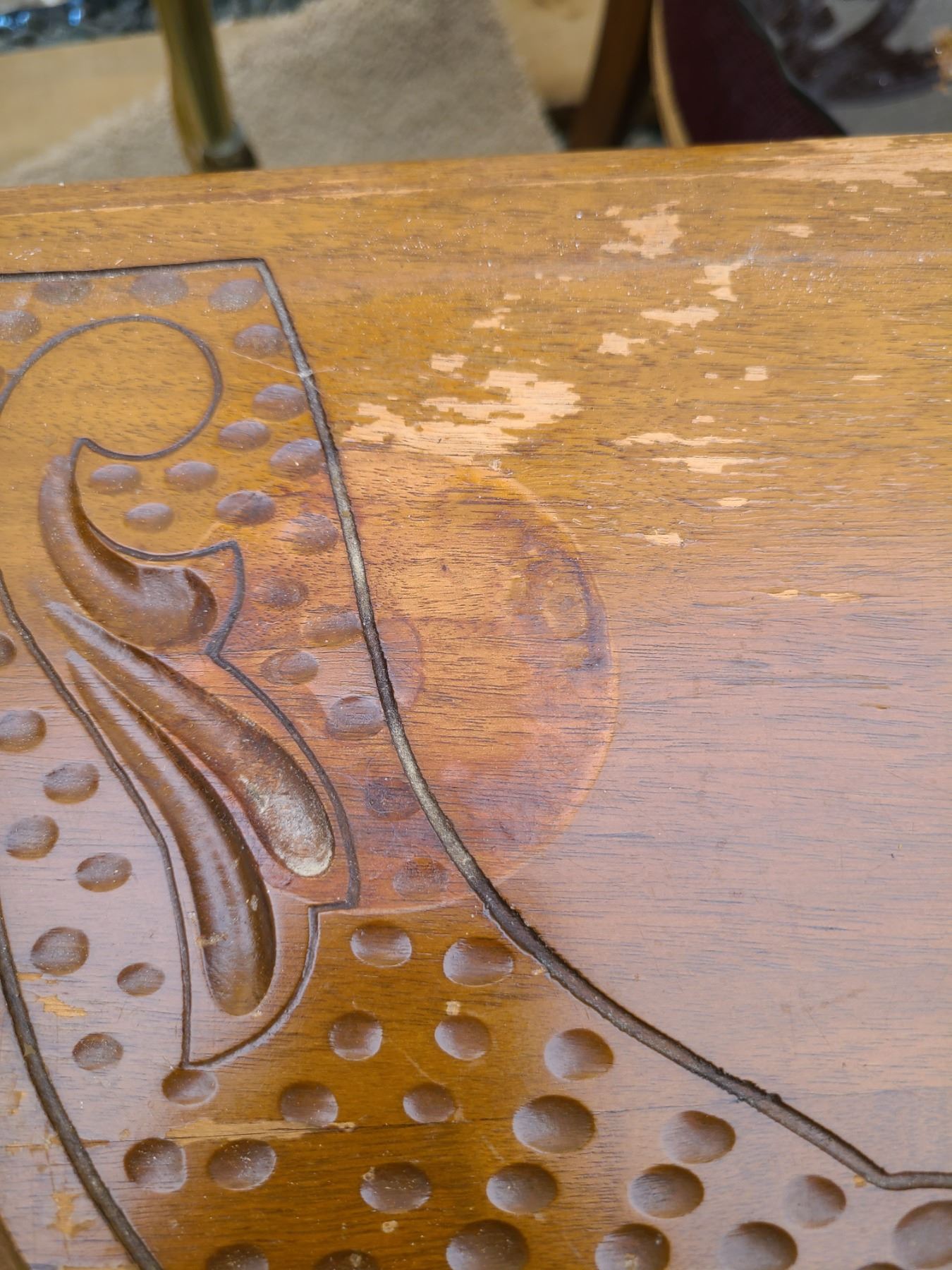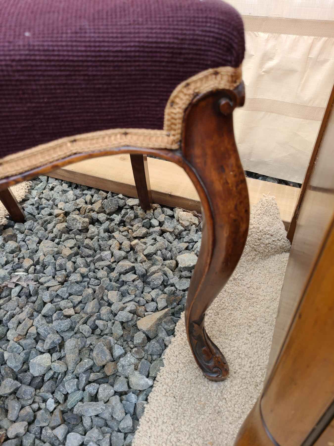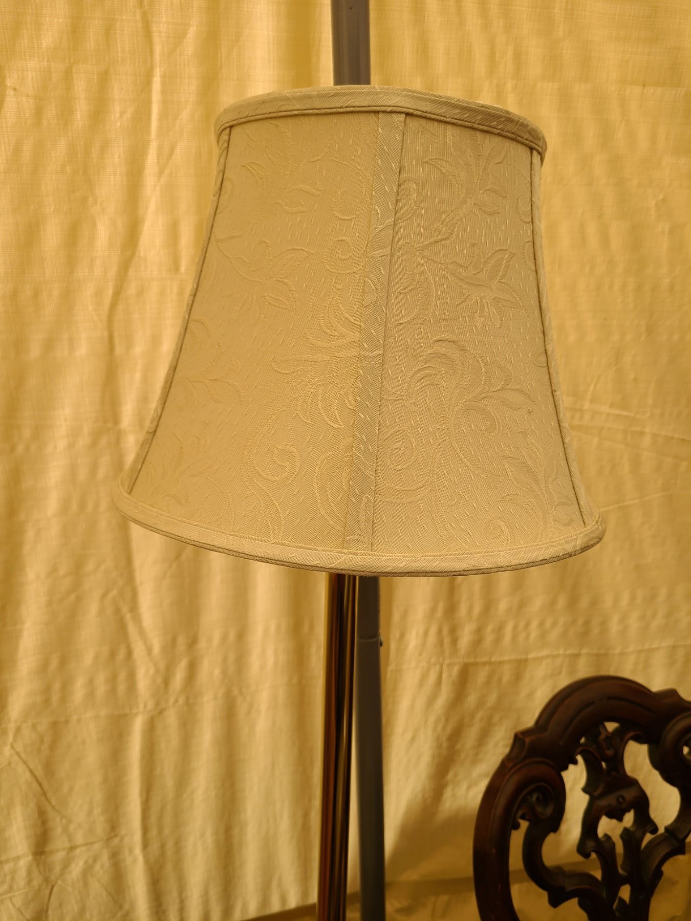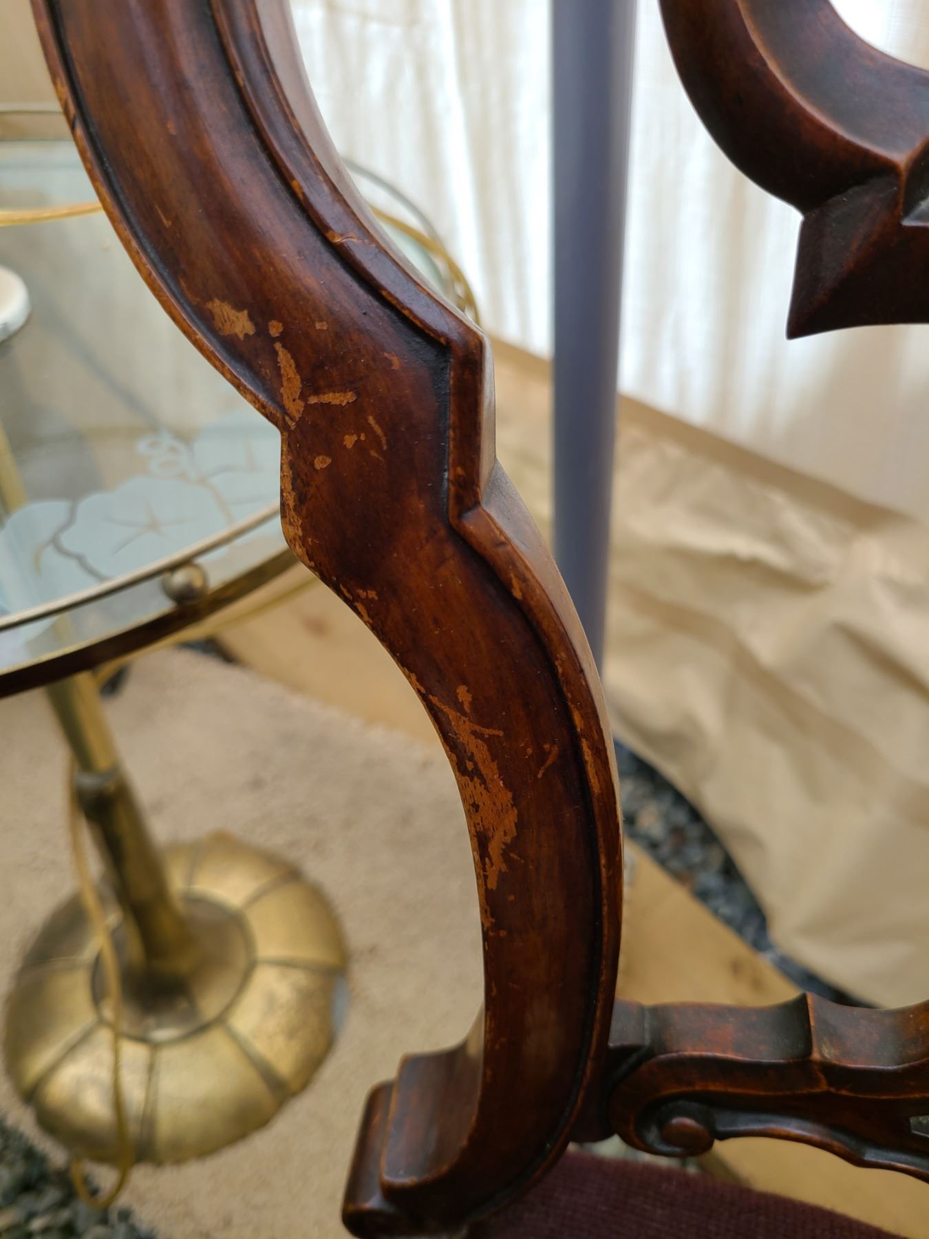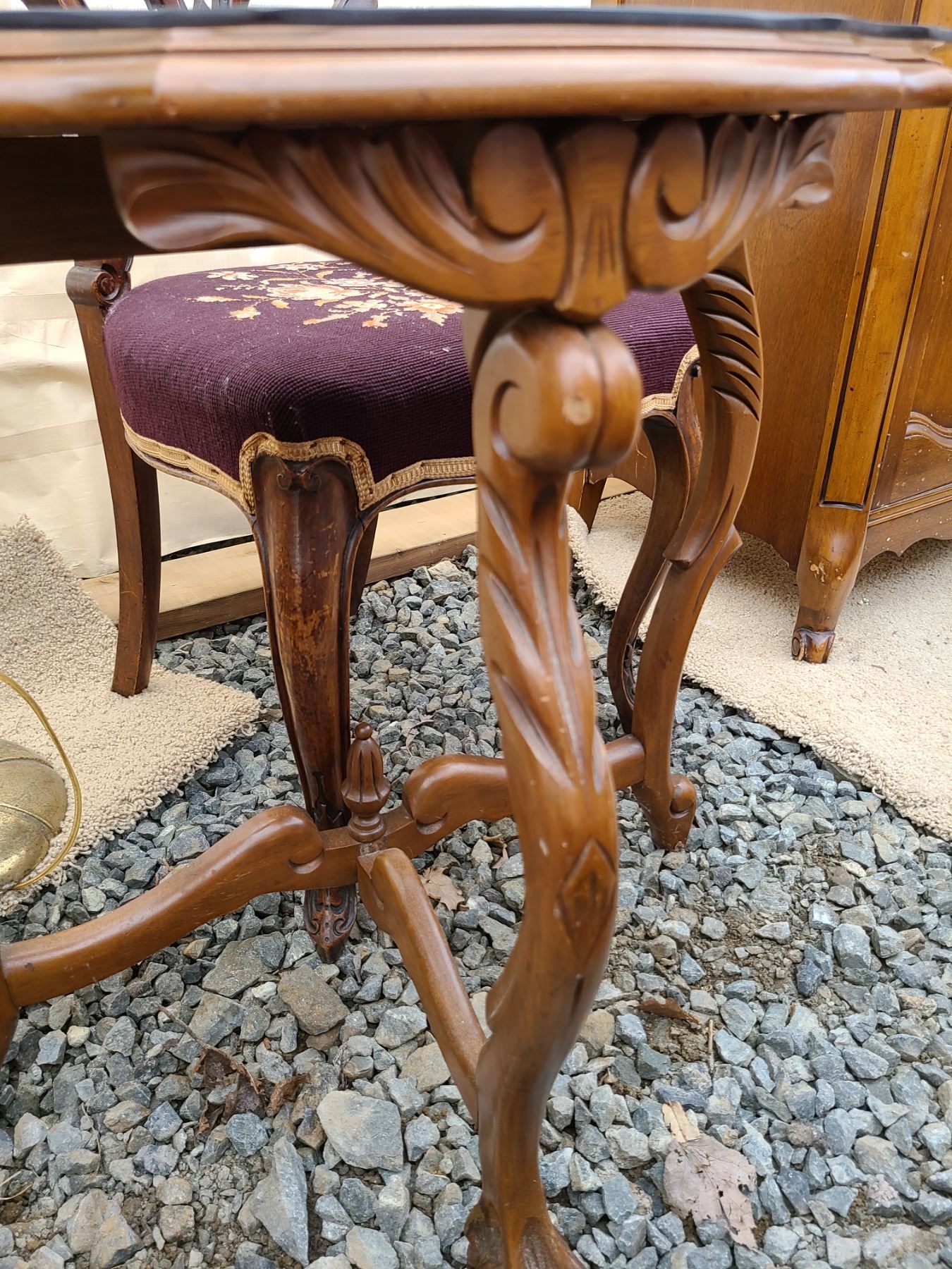 Antique chair with needle point seat 18x17x34, Floor lamp in glass table 16x16x57, half round wall table 24x16x24. Glass top and top of table has glue marks. Note scratches. Pickup 10 am