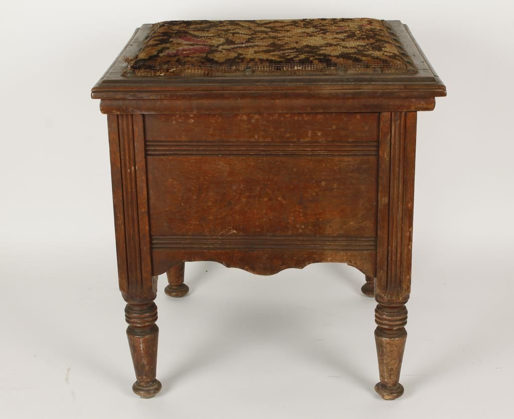 Oak Case, needlepoint floral top, nail head detail, coated tin pot.