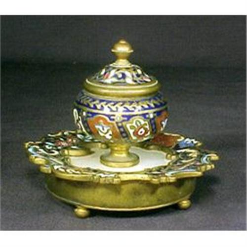 <tr><td>Title:Antique Champleve Inkwell Enamel Brass Jade</td></tr>