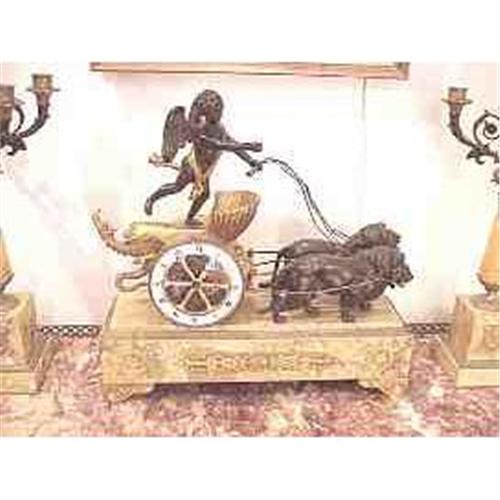 <table width="100%" border="0" cellspacing="0" cellpadding="4"><tr><td><em> </em></td></tr><tr> <td width="100%"> Antique three piece French clock set consisting of a signed French clock inscribed Societe Excelsior. The clock is in the form of a chariot wheel. You can see the clock movement through its front glass cover. The spokes of the chariot wheel are gilt bronze. Above the chariot wheels stands a winged cherub holding reins attached to bits held in the mouths of two male lions that are pulling the chariot. The gilt bronze chariot is further adorned with a lion head holding a gilt bronze bar that supports the gilt bronze ropes that the lions are pulling. The top of the chariot is further adorned with a shell-like structure to its front, a tassel to its back and a fully cast winged long-tailed dragon carving at the back of the chariot. The chariot, cherub and lions are mounted on a Sienna marble base with gilt bronze decoration. The Sienna marble base has gilt bonze feet and very ornate decorative applications on the front. The clock is accompanied with two matching gilt and patinated bronze and Sienna marble five-light candelabras. This is one of the most beautiful and elegant early 19th Century clock sets that we have ever had the pleasure to offer. Superb condition worthy of the finest collection. Height of Clock: 17 1/2 inches Length of Base: 17 1/2 inches Width of Base: 5 1/2 inches Height of Candelabras: 19 1/2 inches Width at Widest Point: 9 1/2 inches Base of Candelabra: 4 1/2 inches by 4 1/2 inches </td></tr><tr> <td> </td></tr><tr> <td>Reference #: 53020</td></tr><tr><td>Condition:Superb</td></tr><tr><td>Year:19th Century</td></tr><tr><td>Title:Antique Cherub 3 Piece Clock Set</td></tr><tr><td>Location:Los Angeles, California</td></tr></table>
