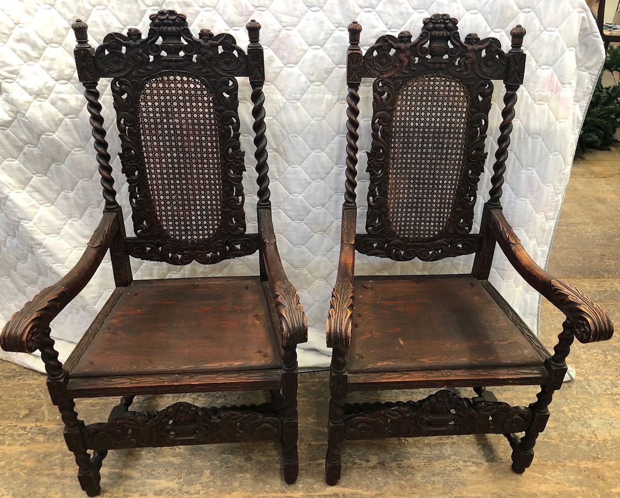 Pair of matching antique angel/cherub carved arm chairs. Heavily carved with angels/cherubs, flowered urns at the top, rope twist sides, basket of flowers and angels/cherubs at base of seats, all caned, one of a kind pair! Measures approx. 4 ft. high at back.