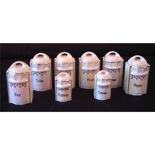 6 large and 2 small canisters, with covers. White lustreware with gold leaf. Marked "Germany"