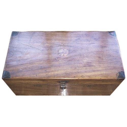 This antique China trade chest dates from circa 1890 and was made from aromatic camphor wood. Recently restored, professionally photographed and imported from India. This form of chest was popular in the 19th century for preserving linens and other delicate items, and this chest was likely used along the Silk Road. It was designed in campaign style with removeable trays and compartments almost like a traveling dresser.