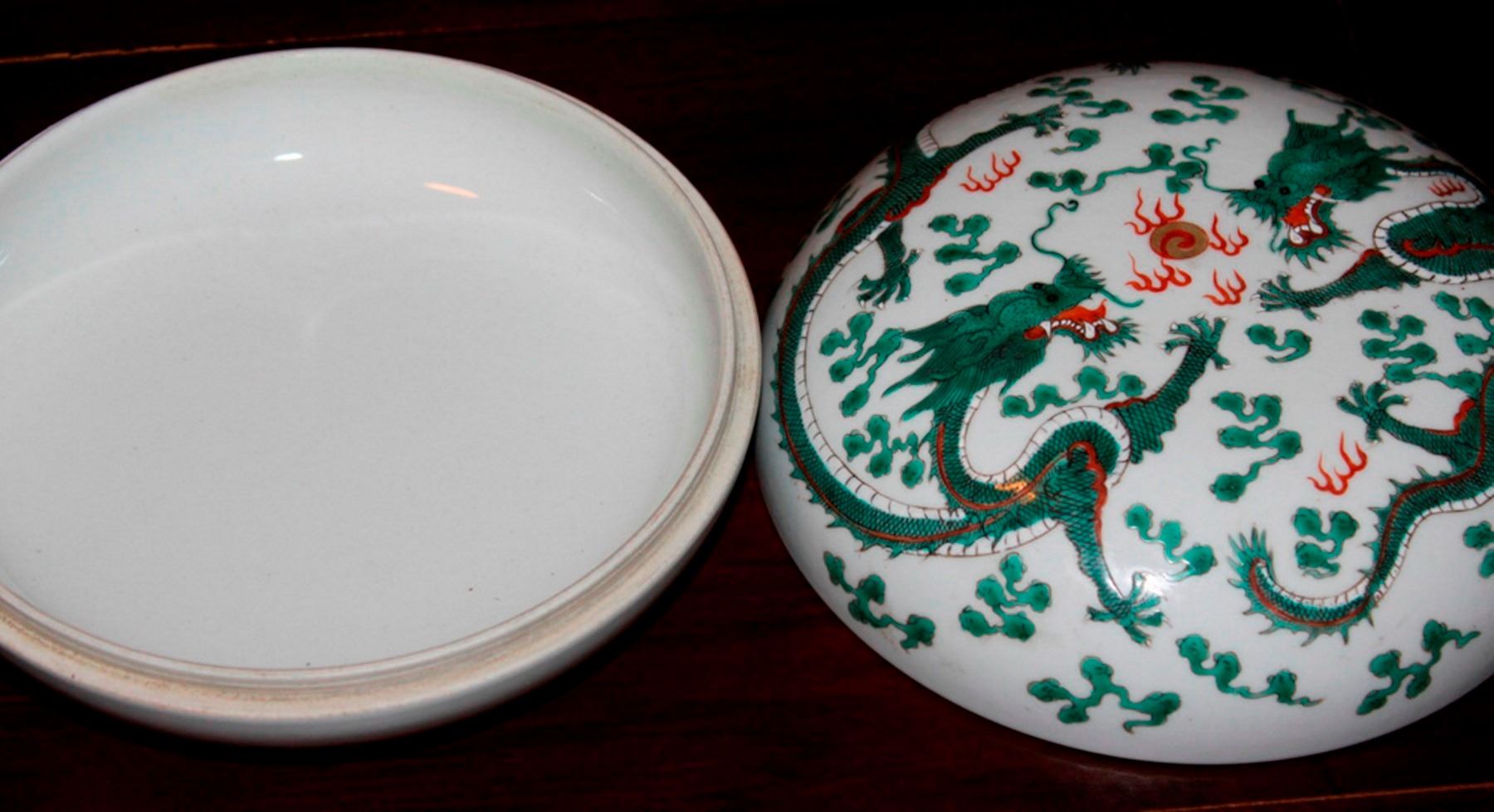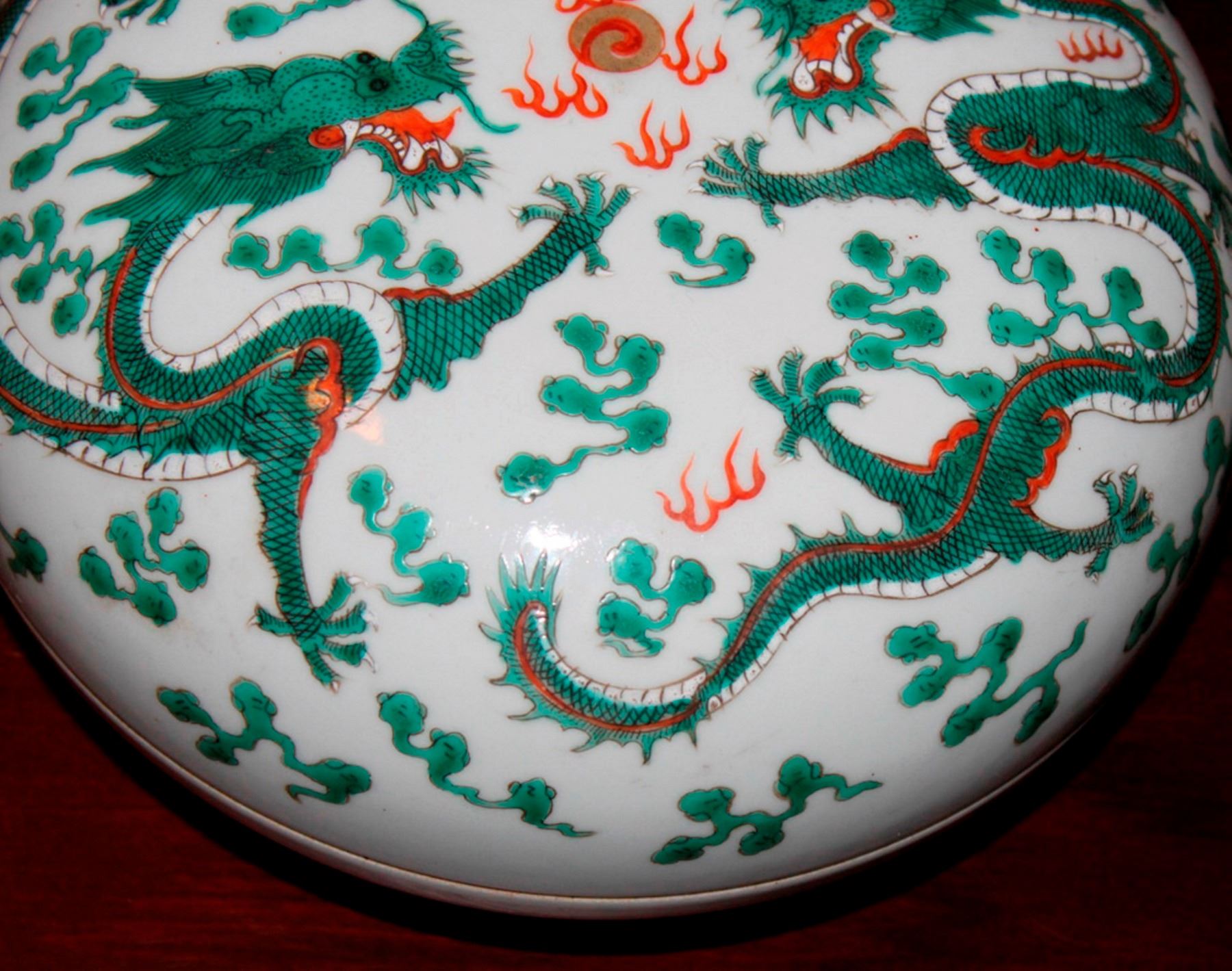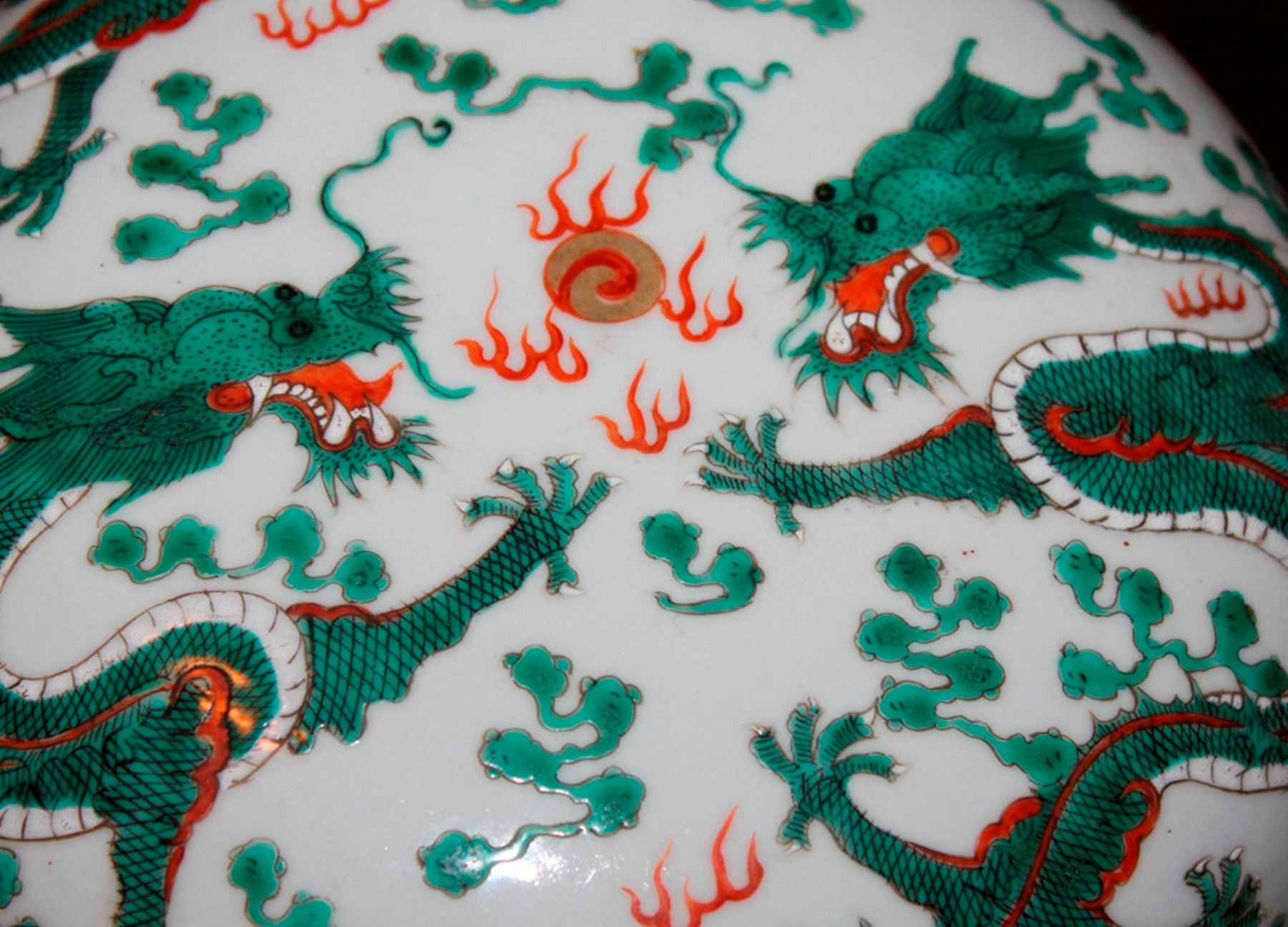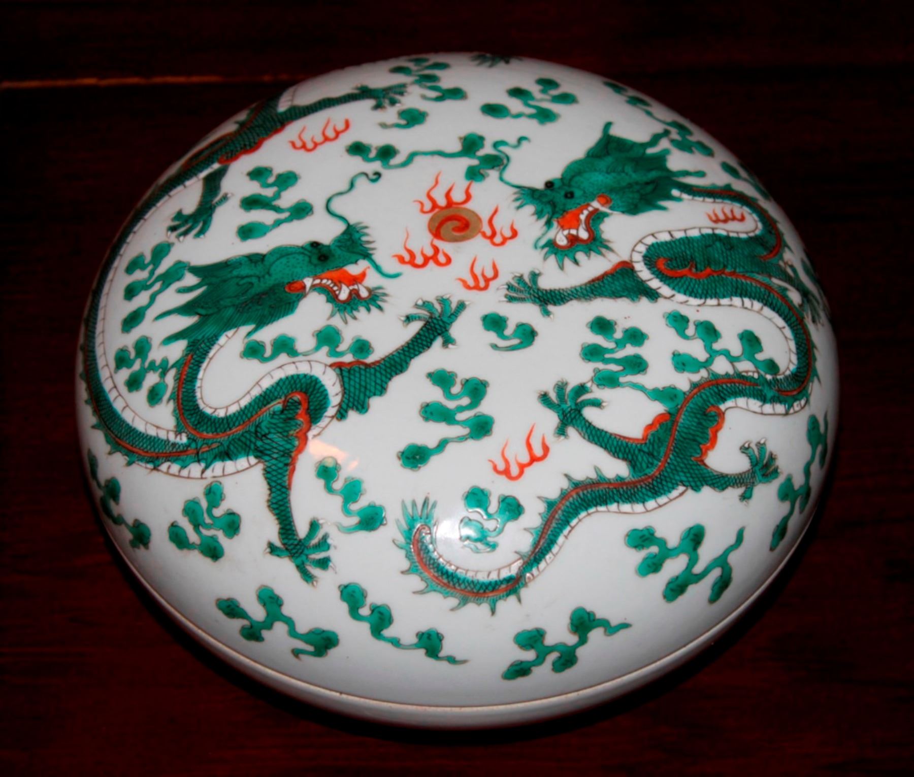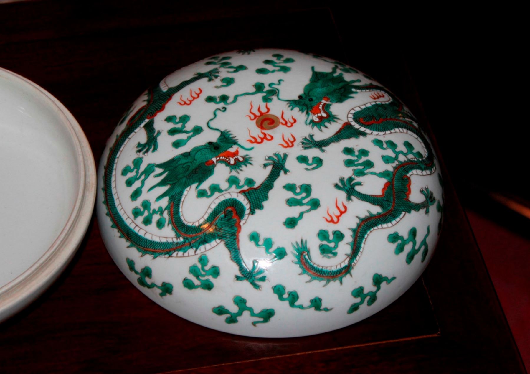 Daoquan mark. Dragon motif. Measures 7" in diameter.