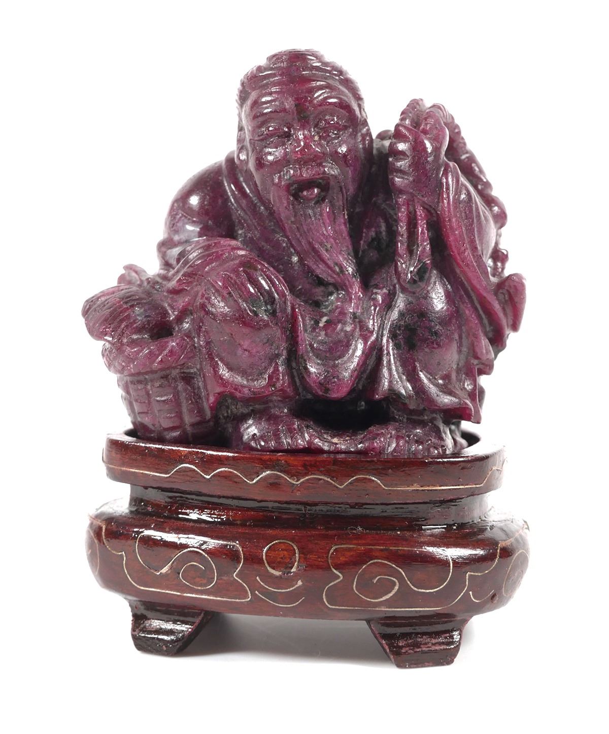 Ruby matrix carved figure of seated man with basket and fish. Measures a little over 2" high (about 3" on stand). Fine condition.