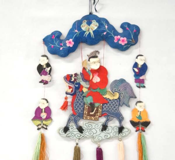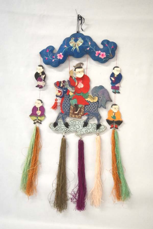 Antique Chinese Embroidered Silk Mobile, depicts man riding Foo Dog, beautiful embroidery work, measures 20'' x 10''
