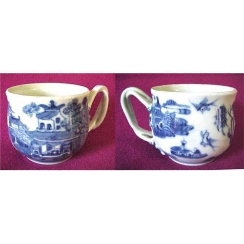 Antique Chinese Export porcelain Nanking syllabub or custard cup or pot de creme. Single Chinese Export antique porcelain cup with fine quality Nanking painting in rich blue color. Nanking scene includes two Bluebirds of Happiness. This blue and white porcelain cup has twisted and ribbed two-strap handle with four molded leaf terminals. Ca. 1820-40. 2-1/4 in.H. Chinese Export porcelain in perfect condition direct from private estate (light glare causes some white spots - no repairs, no damage). Nanking pattern is very close to the Canton version and this cup fits well into a collection of either version. Custard cups are not easy to find. If desired, a not-original cover is available at no extra cost.