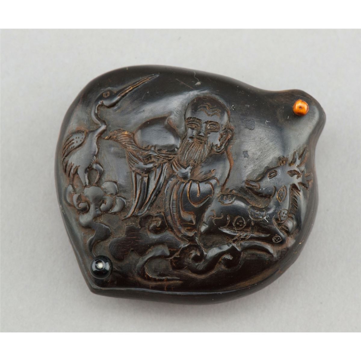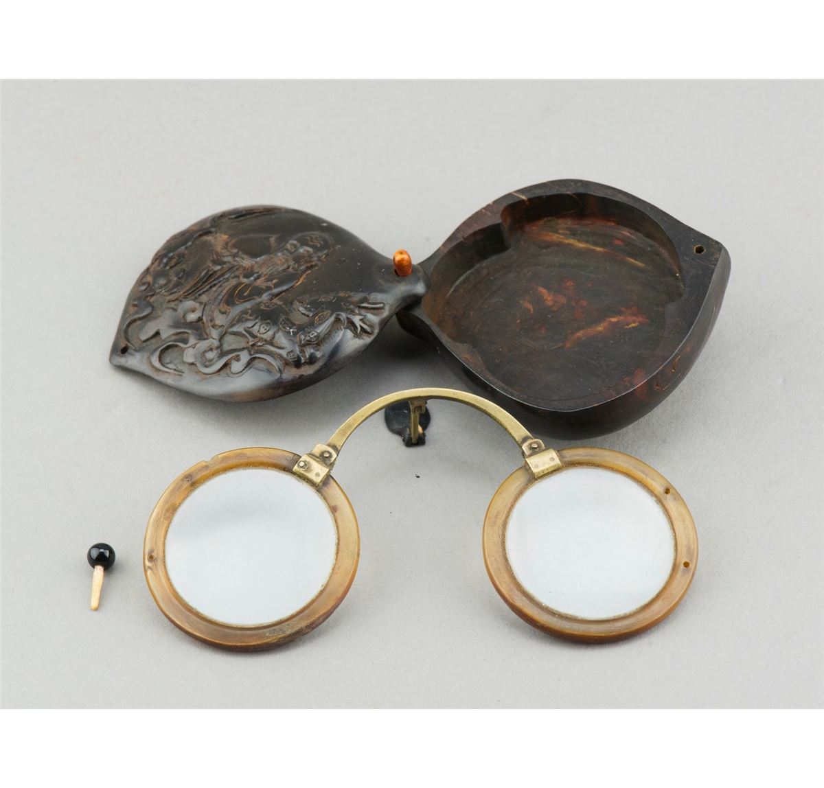 Antique Chinese horn carved case with horn framed eyeglasses; L: 13 cm, D: 4 cm, 115 grams