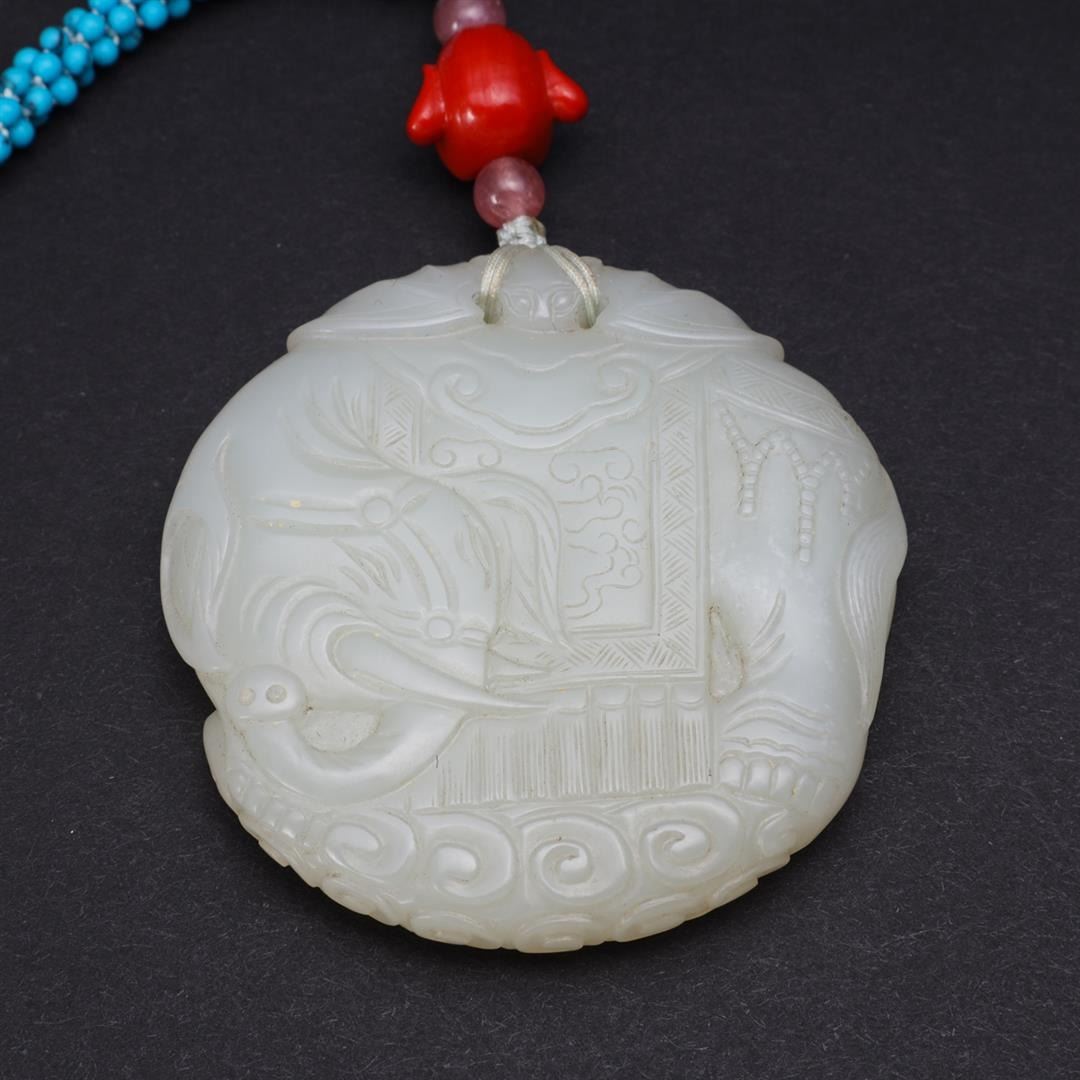 Antique Chinese, Qing Dynasty mutton fat carved Da Xing jade pei of elephant design, mounted on later turquoise bead necklace with pink tourmaline beads and glass Buddha head accents; gross weight 69.7g, the pendant 2" x 2 1/8", the necklace L 24" (approx