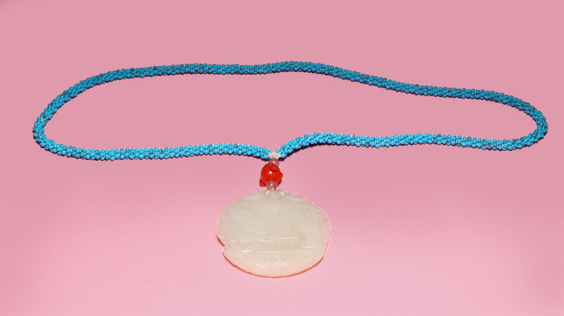 Antique Chinese, Qing Dynasty mutton fat carved Da Xing jade pei of elephant design, mounted on later turquoise bead necklace with pink tourmaline beads and glass Buddha head accents; gross weight 69.7g, the pendant 2" x 2 1/8", the necklace L 24" (approx