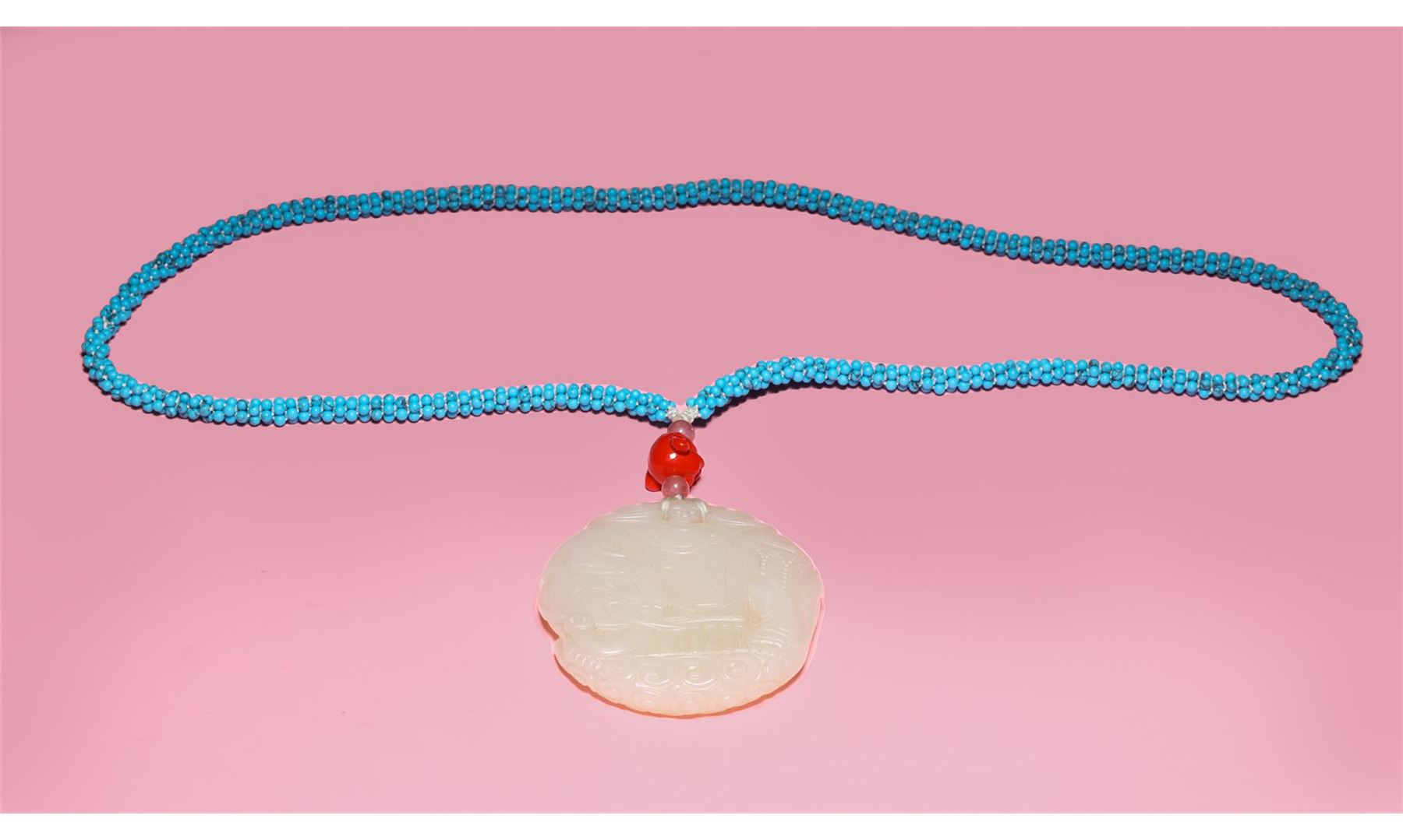 Antique Chinese, Qing Dynasty mutton fat carved Da Xing jade pei of elephant design, mounted on later turquoise bead necklace with pink tourmaline beads and glass Buddha head accents; gross weight 69.7g, the pendant 2" x 2 1/8", the necklace L 24" (approx